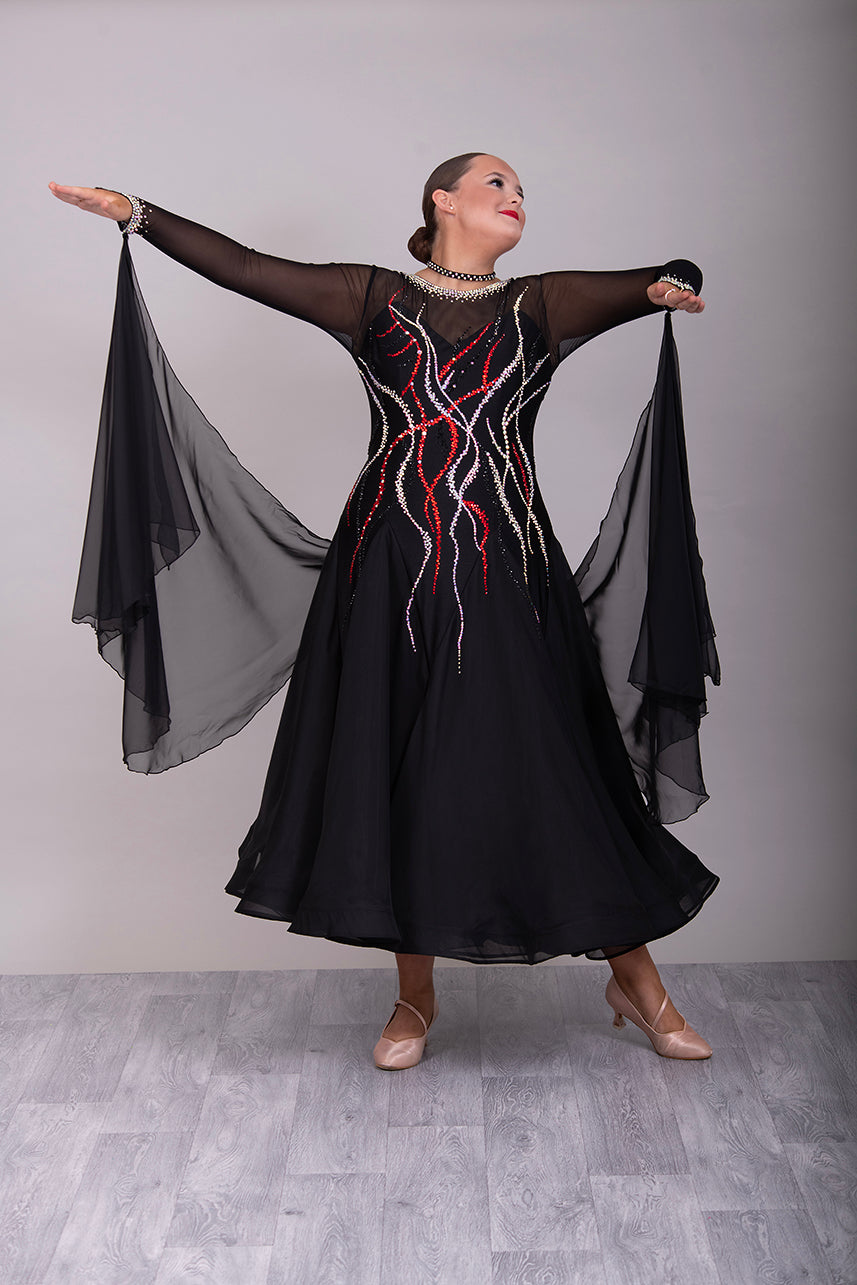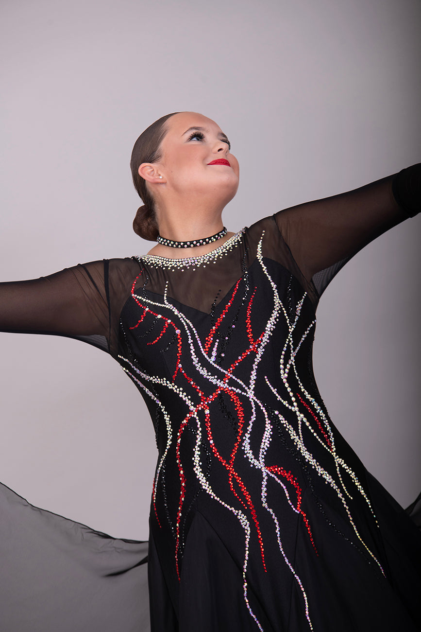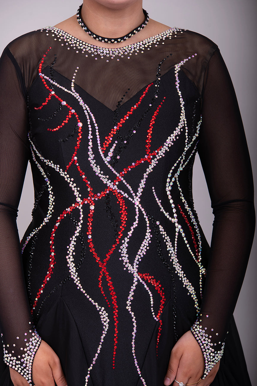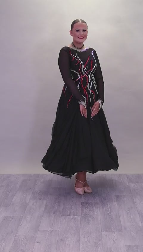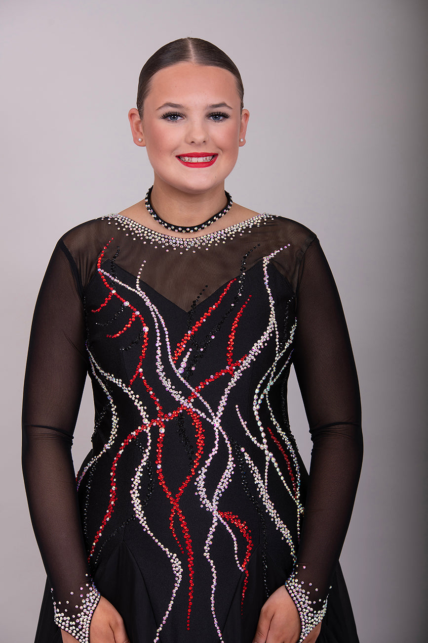 09B Black Ballroom/Sequence Competition Dance Dress. Stoned in Black, AB & Siam. Flesh Lycra under black mesh to Back & upper chest to allow option of wearing own Bra