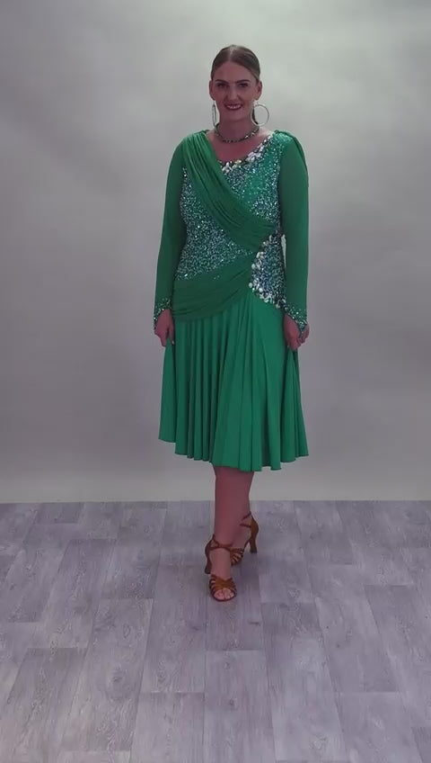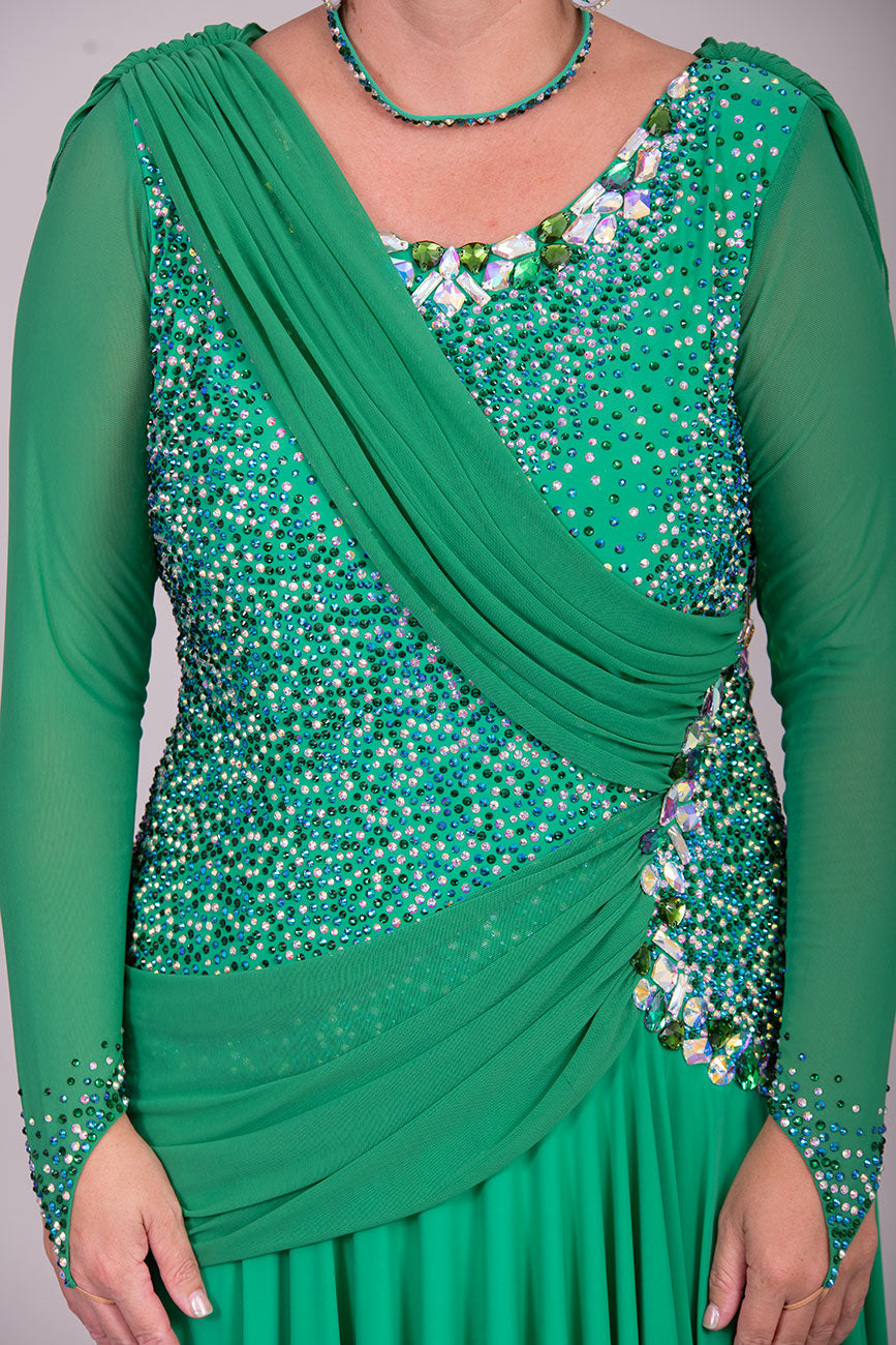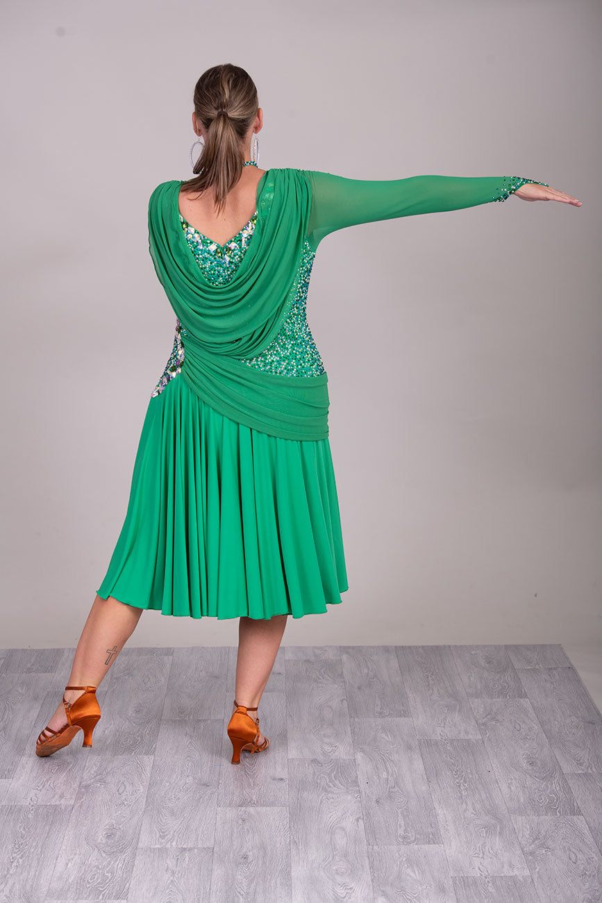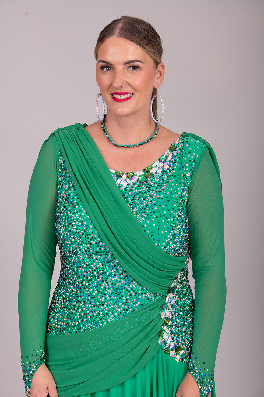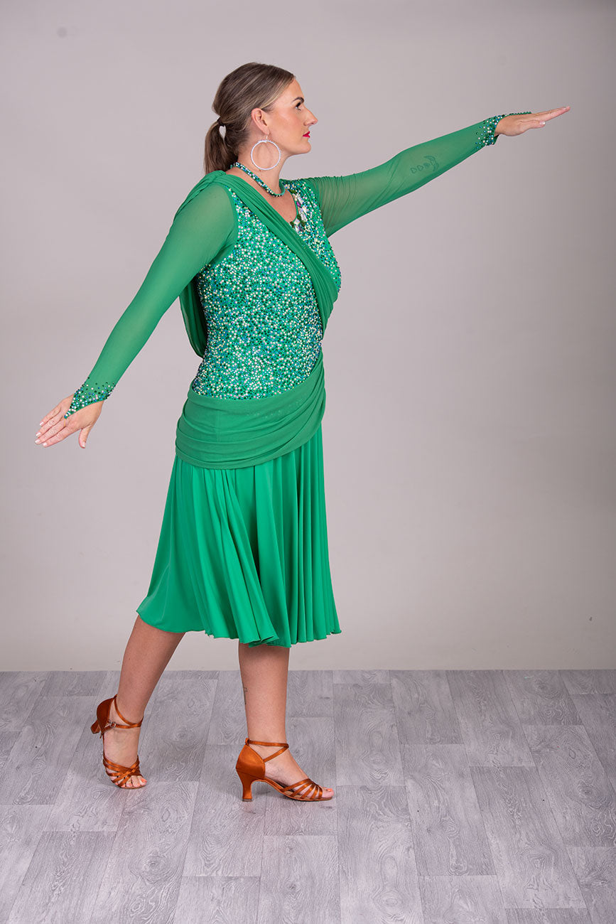115L Emerald Green Competition Latin Dance Dress. Stunning dense stoning in AB, Emerald & Emerald AB. Sash details to the chest & Hip. High Back to give option of wearing own bra