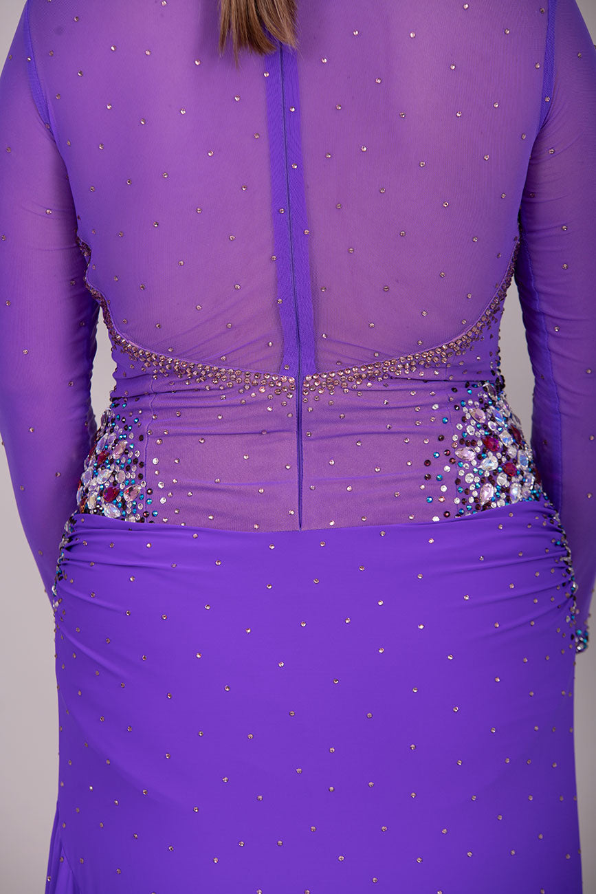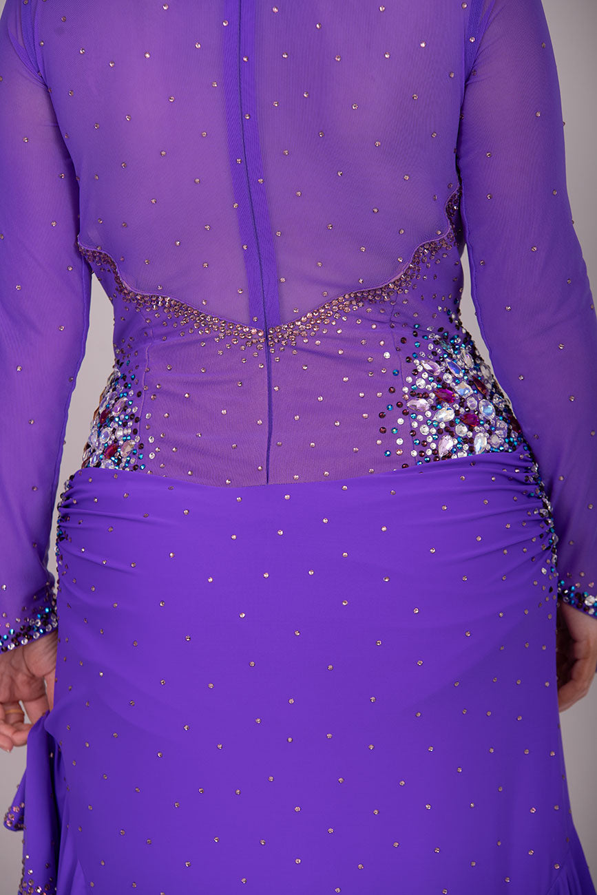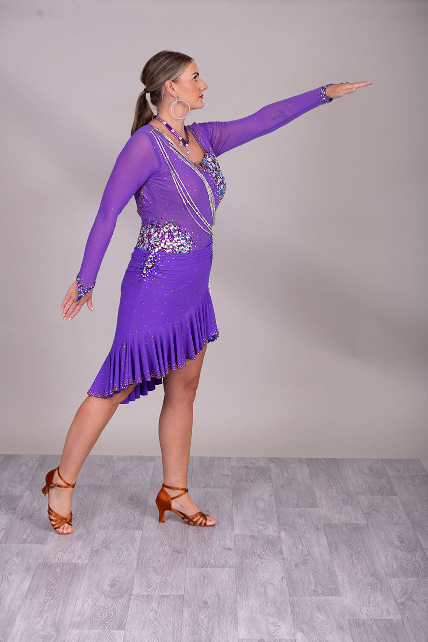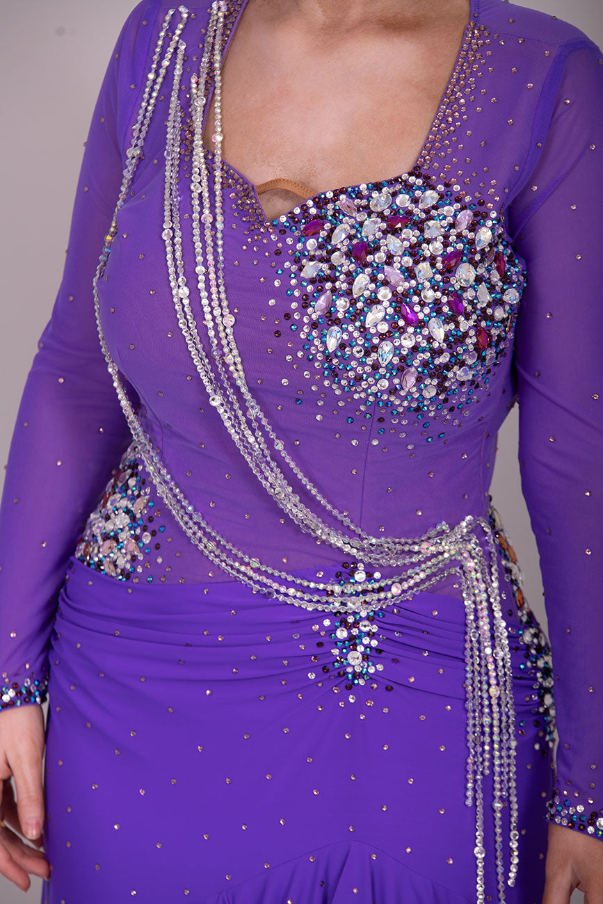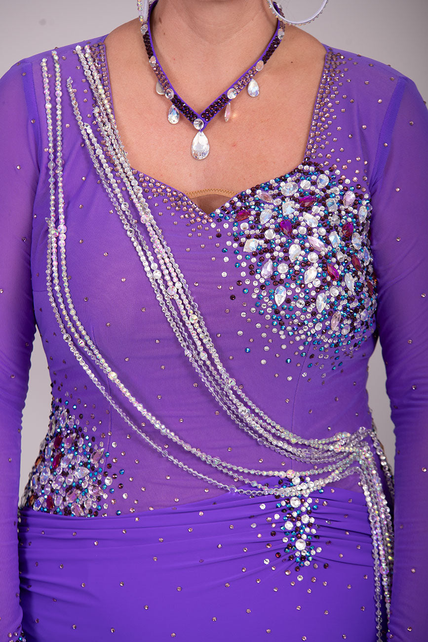 116L Stand Out Purple Competition Latin Dance Dress. Hanging strap detail to the front with stone detail in Purple velvet, AB & light amethyst AB. High Back to give option of wearing own bra
