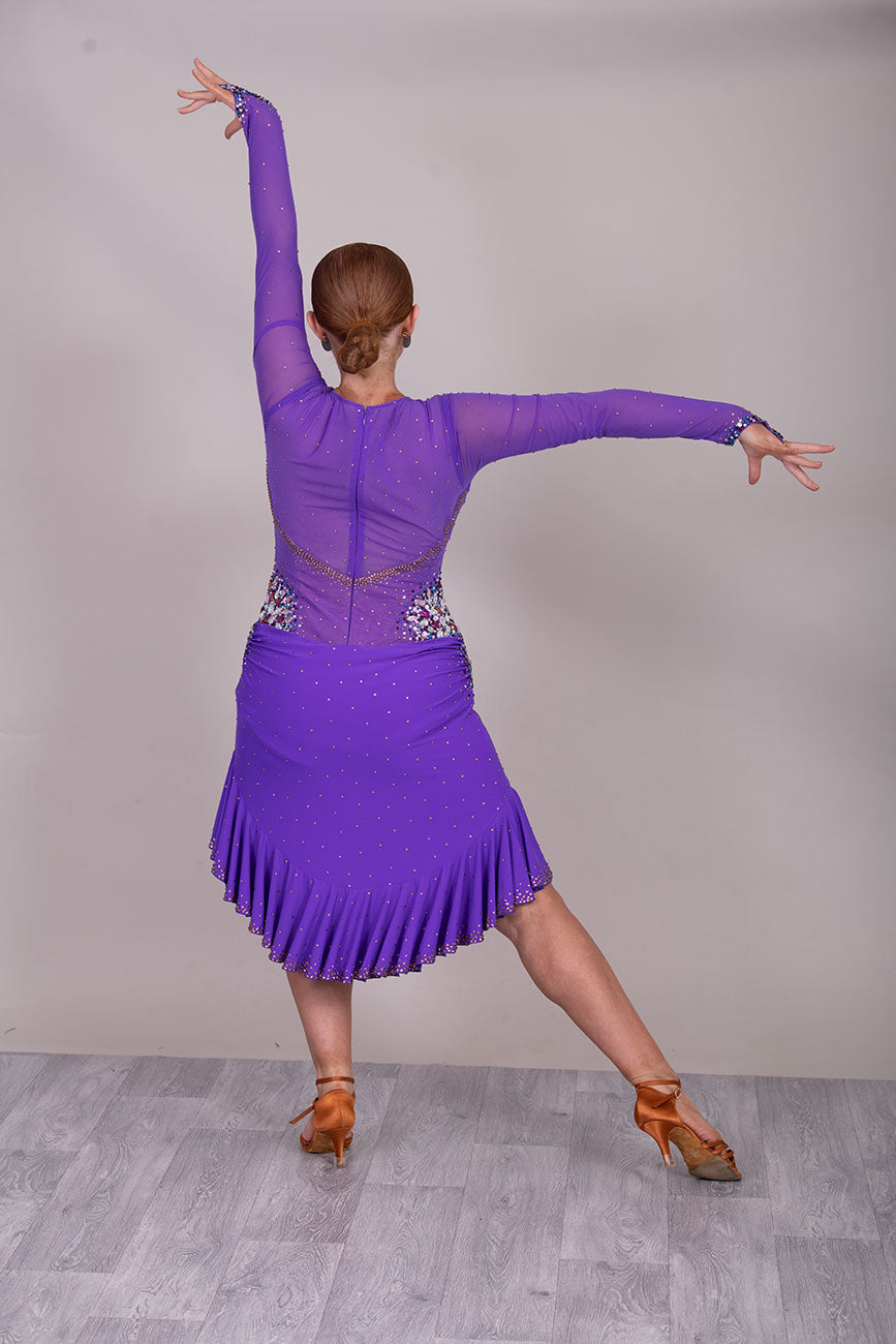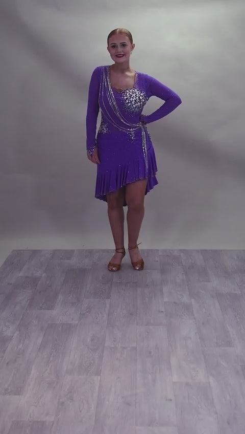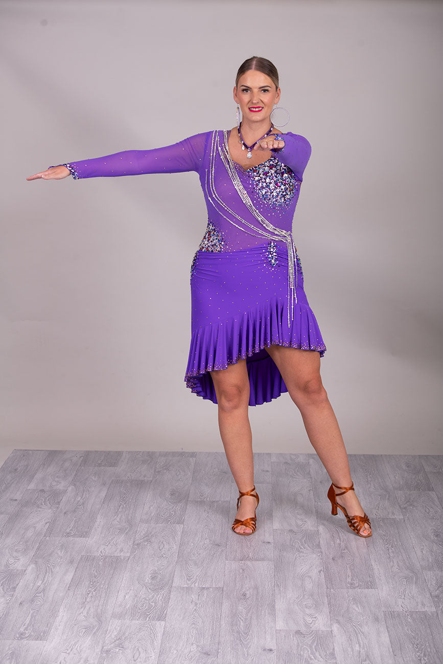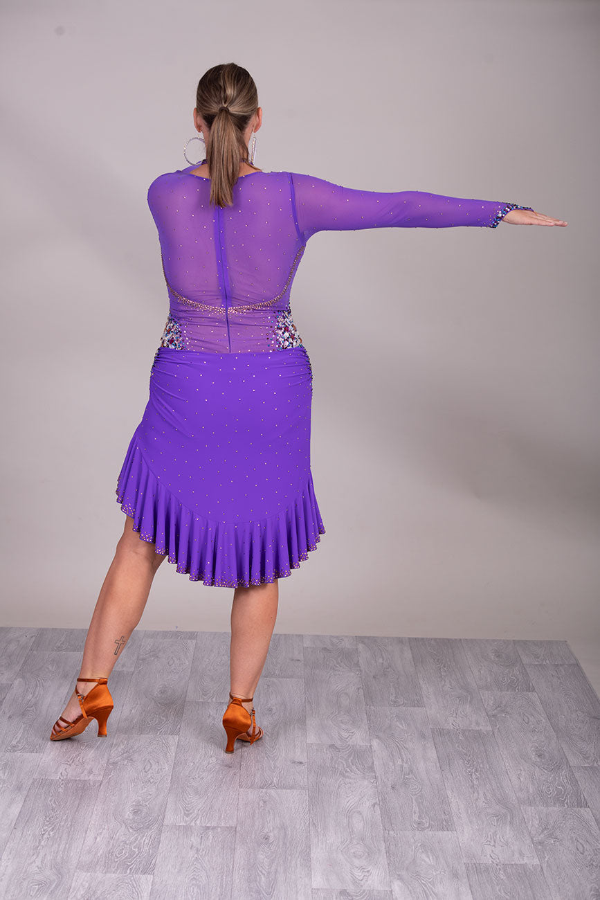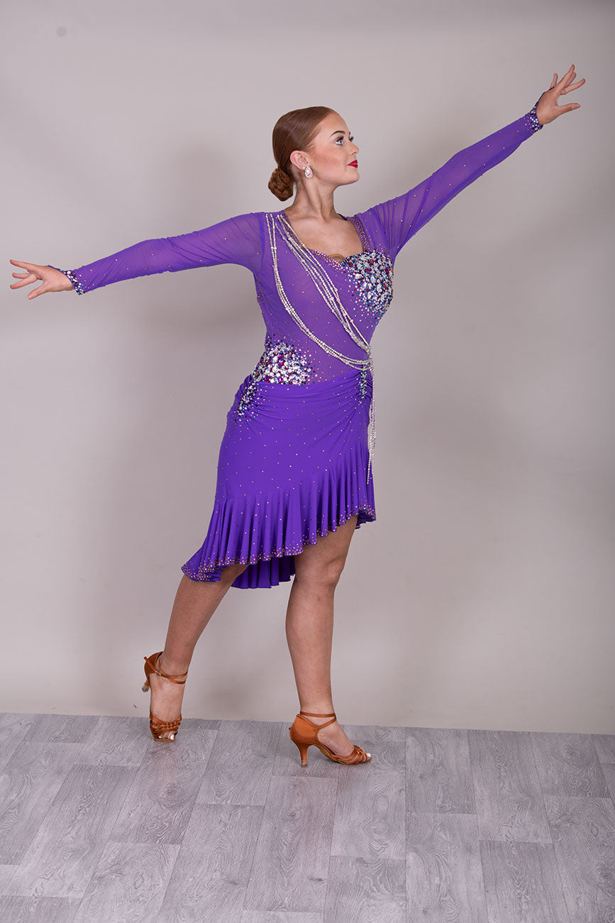 116L Stand Out Purple Competition Latin Dance Dress. Hanging strap detail to the front with stone detail in Purple velvet, AB & light amethyst AB. High Back to give option of wearing own bra