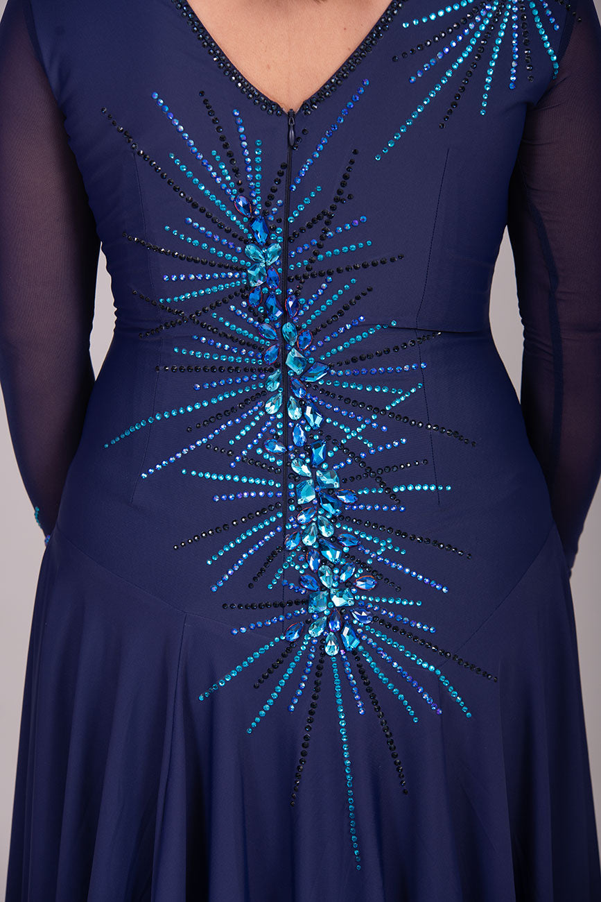 117L Navy Blue Competition Latin Dance Dress. Heavily stoned in Capri blue, Saphire & Capri blue AB. Very full skirts for maximum movement with split to the left side. High back to give option of wearing own Bra