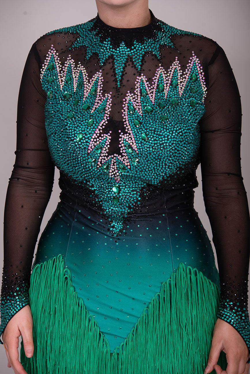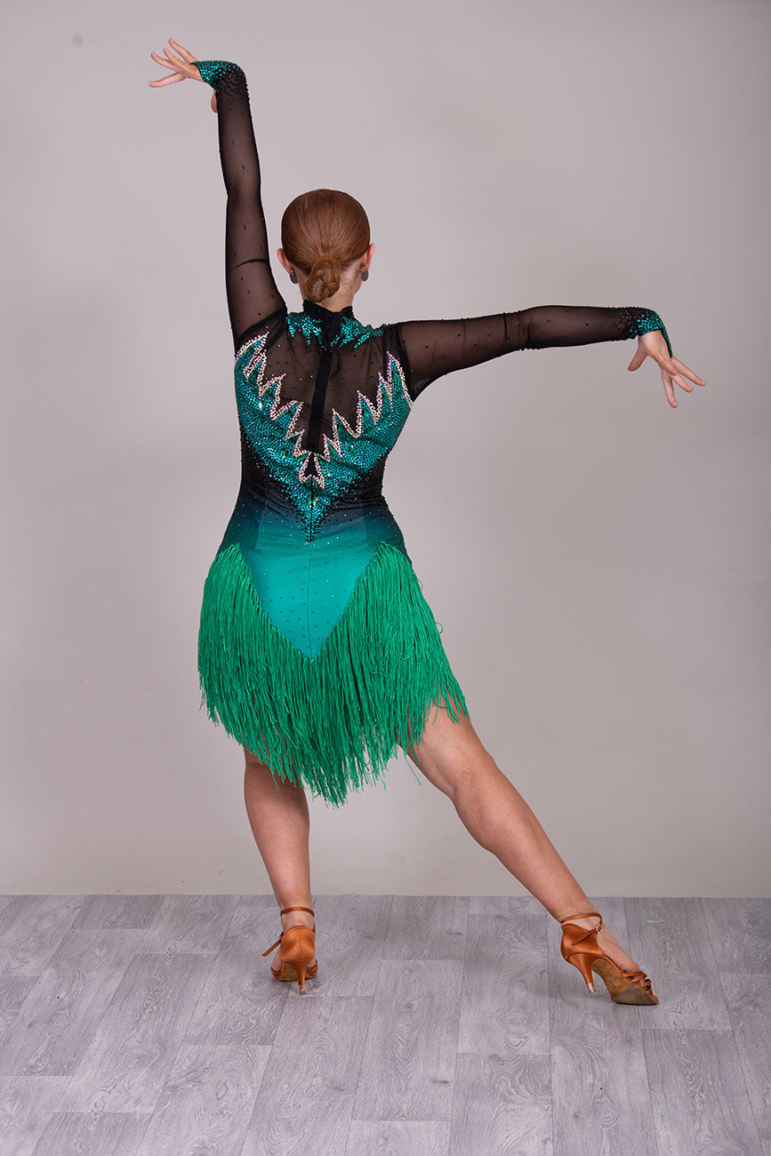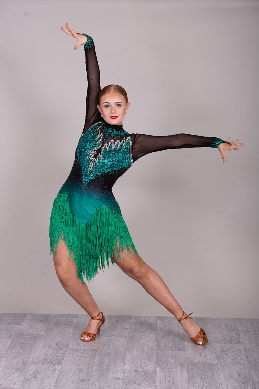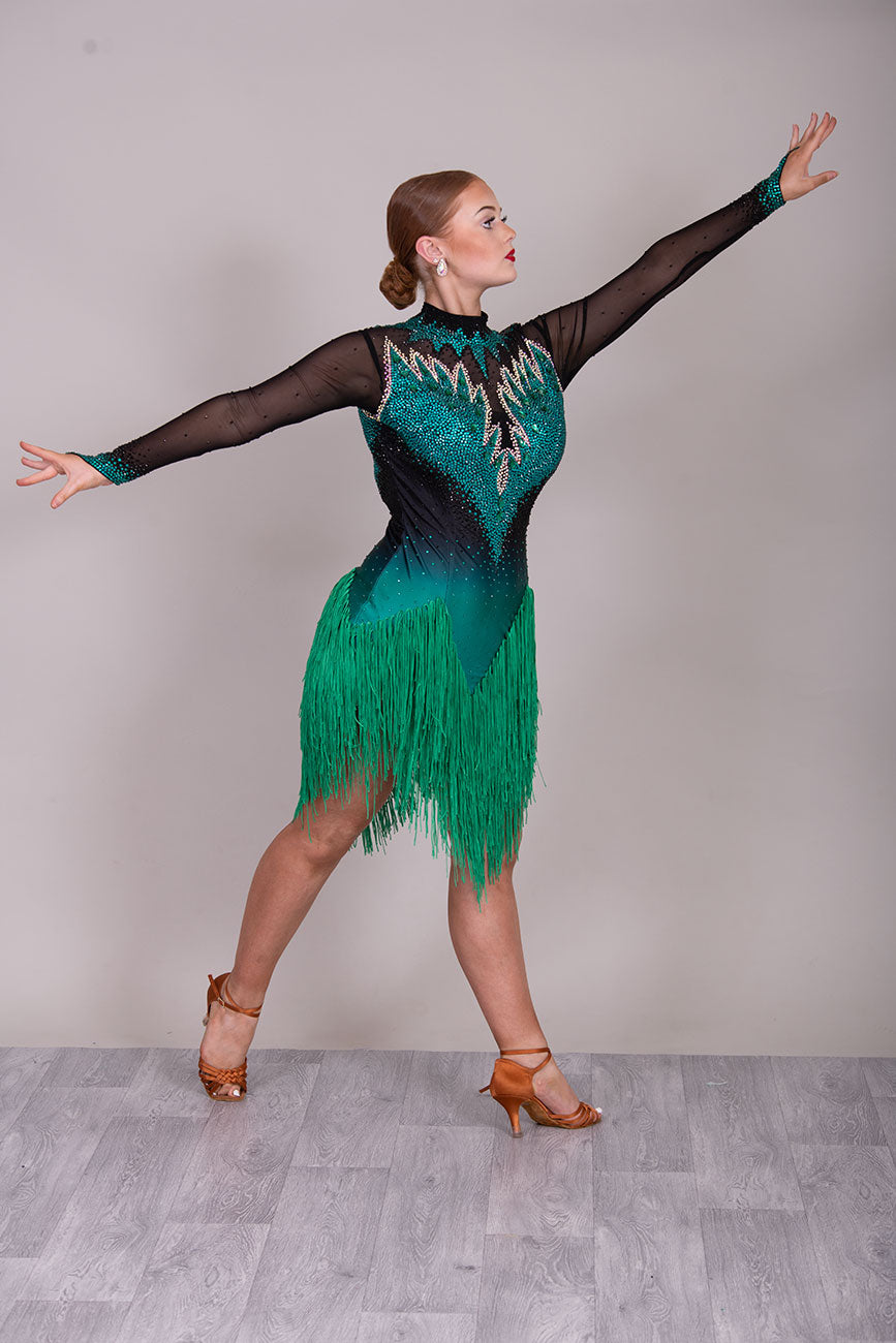 118L TWD ELITE LATIN Competition Latin Dance Dress. Striking Design to front & Back with Ombre Green & Black Lycra Bodice. Full fringed skirts for maximum movement.