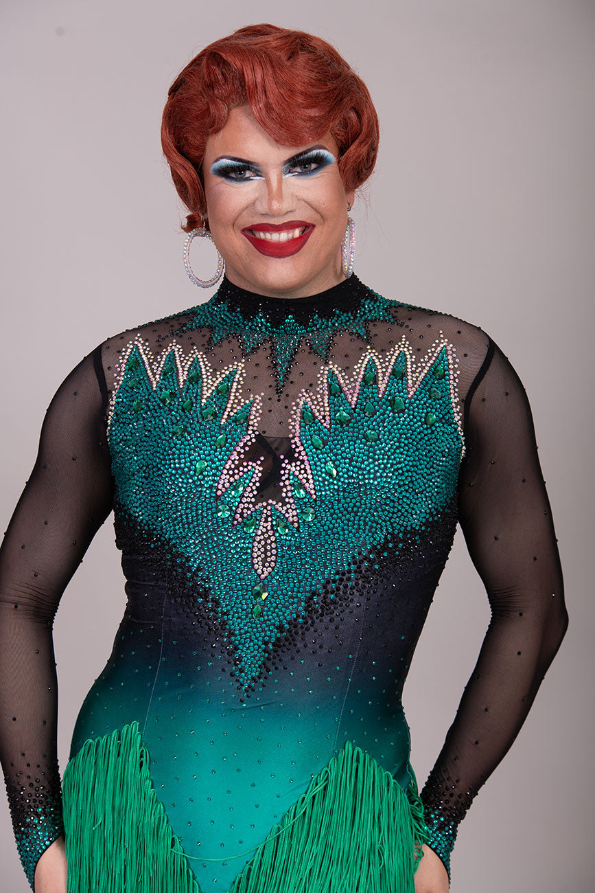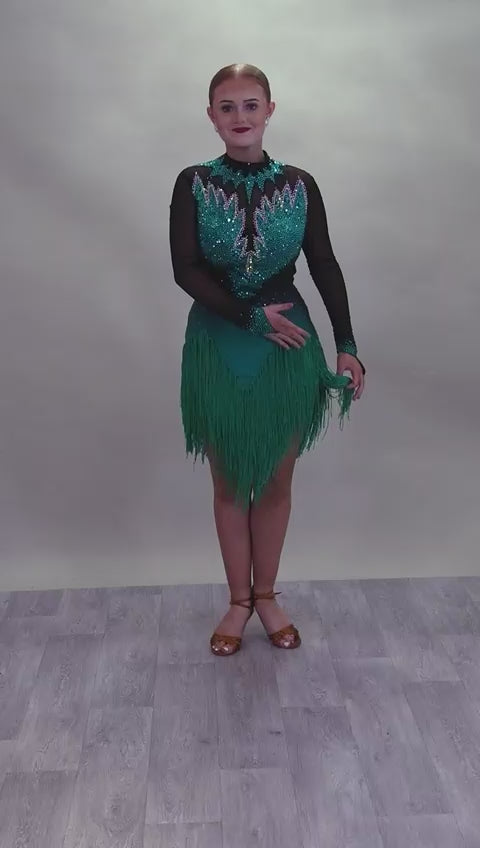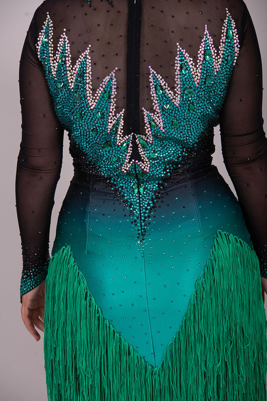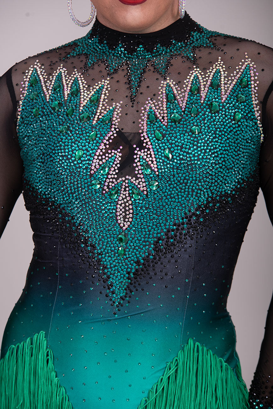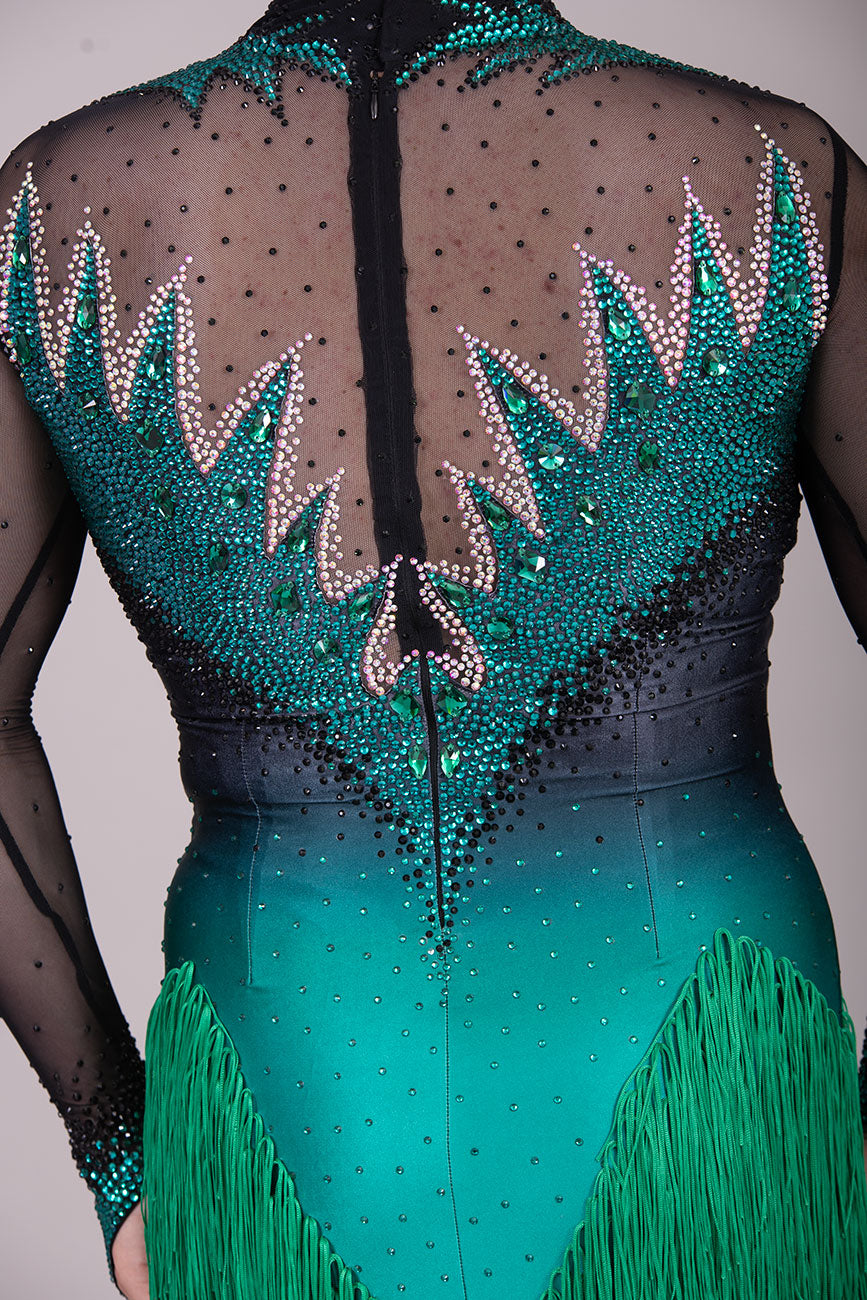 118L TWD ELITE LATIN Competition Latin Dance Dress. Striking Design to front & Back with Ombre Green & Black Lycra Bodice. Full fringed skirts for maximum movement.