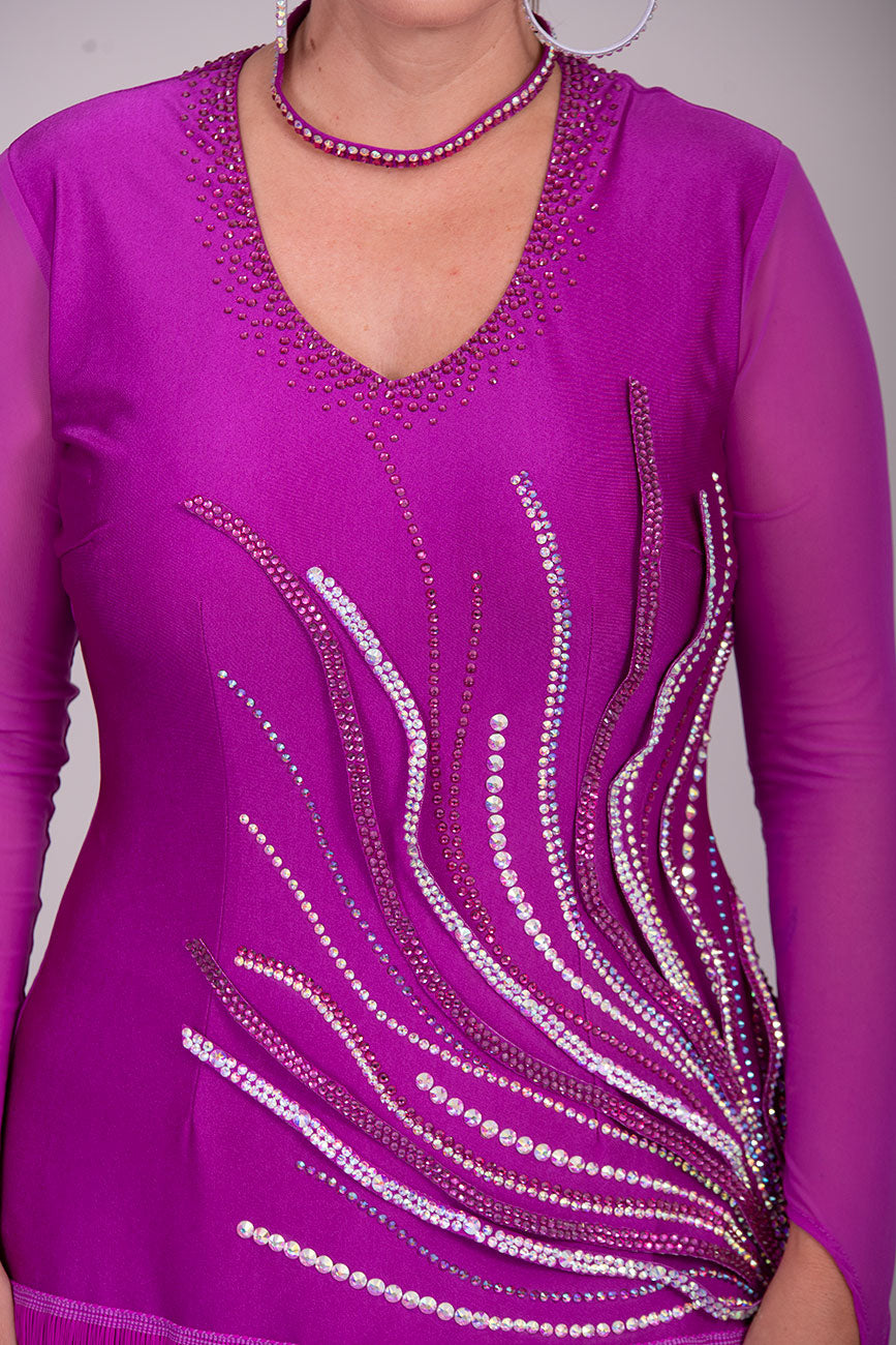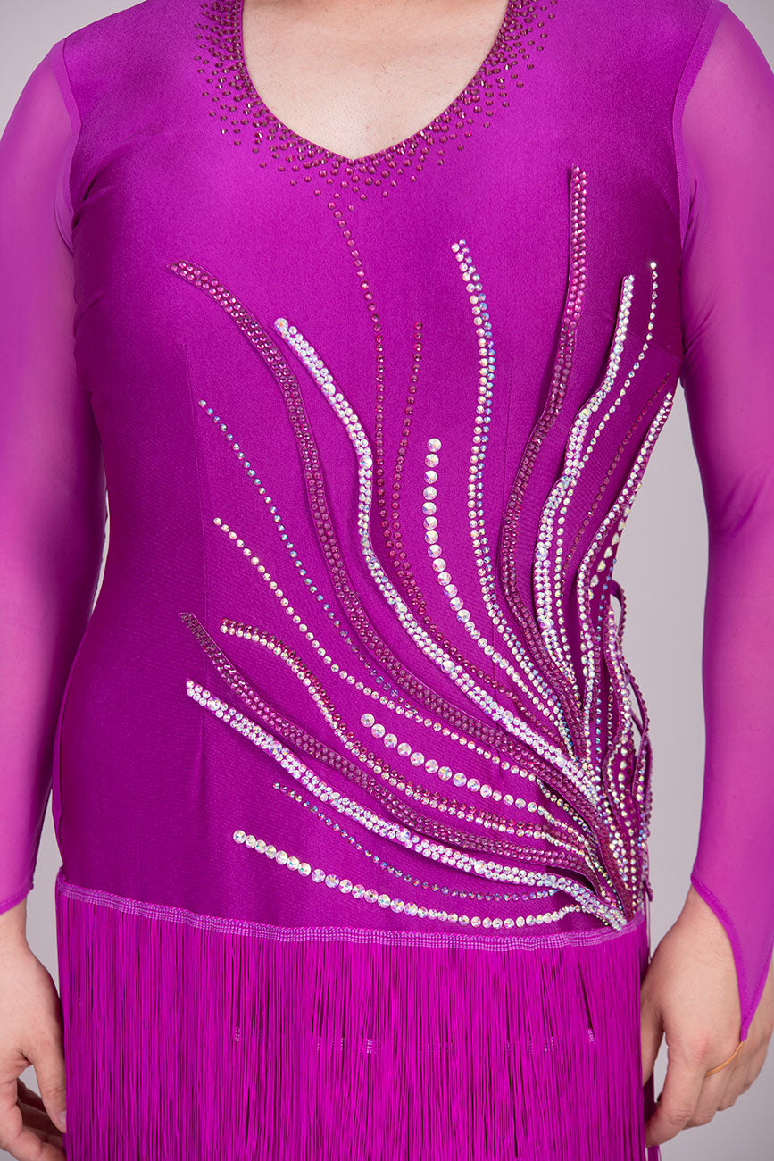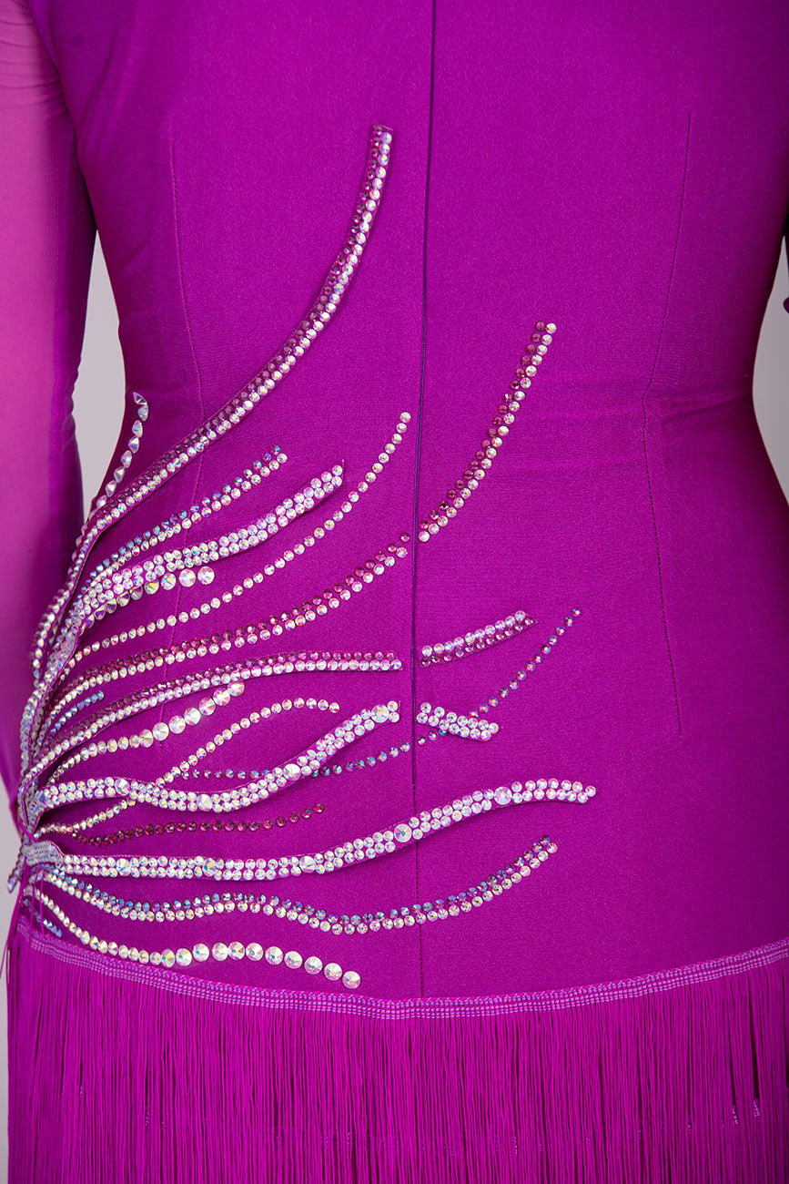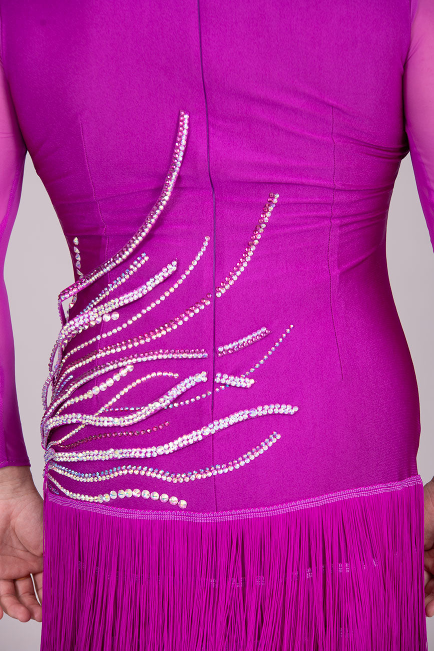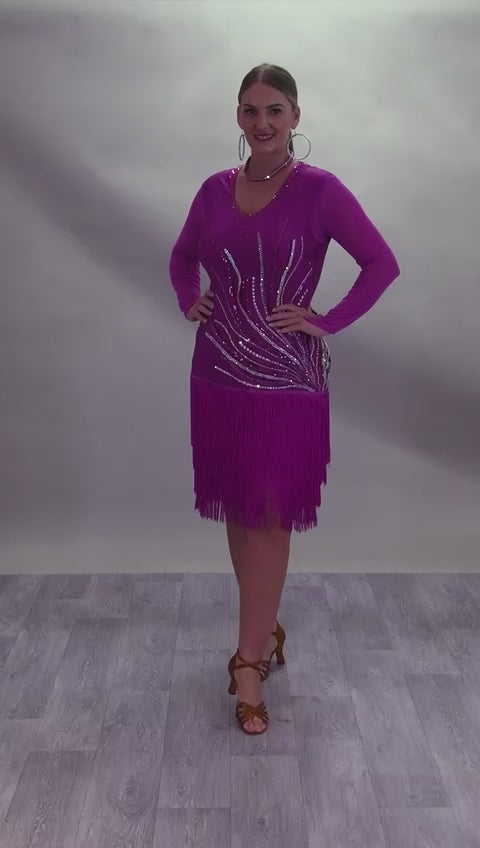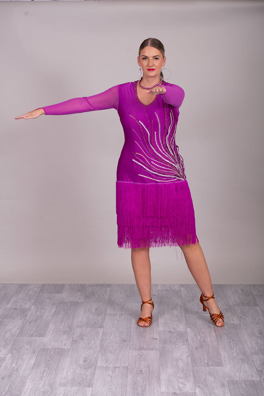 123L Hot Magenta Competition Latin Dance Dress. Flattering Hip Design with full back for option of wearing own Bra & full fringed skirts.