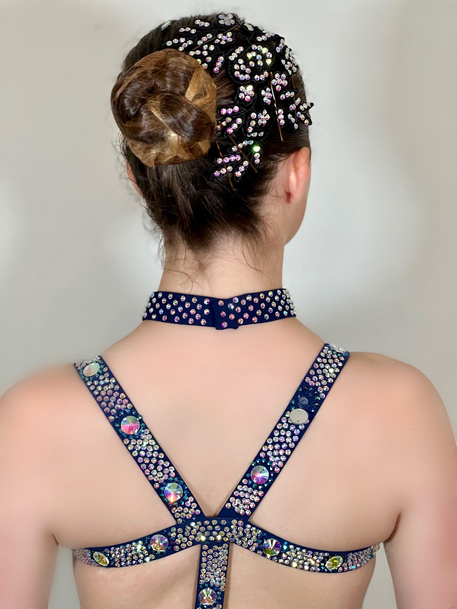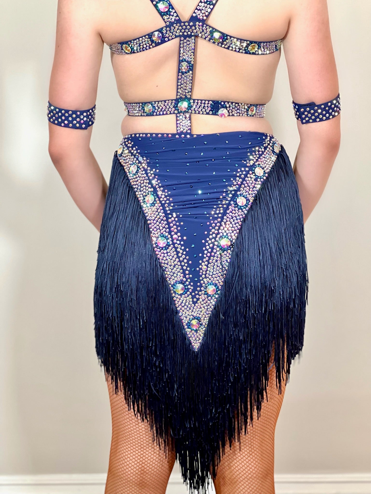 124 Navy Fringed skirt Strappy Back Latin Dress. Flattering design stoned in AB