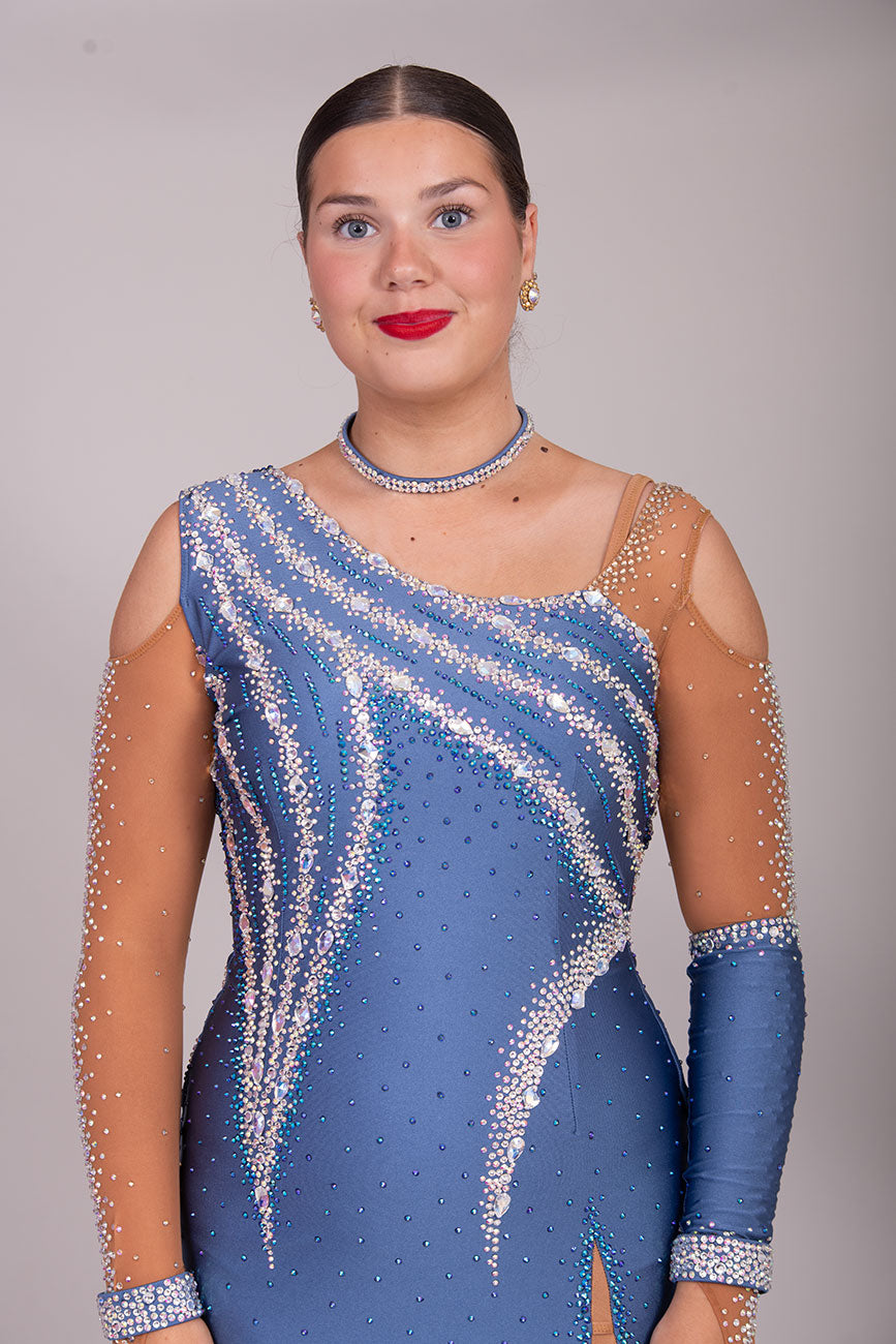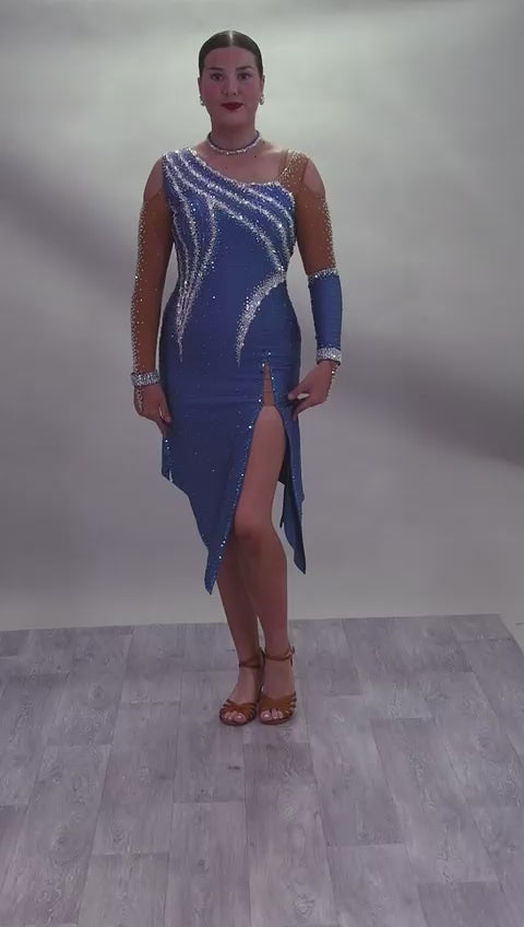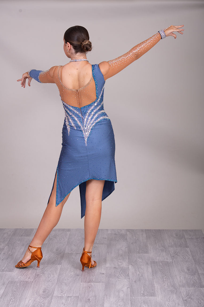 125L Heather Latin Competition Dance Dress. High Back allowing option to wear own Bra. Heather Colour Dress with Cold shoulder sleeves with heavy stoning details. Side splits for maximum leg movement. Showroom Appointment Available