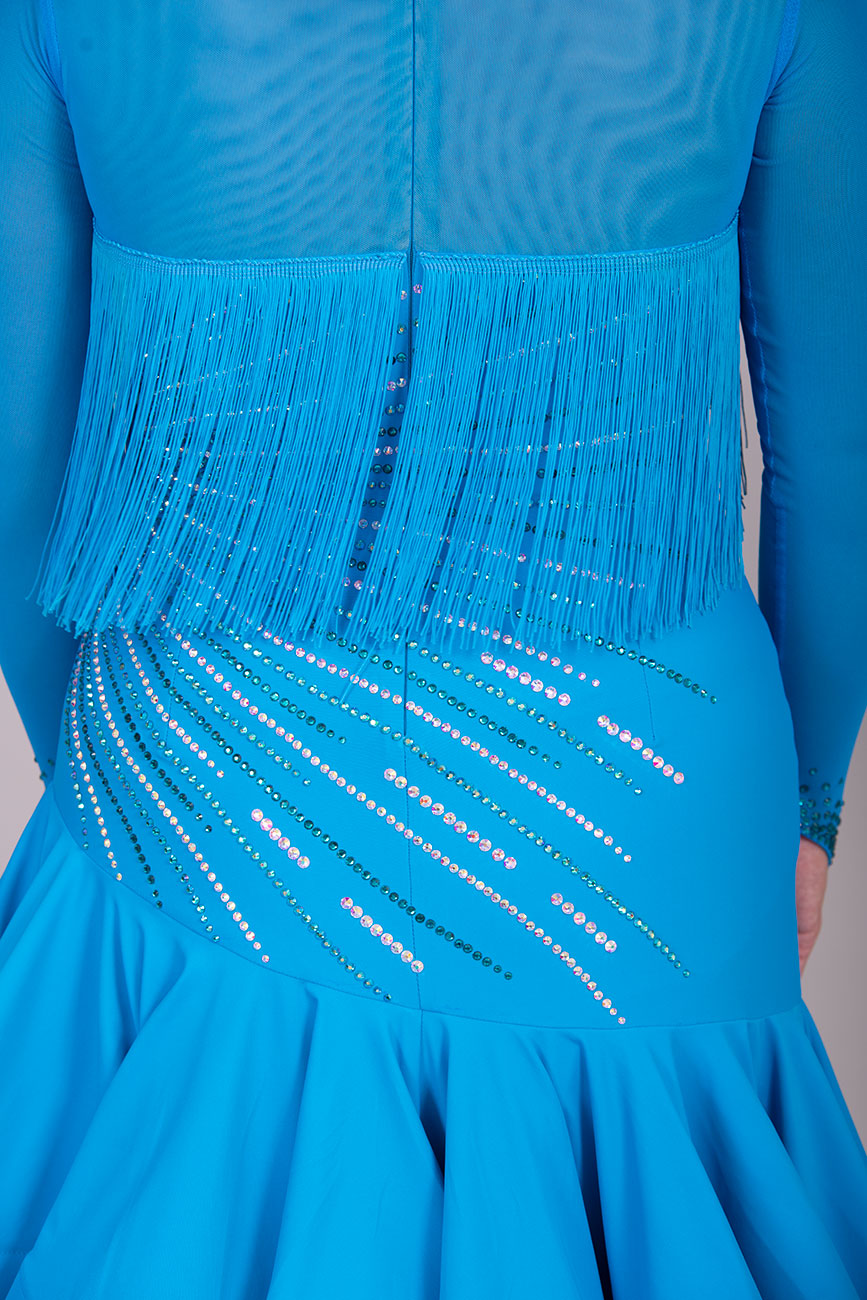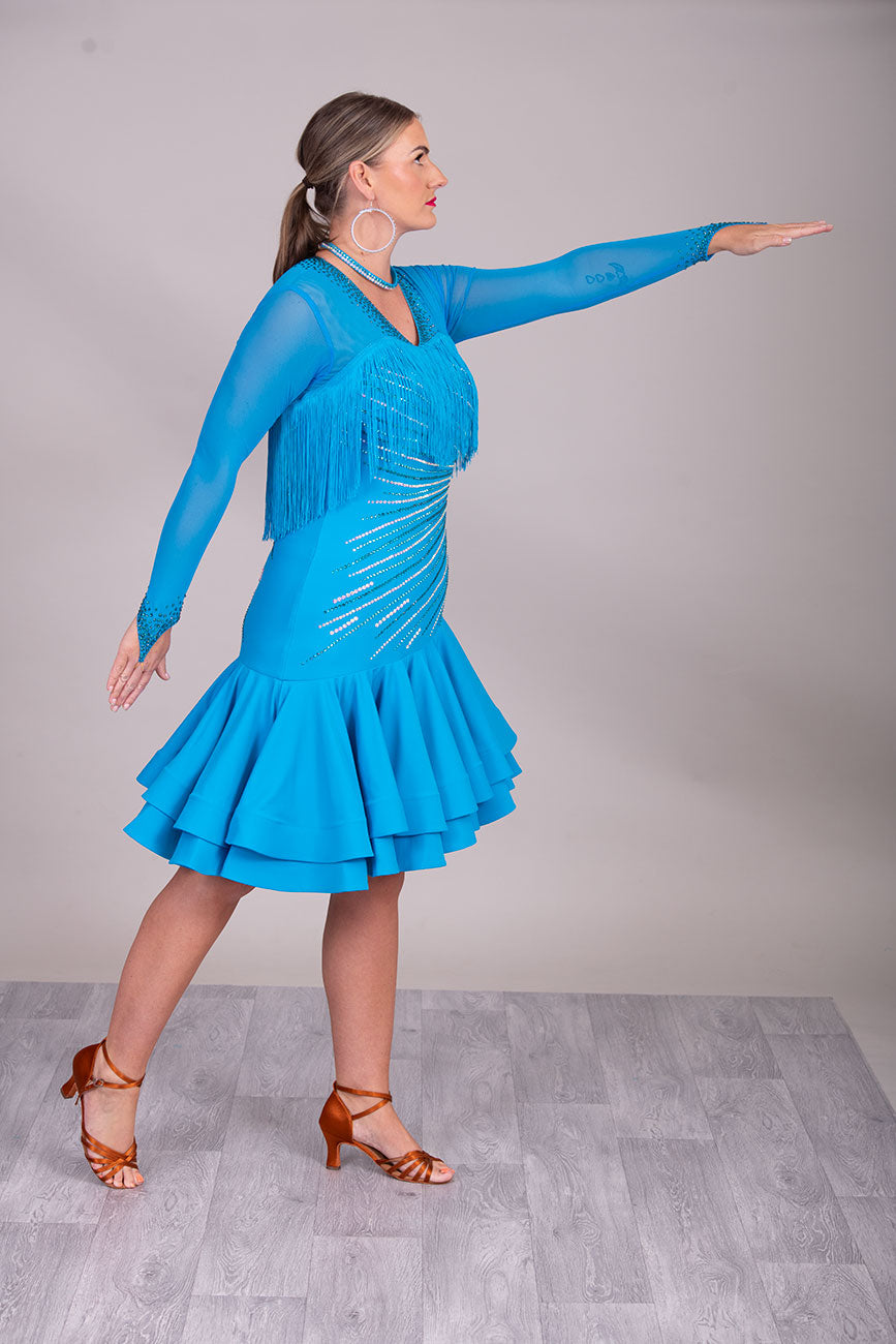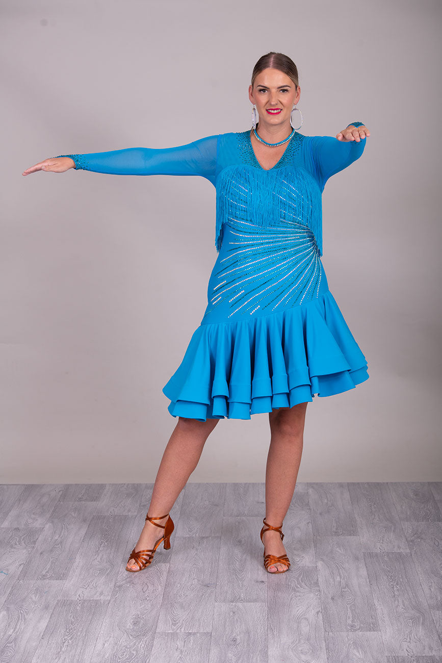 126L Gorgeous Blue Latin Competition Dance Dress. High Back allowing option to wear own Bra Very flattering design to the tummy/hip with full deep frill skirts for maximum movement & fringes to the upper chest