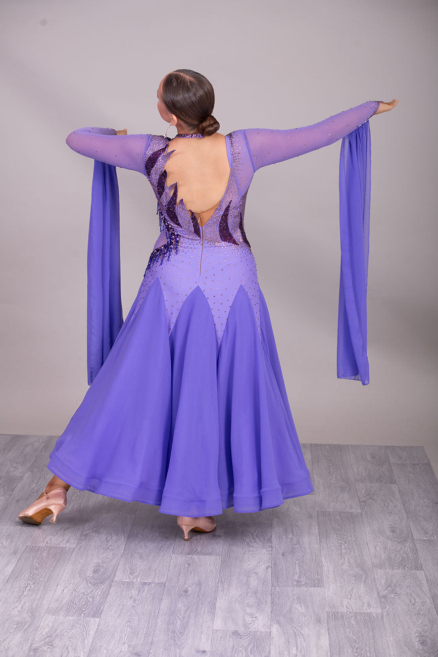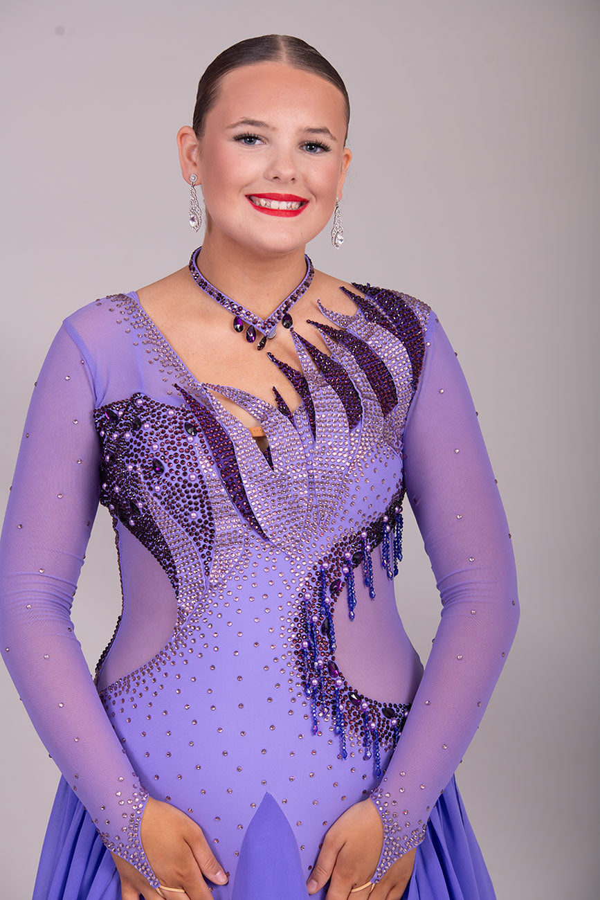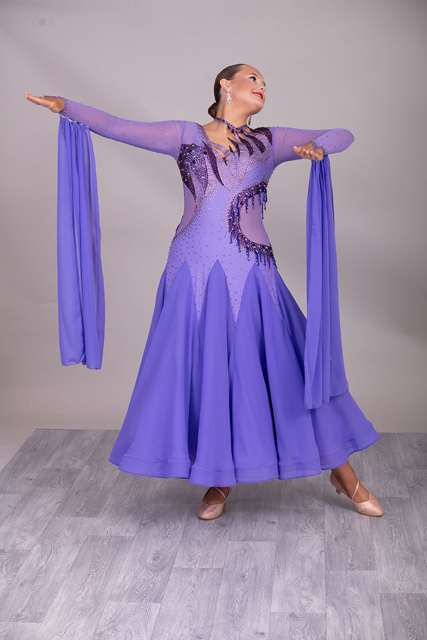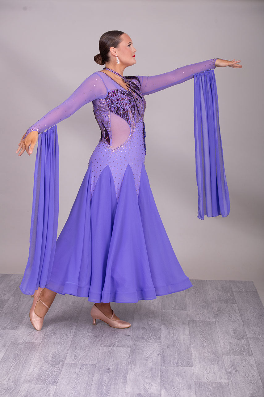 128 Lilac Ballroom Dress with detachable floats. Detailing to the front chest & Back stoned in Amethyst, Light Amethyst & Purple