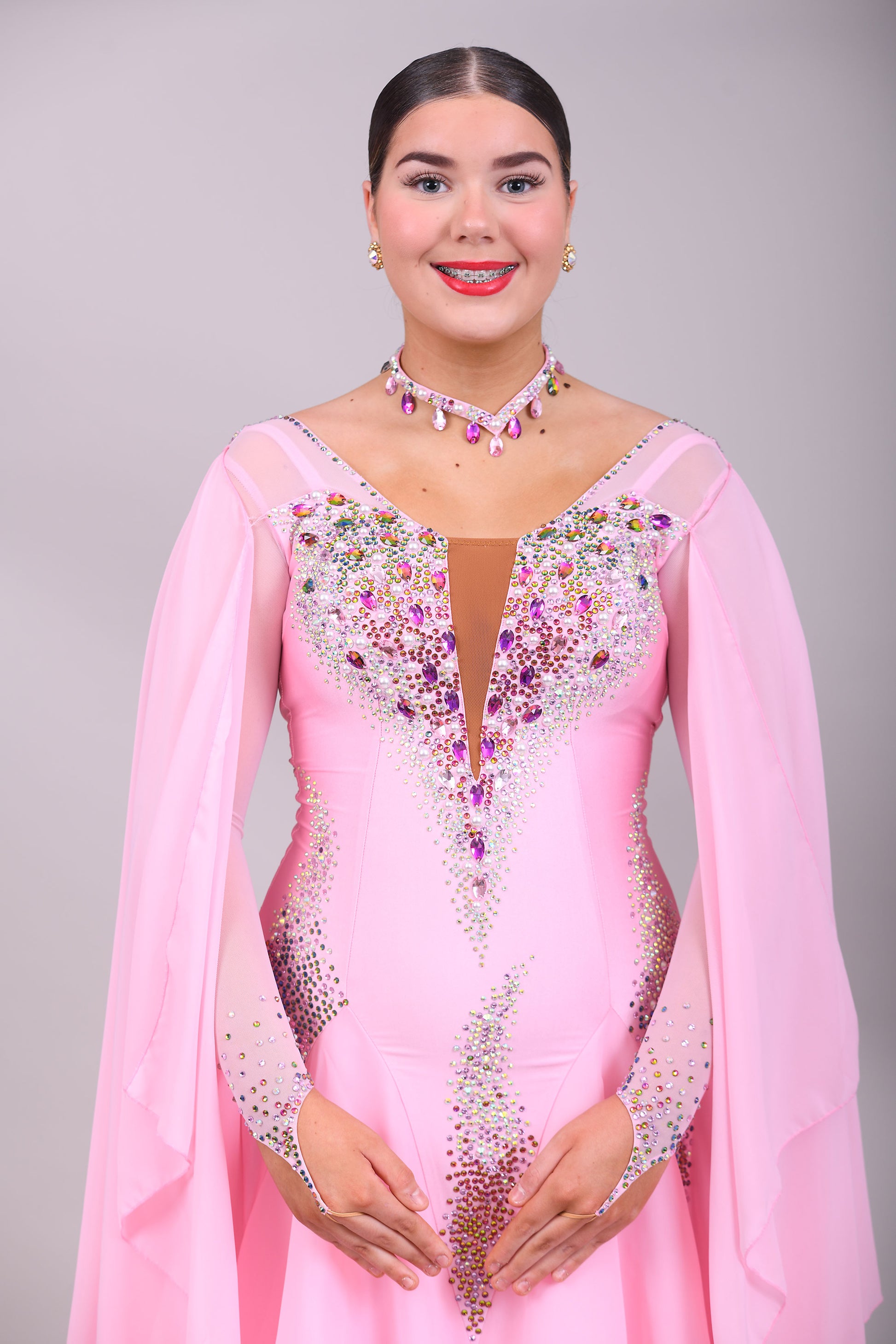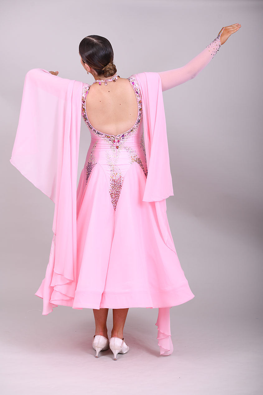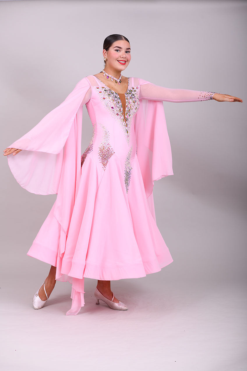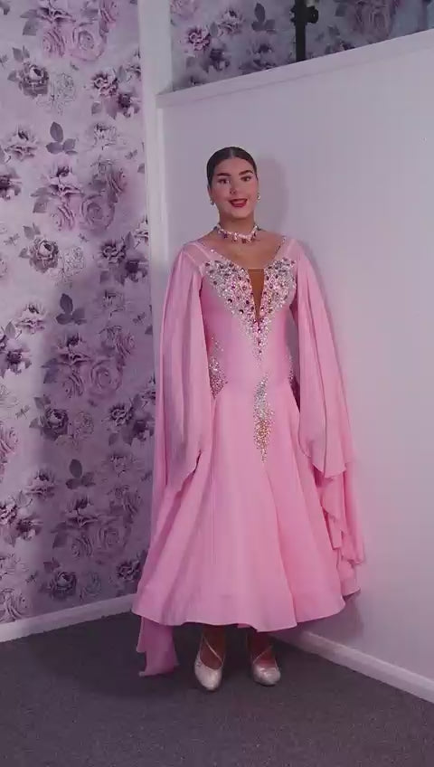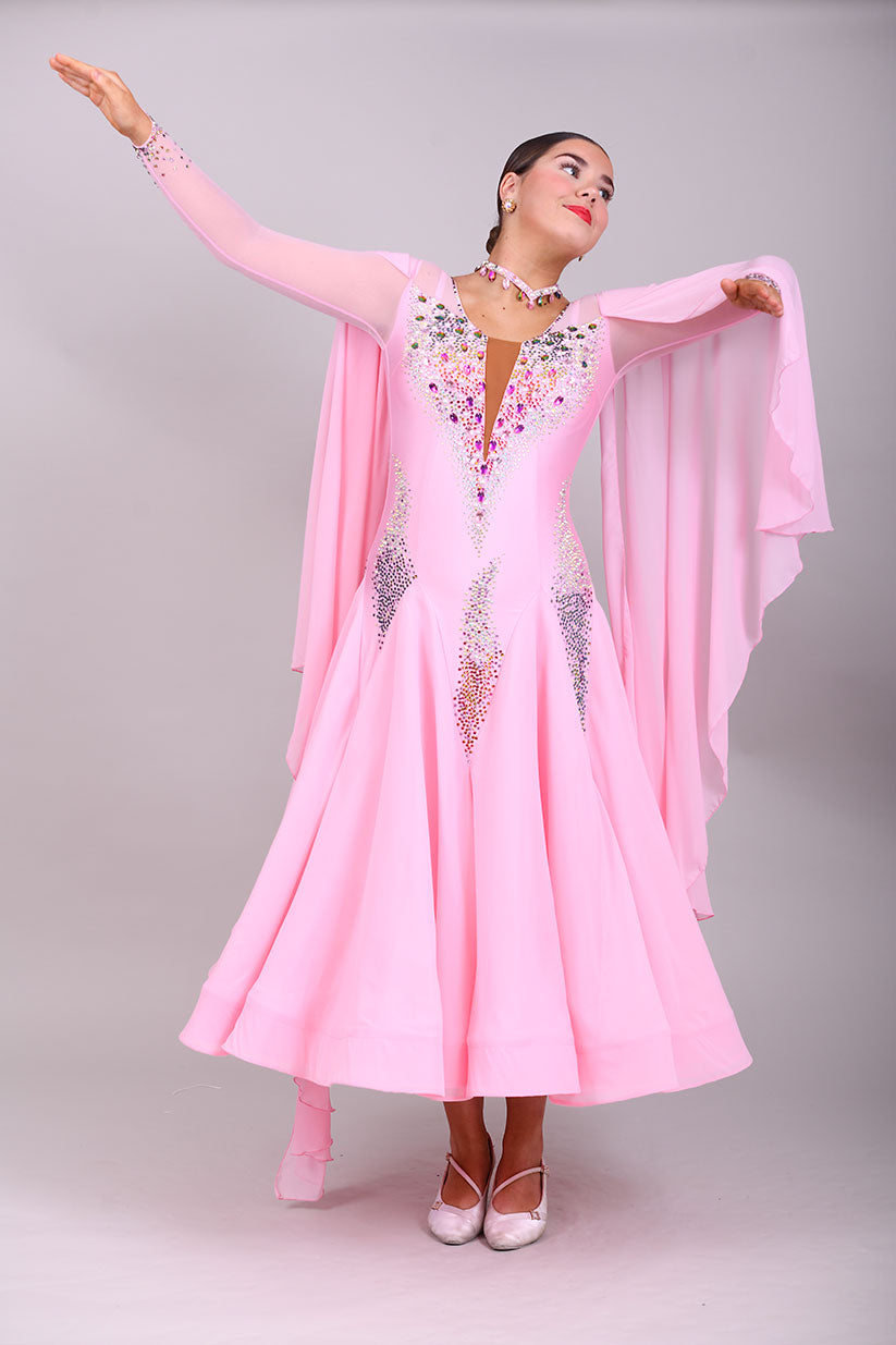 131 Pink Ballroom Dress with shoulder floats. Tan panel to the chest area giving a plunging neckline effect. Decorated in AB & Fuchsia stones