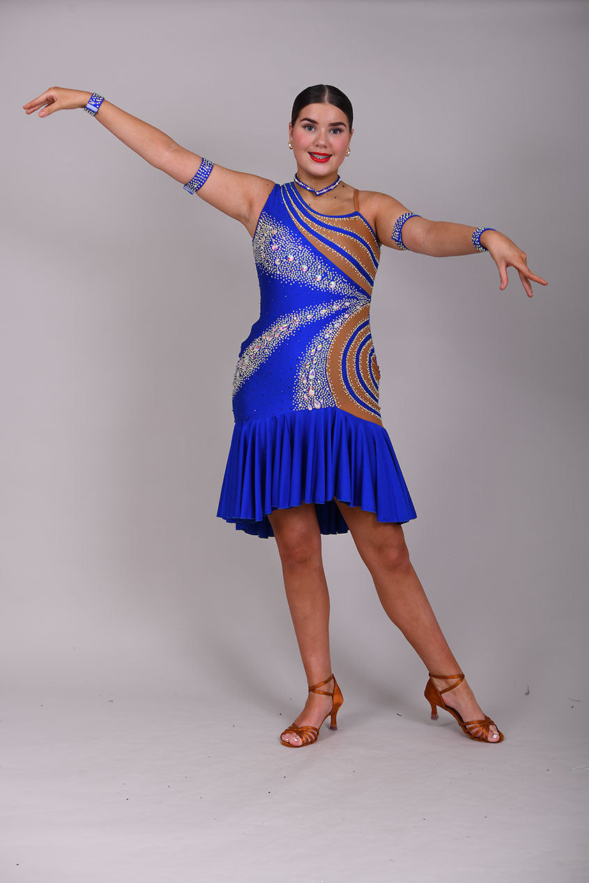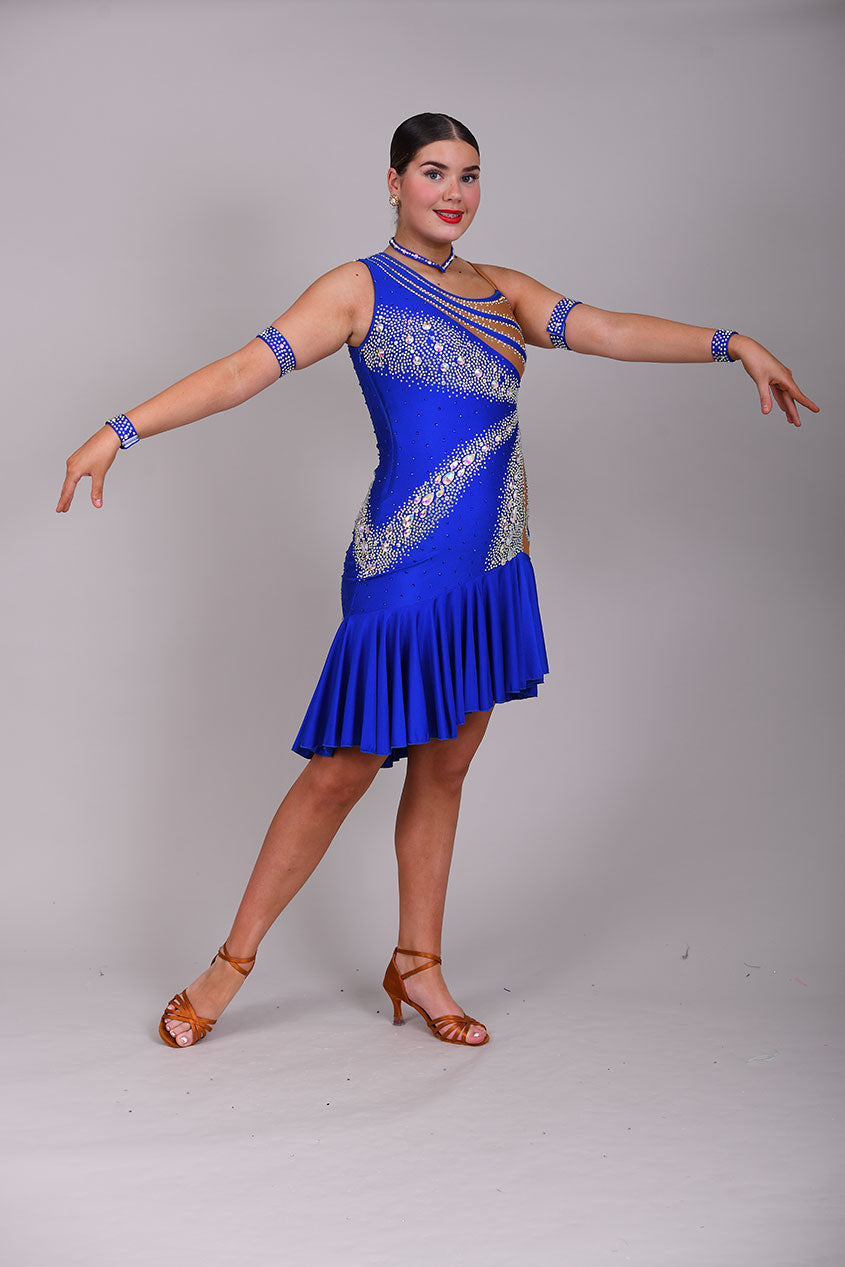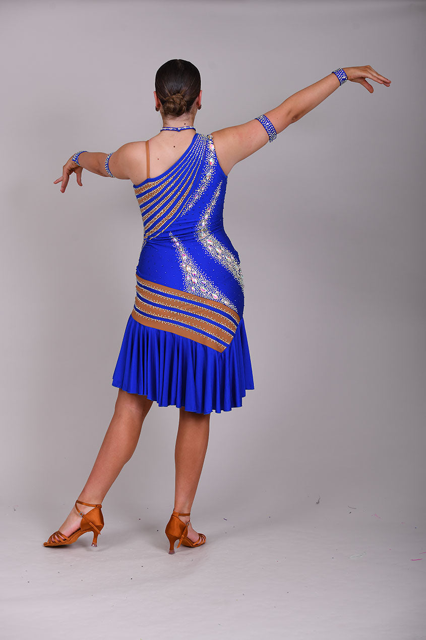 138 Bright Electric Blue One Shoulder Latin Dress. Tan Lycra to one side & heavily stoned in AB. Full frill effect skirt.