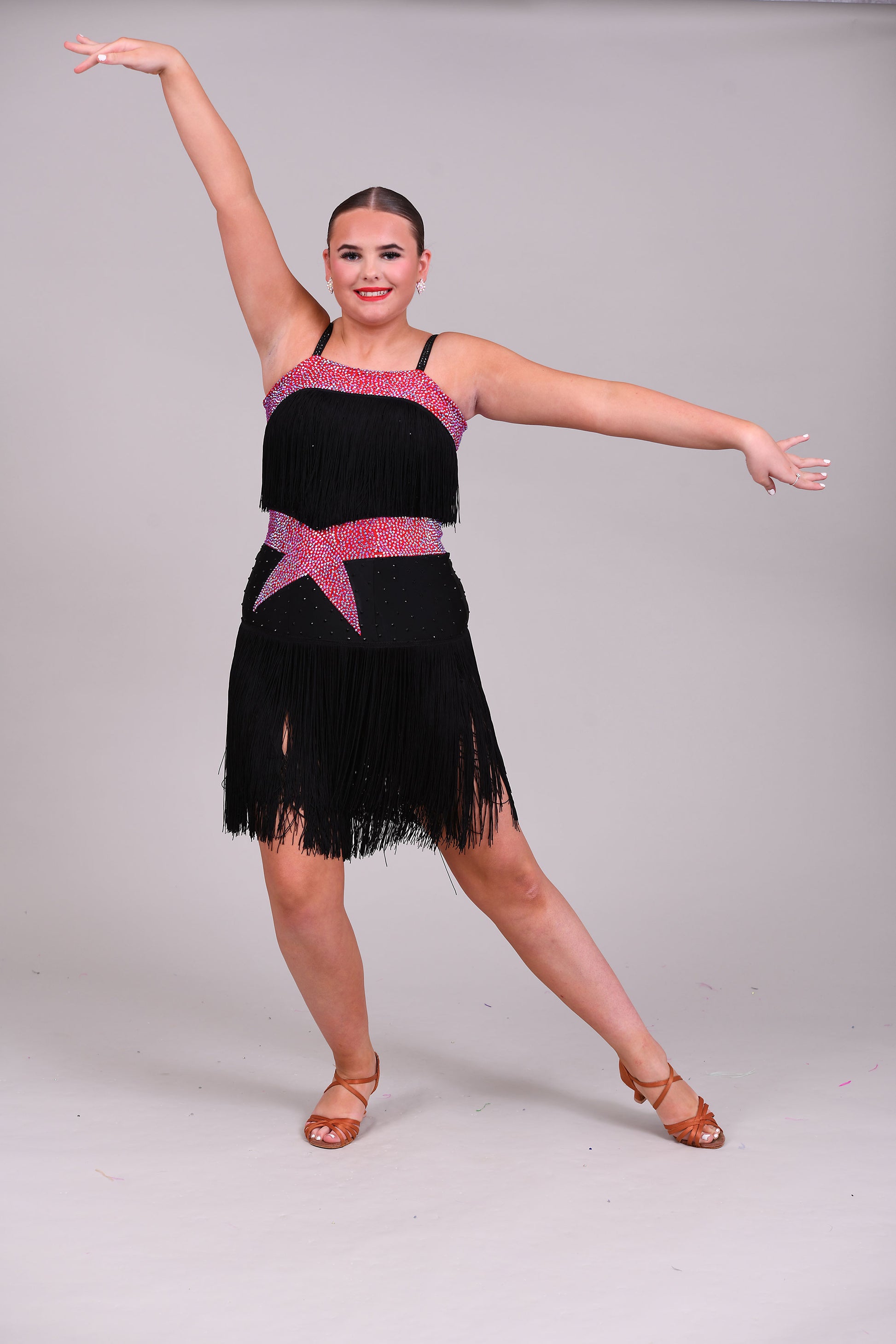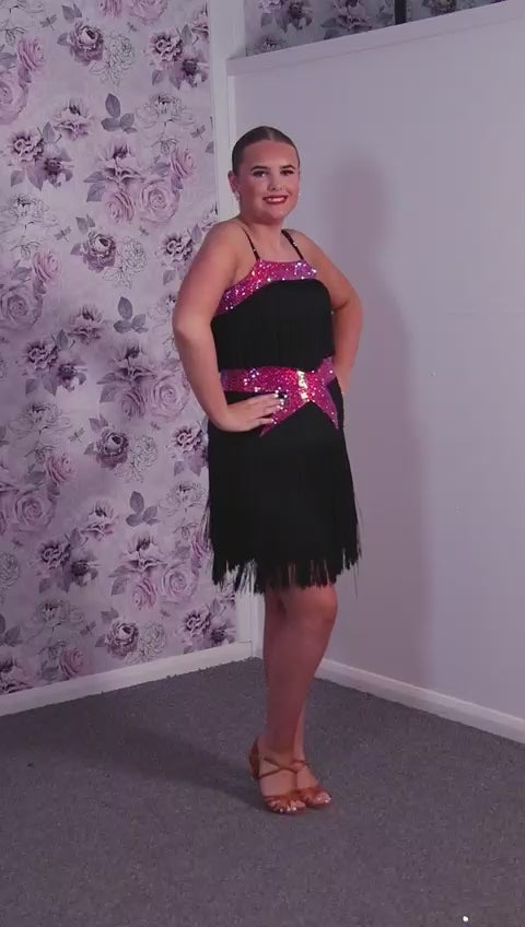 152 Black Latin Dress with full fringe skirt and fringe detailing to the bodice. Cerise Belt and upper chest panels decorated in Siam AB stones