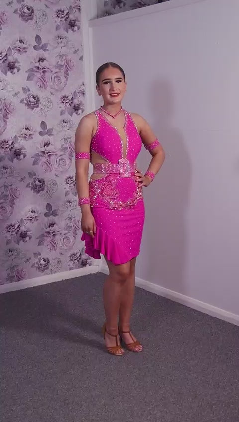 156 Flo Pink cut out Latin Dress. Full frill skirt with detachable belt. Flo pink appliqués decorated in Rose & AB stones