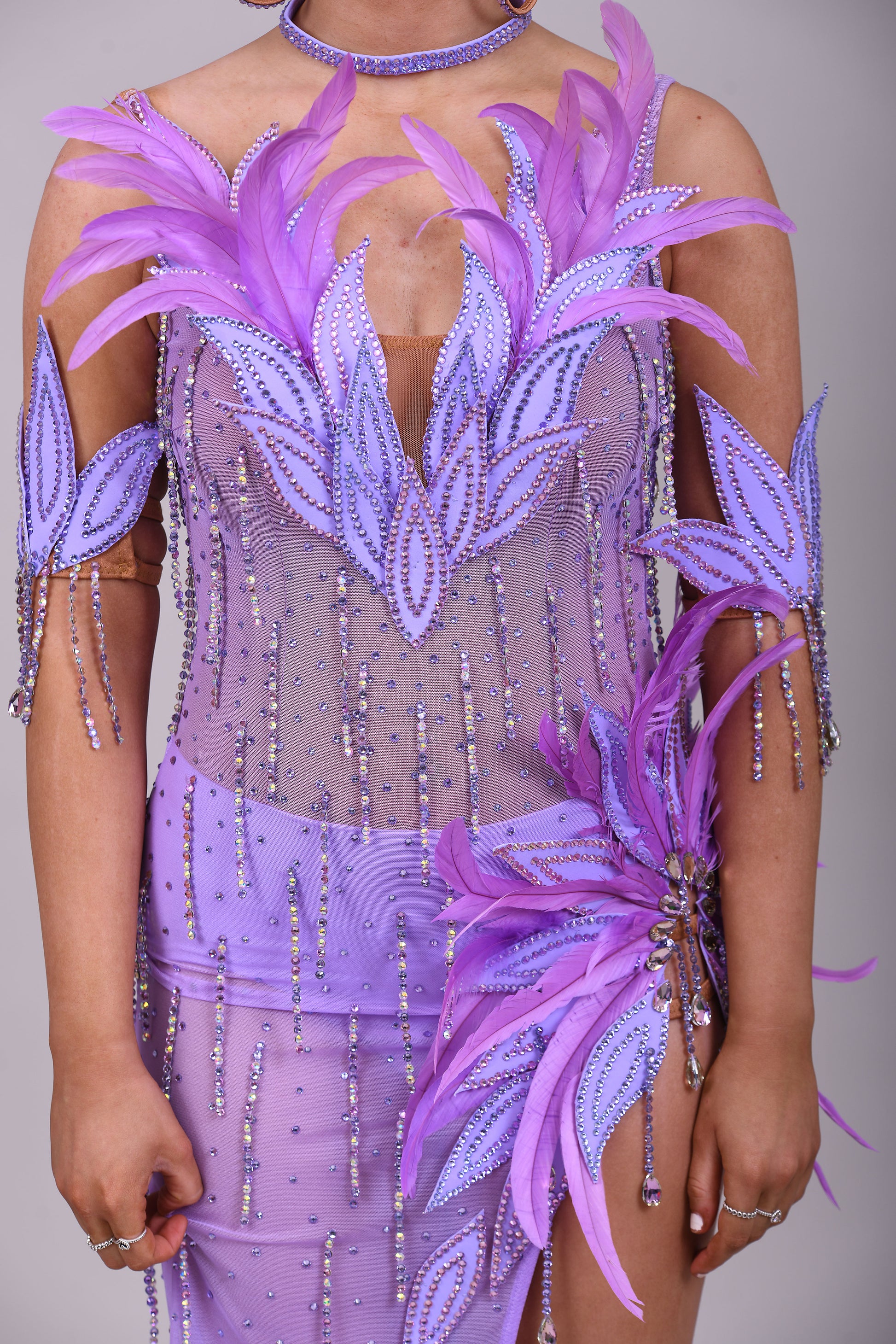 160 Lilac Latin dance dress. Stunning feather detailing to the upper chest & hip. Mesh fabric dress.