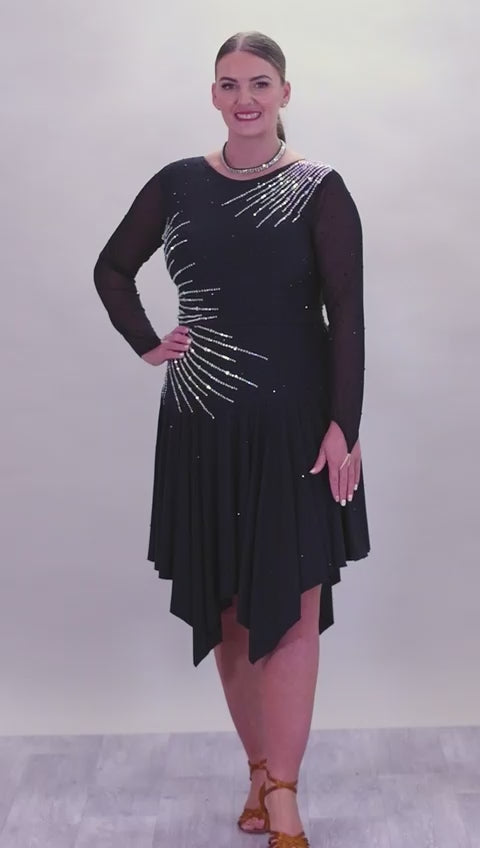199 Flattering Black Latin Dance Dress. Super Stretchy. Stoned in AB starburst design with handkerchief hem skirt. High back giving option for wearing own bra.
