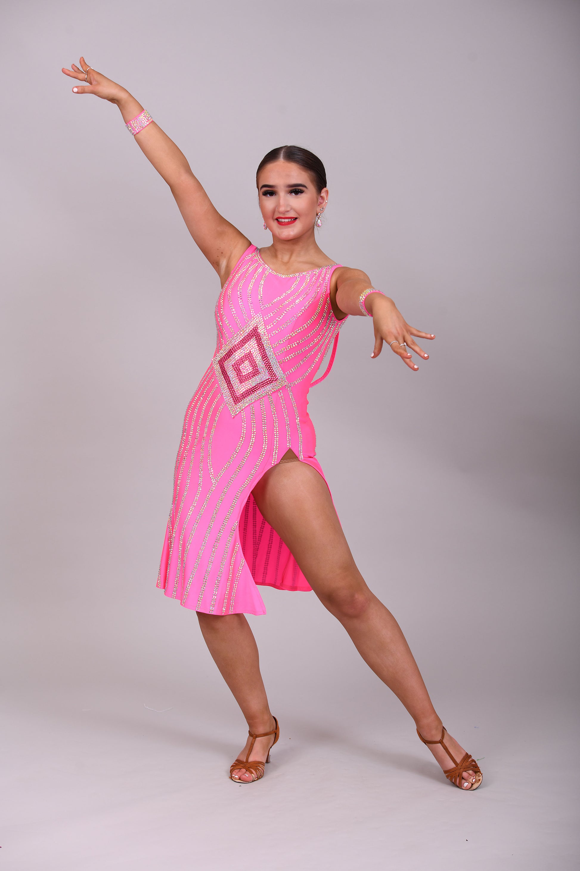 172 Flo Pink Latin dress with split detail to one side. Decorated in Rose & AB