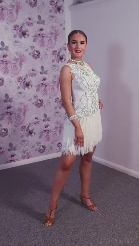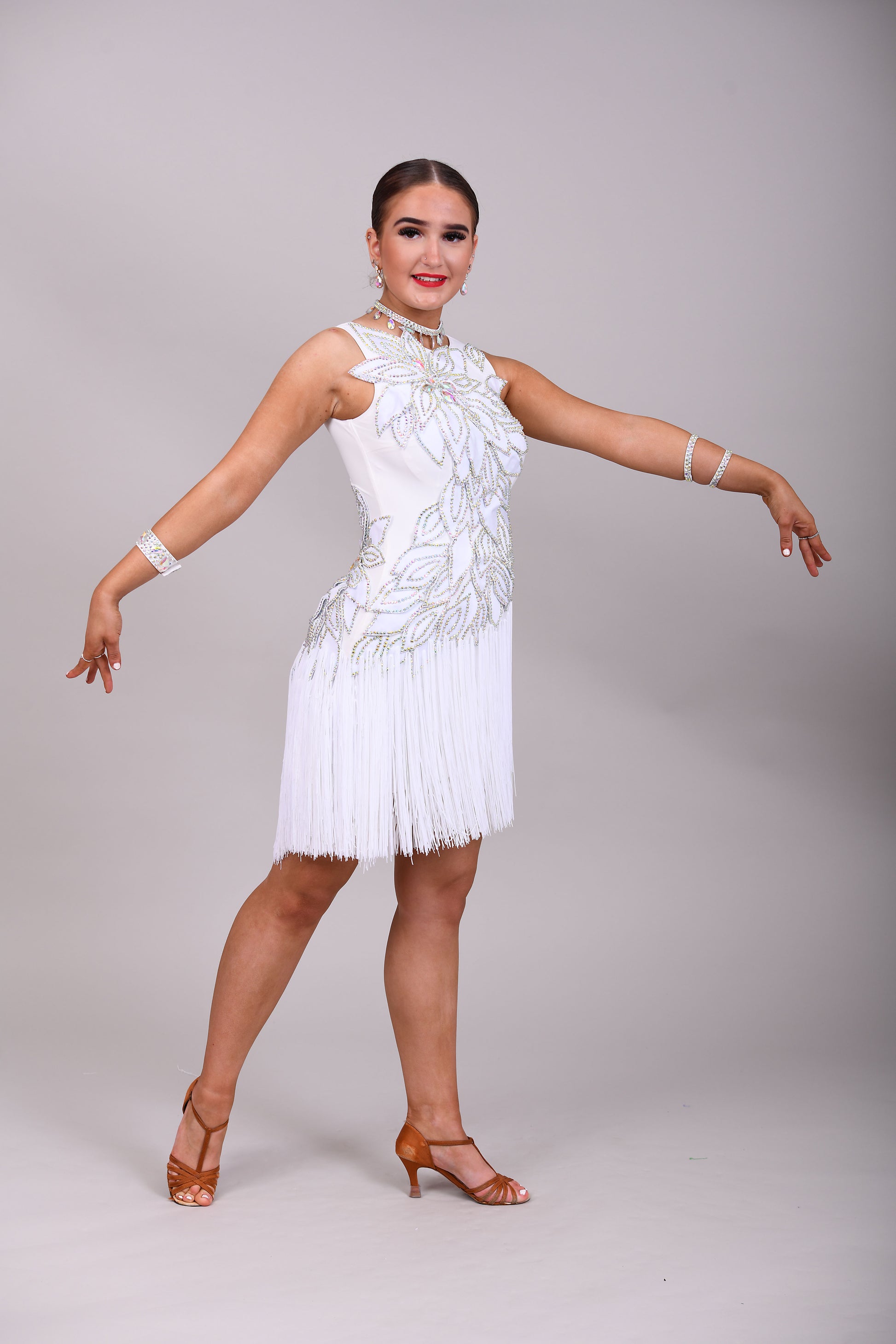 177 White 3D flower & leaf design Latin dress. Fringe skirt with open side detail. Stones all AB