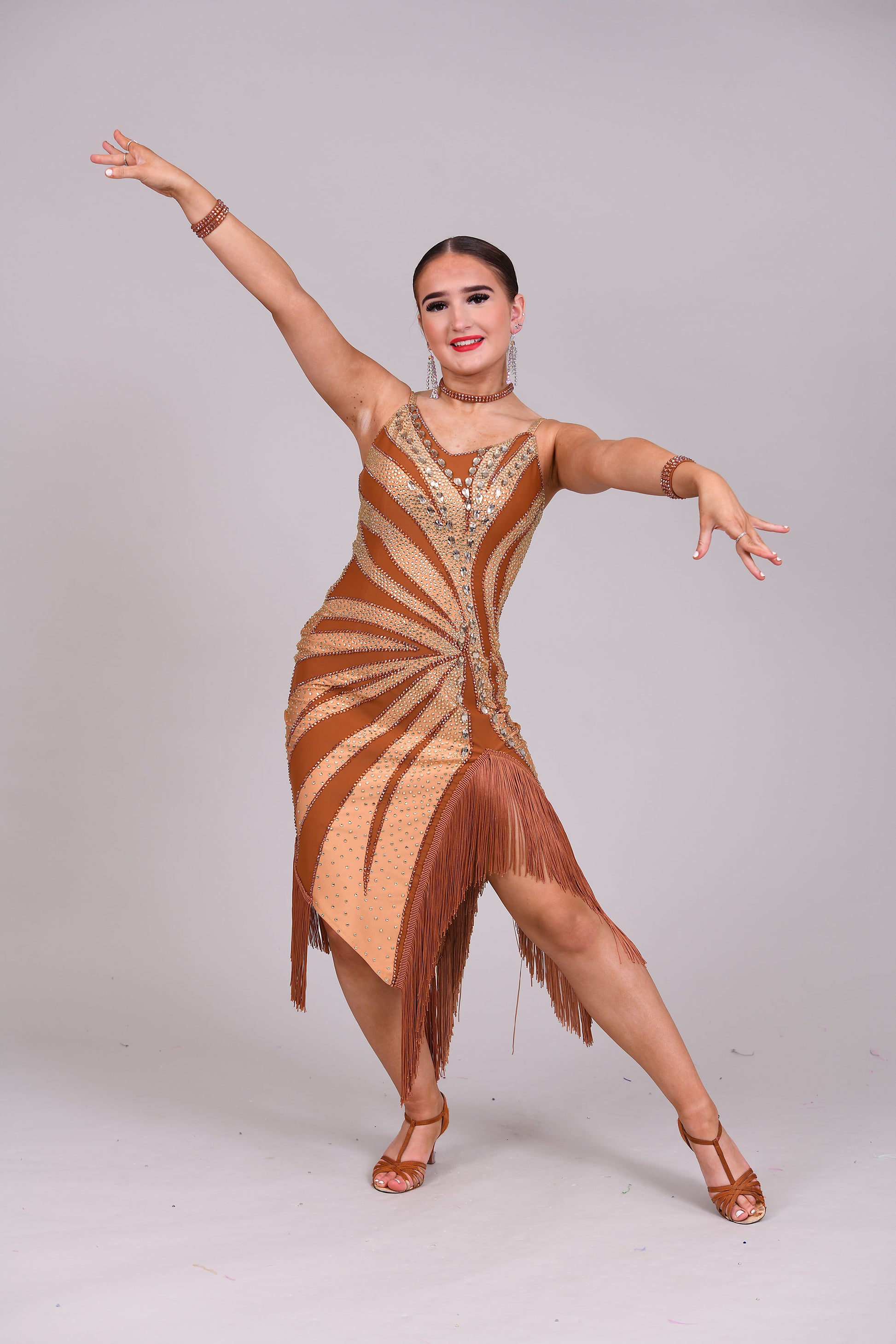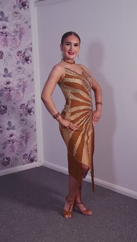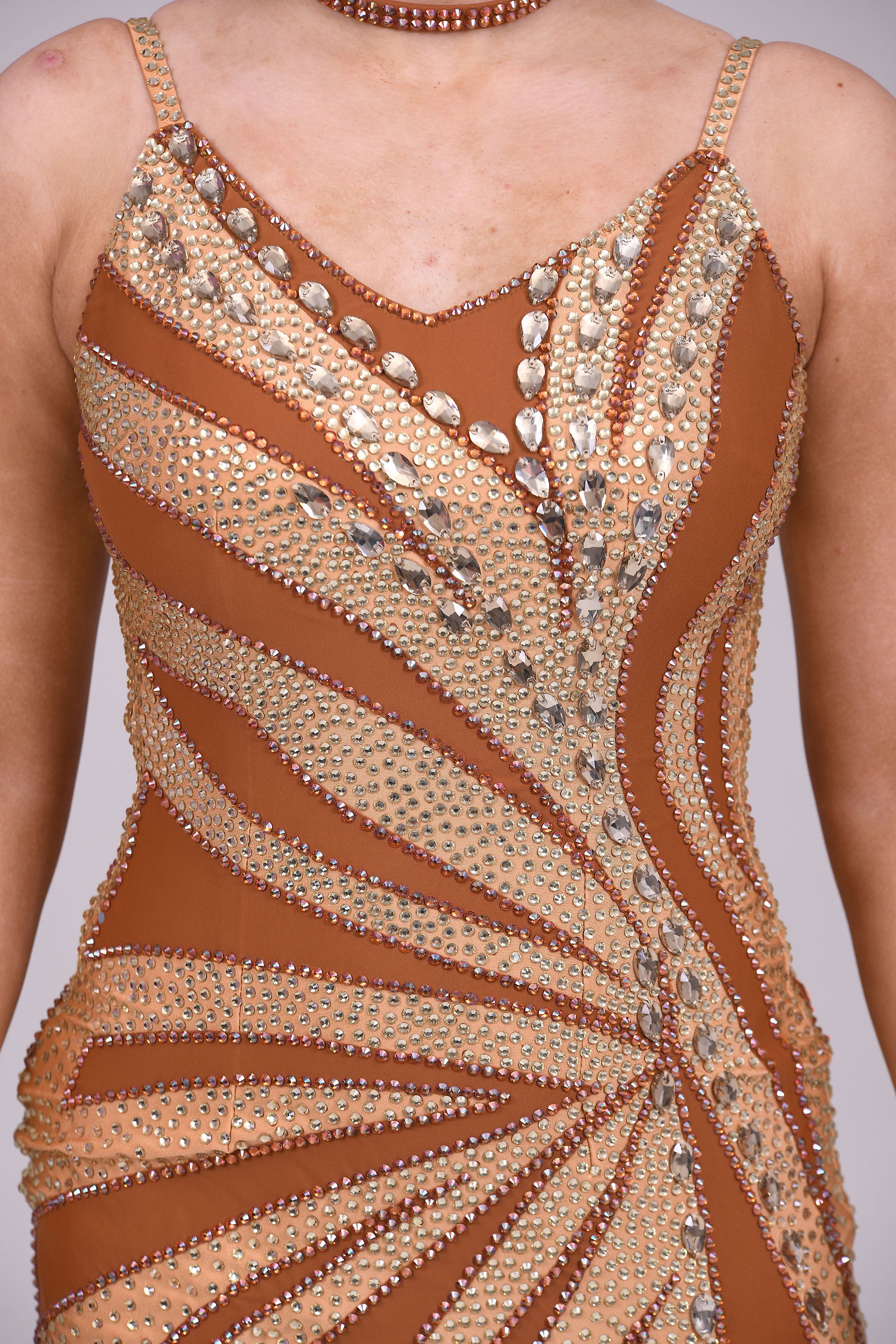 116 Coffee & Tan Latin Dress. Multi splits to the hemline with matching fringes. Stoned in Sunshine, Aurum & Topaz