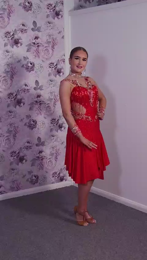 206 Red Lycra Dress with super full skirts. Motif detailing to back. Decorated with Siam bead droppers, cut out sides decorated in Siam & AB stones