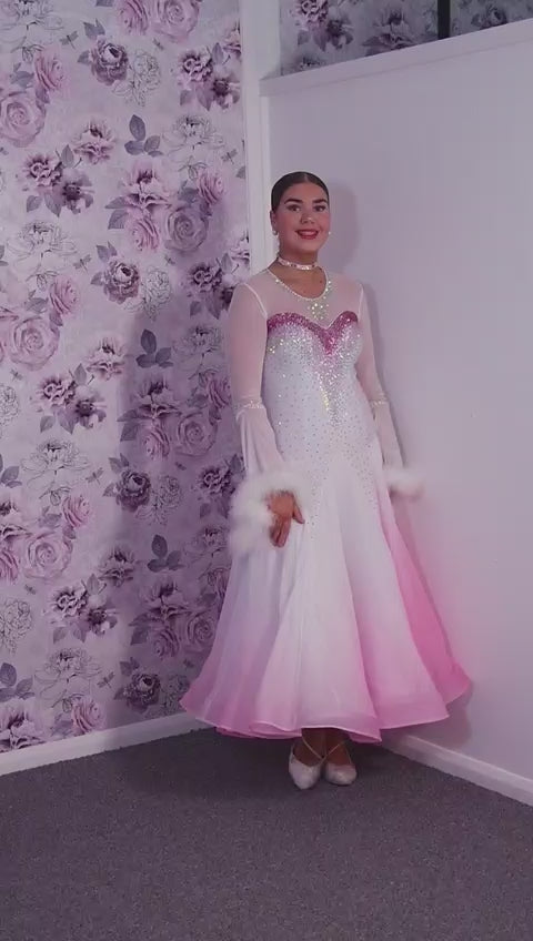 207 Pale Pink & White Ombré Ballroom Dress. Scoop neck & High mesh back. Feature stoning at the chest in rose, light rose & AB. Feather detailing to bell sleeves.
