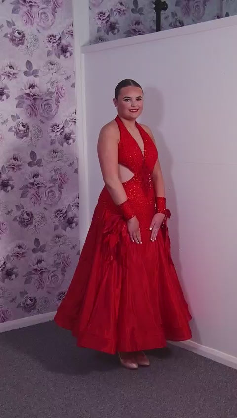 219 Red Sleeveless/Backless Ballroom/Smooth halter neck Dress. Feature panelling to the waist. Long Glove let’s with feather detailing. Flesh strapping to the chest and back.