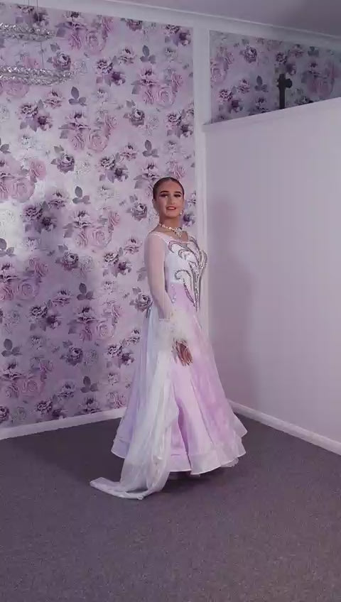 233 White Dress with lilac underlayer to the skirt. White floats. Decorated in lilac & AB stones with ostrich feather detail to the cuffs