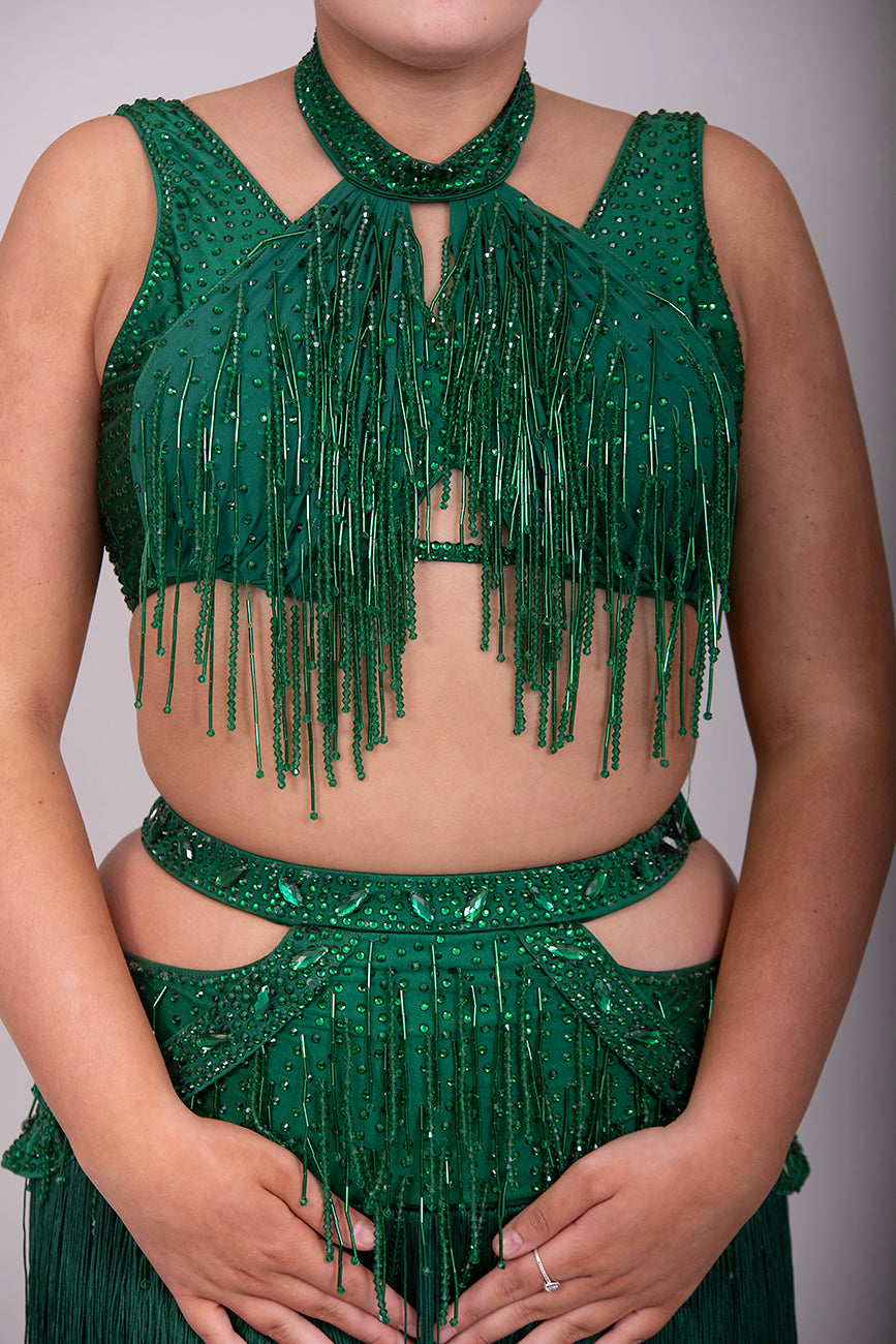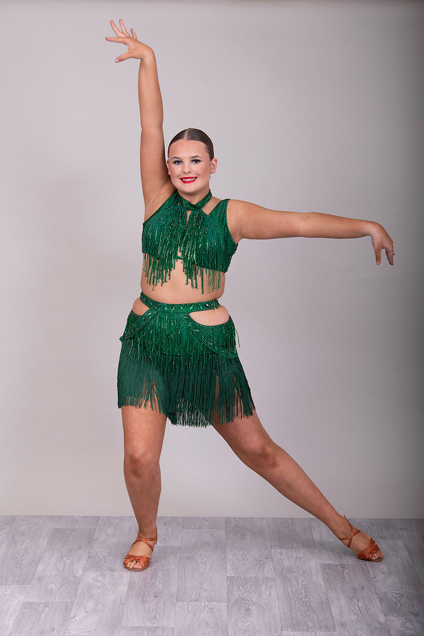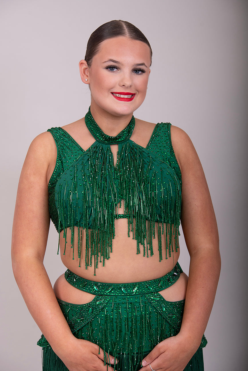 (BUDGET)7 Emerald Latin Competition Dance Dress. stoned in Emerald. droppers to chest & waist with fringe skirts. *****Our New Budget Range are Bought in ready made Costumes, with some detail added by TWDance*****
