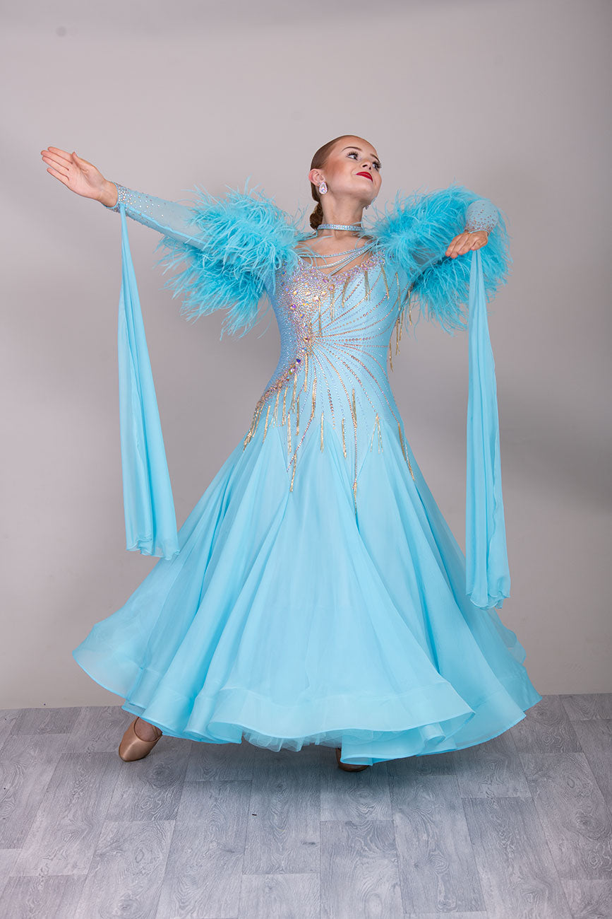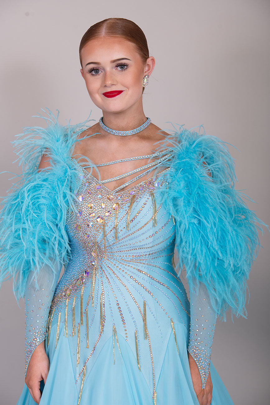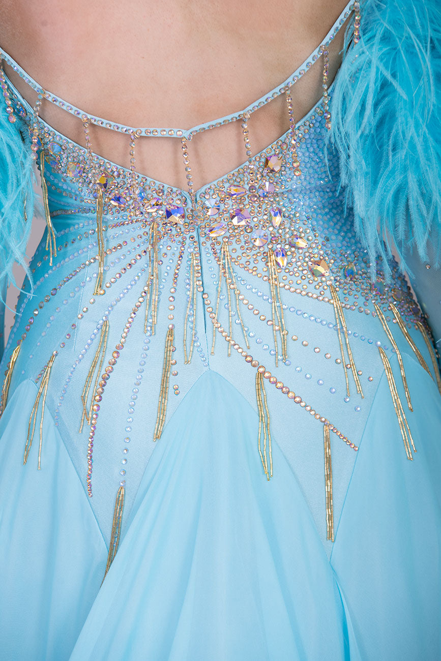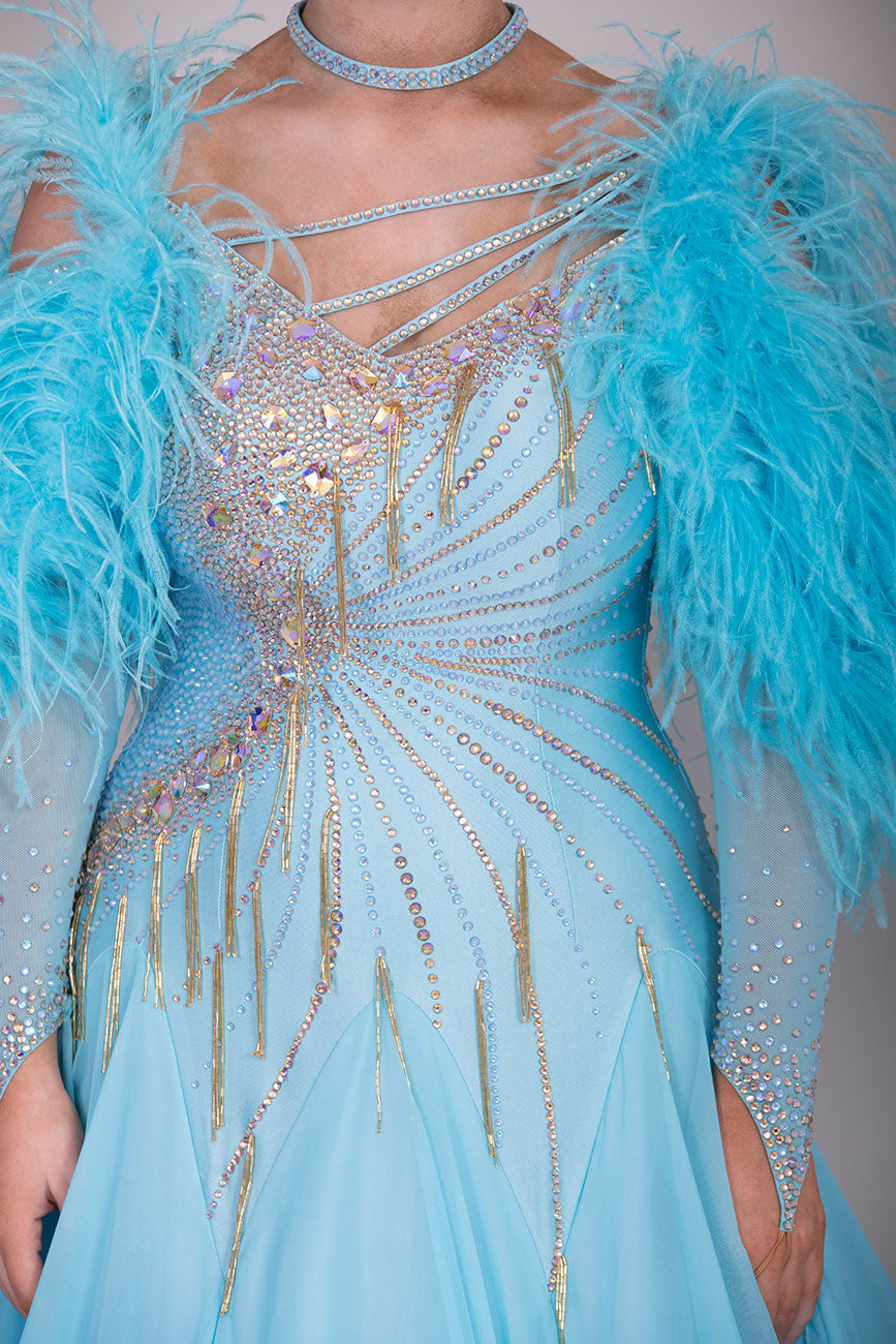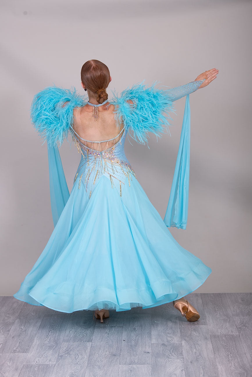 24B “TWD ELITE” New Full Skirts/Underskirts with Ostrich Feather sleeve detail. Stunning back design. Stoned in Crystal Golden Shadow with gold bead droppers. Detachable Floats