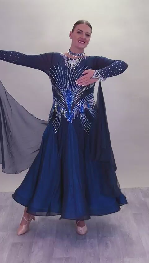 263 Midnight Blue Ballroom Dance Dress. Heavily stoned in AB, Capri Blue AB & Capri Blue. Detachable floats