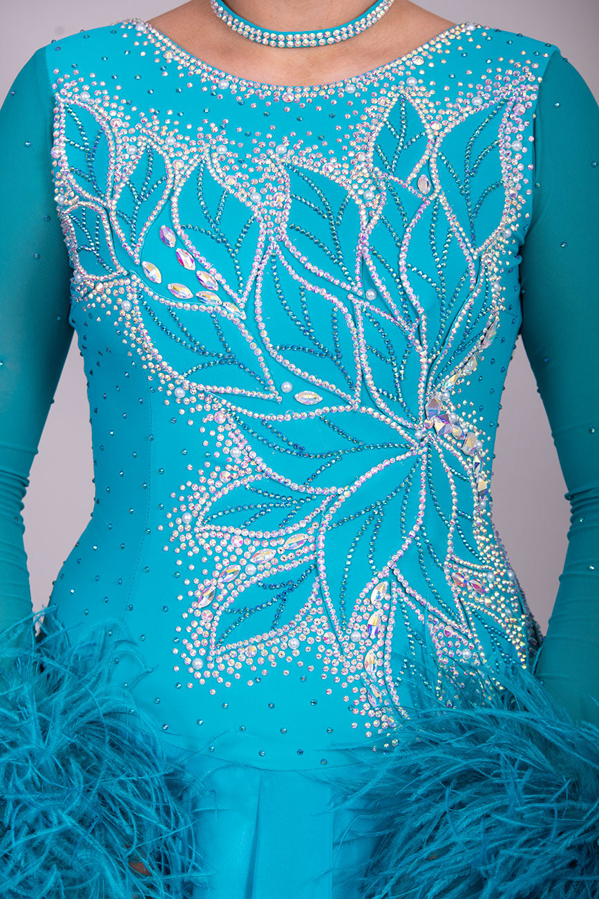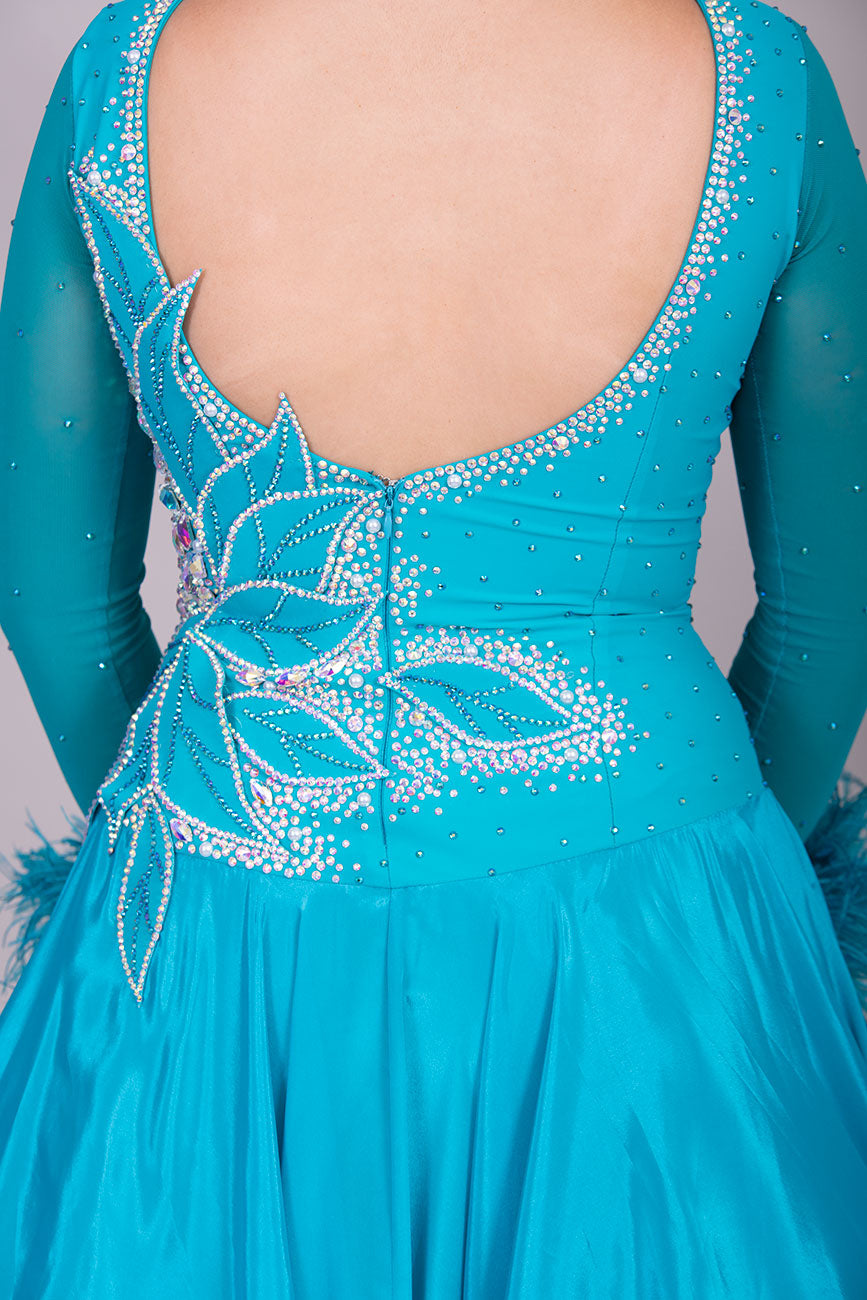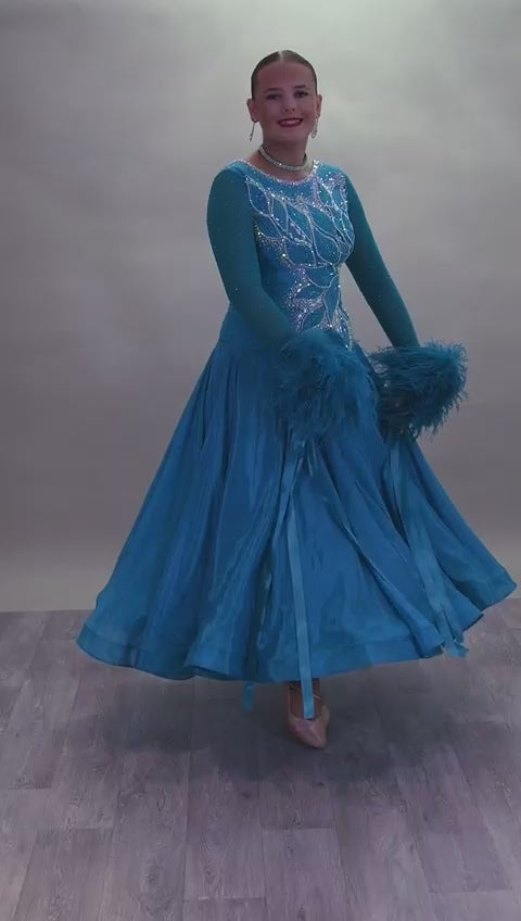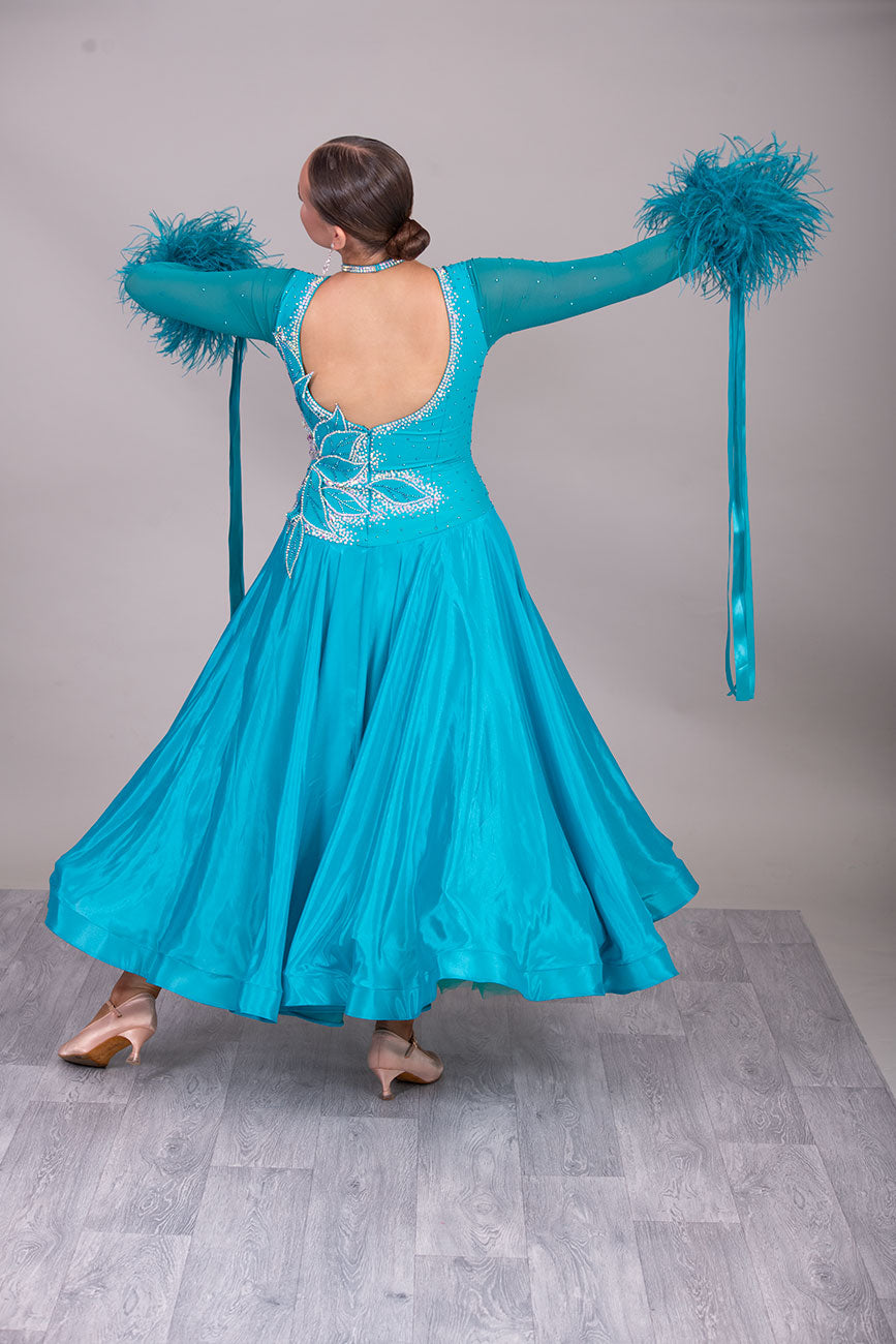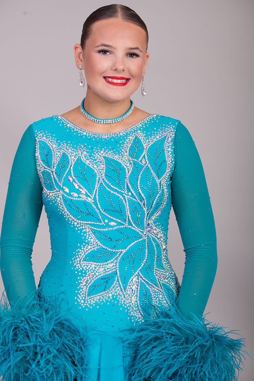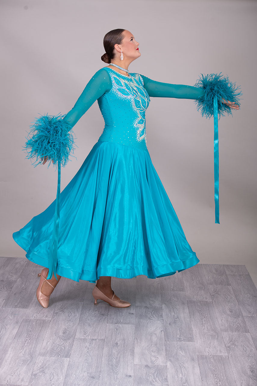 26B “TWD ELITE” Teal competition Ballroom/Sequence Dance dress. New Fuller skirts/Underskirts with 3D design to front and back. Stoned in AB & Blue Zircon. Detachable Ostrich Feather Floats