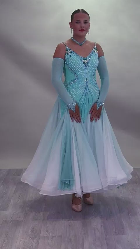 27B Aqua & White Ombre Competition Ballroom/Sequence Dance Dress. Pearls & Stones create this stunning pattern.