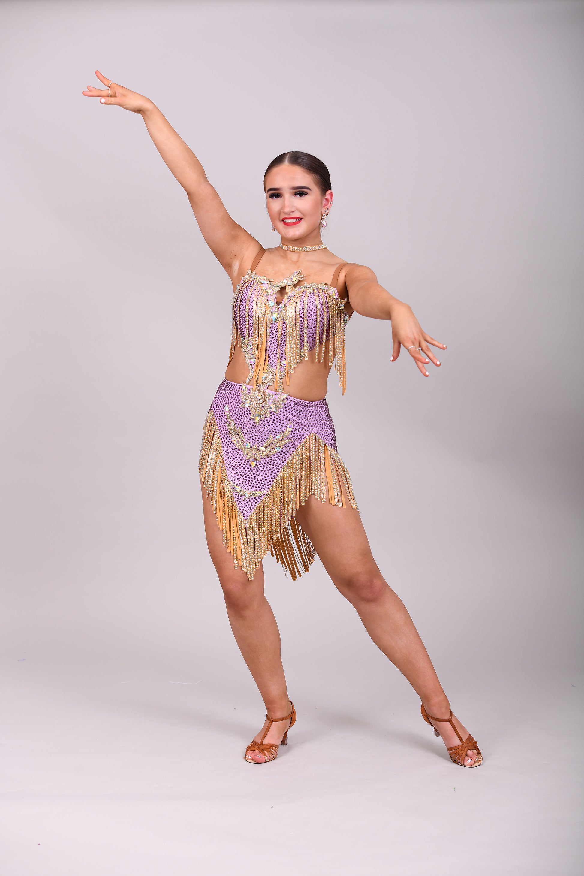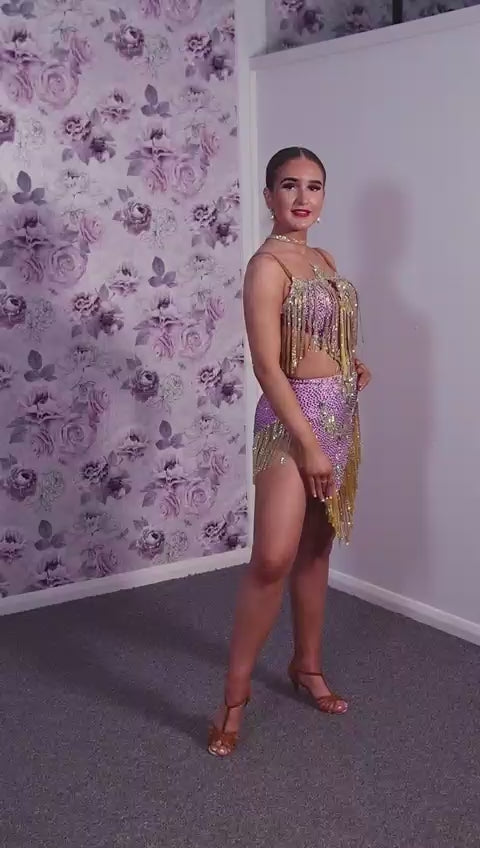 295 Lilac and Gold Latin dress. Gold material droppers stoned in AB. Lilac fabrics all decorated in matching stones.