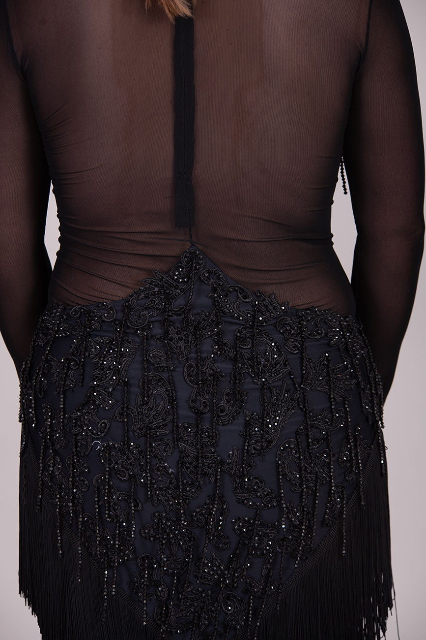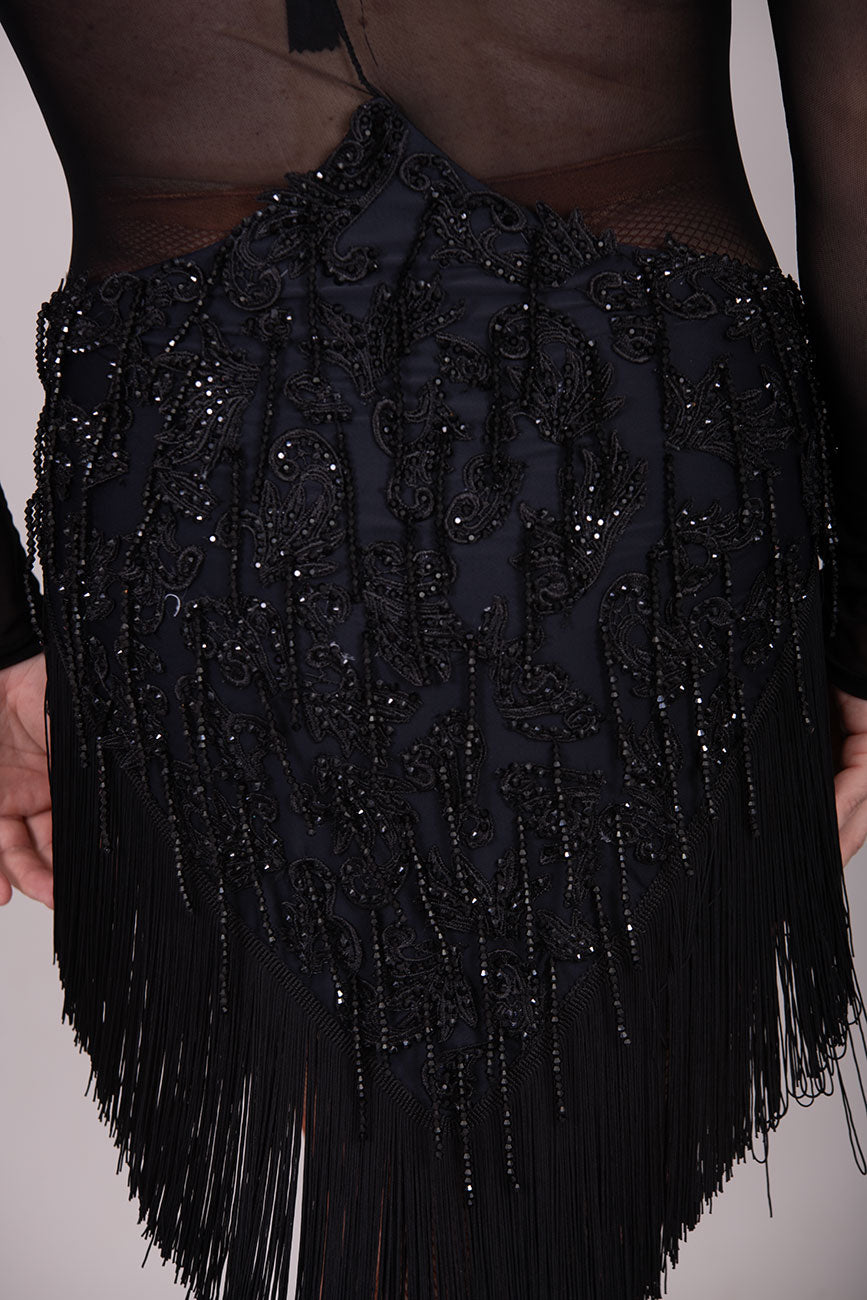 (BUDGET)15 Black Latin Competition Dance Dress. Stoned Black Motifs throughout with black bead droppers all over. High Back giving option to wear one bra. Cut out hips to get those legs out. Fringe to the hem of the skirt