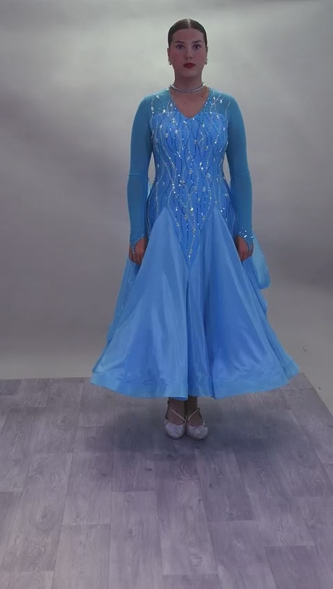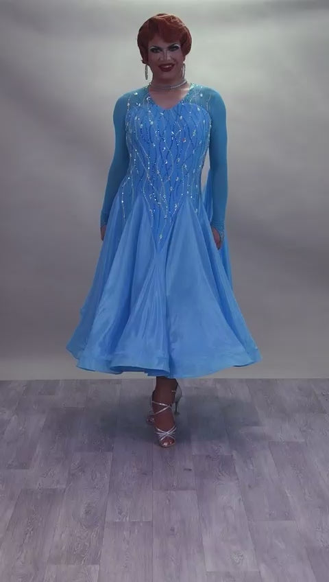 31B Beautiful Blue Competition Ballroom/Sequence Dance Dress. Stoned in Aquamarine, AB & Aquamarine AB. Detachable Floats High Back to give option of wearing own bra