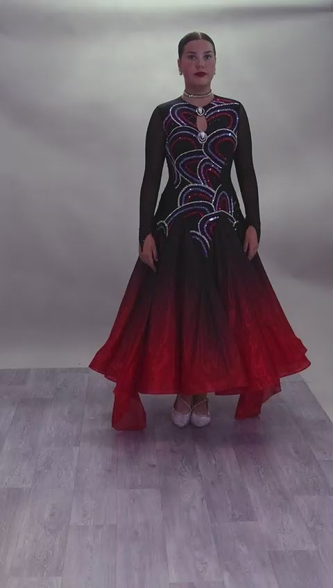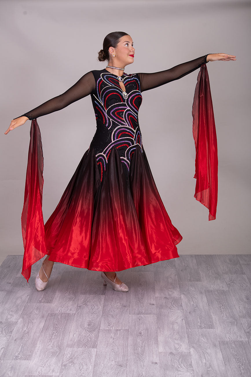 32B Black & Red Ombre Competition Ballroom/Sequence Dance Dress. Stoned in jet, AB, Siam & Light Siam. Very classy design giving full front & sleeve coverage and lovely back opening.