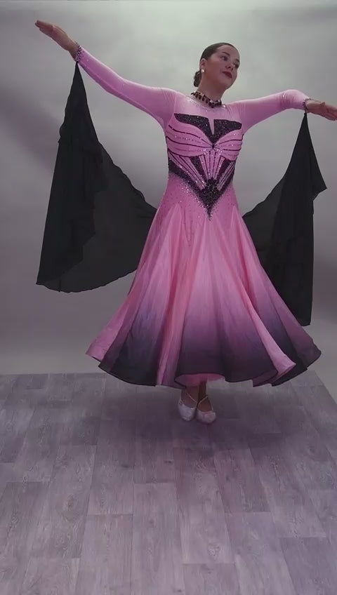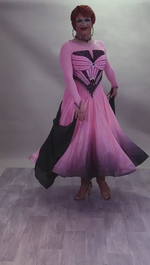 33B “TWD ELITE” Absolutely Stand Out Ballroom/Sequence Competition Dance Dress. Pink & Black Ombre stoned in Jet, Light Rose & Light Rose AB. Detachable Floats. High Back to give option of wearing own bra