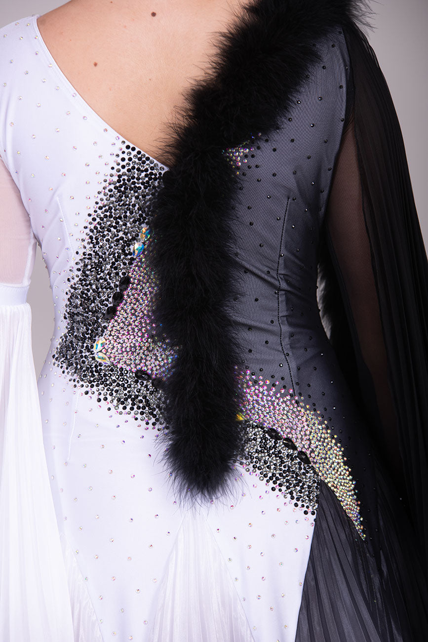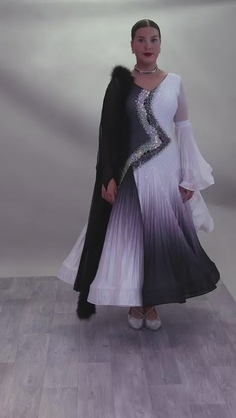 33B “TWD ELITE” Ballroom/Sequence Competition Dance Dress High Back allowing option to wear own Bra. Pleated Skirts in Black & White Ombre Pearl Chiffon. Pleated bell sleeve to 1 arm. Finger loop can be added. ❤️Showroom Appointment Available❤️