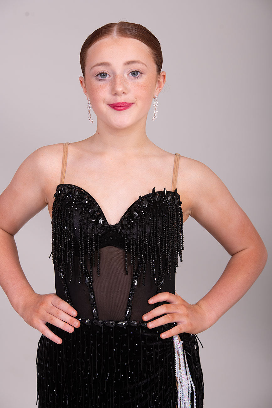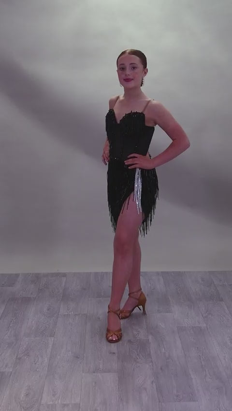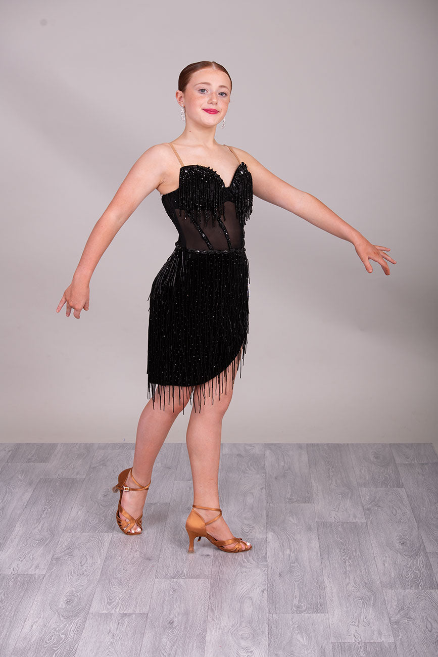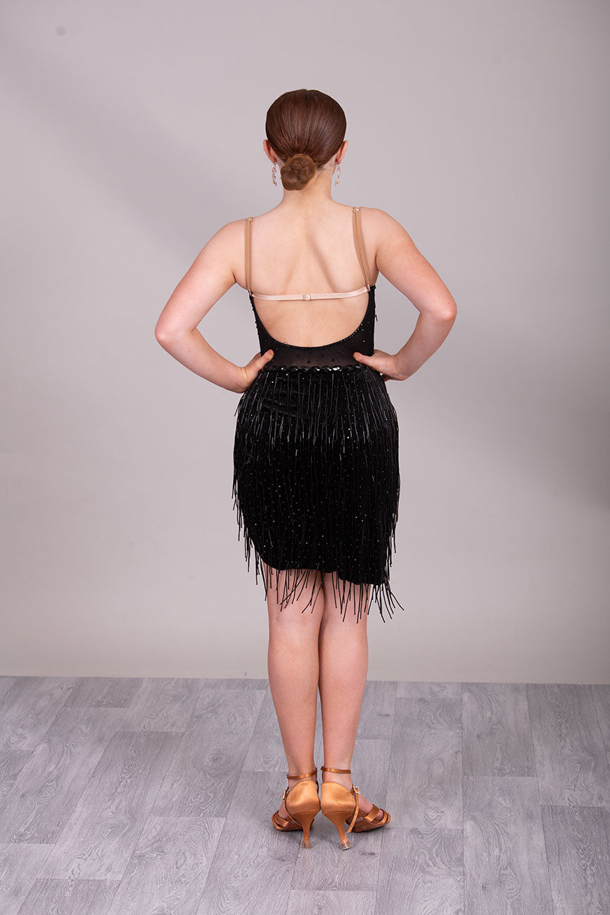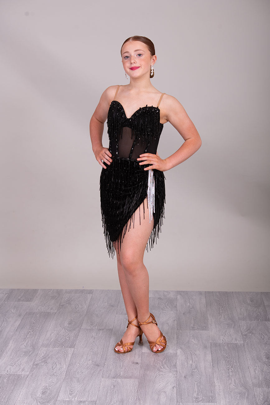 (BUDGET)12 Black Competition Latin Dance Dress. Heavily stoned bodice with beaded tassels. Mesh centre panel with corset details. Asymmetrical skirt stoned & full of beaded tassels. Open back with flesh security straps