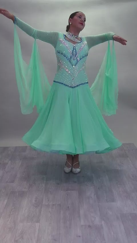 36B Pretty in Green Ballroom/Sequence Competition Dance Dress High Back allowing option to wear own Bra Very flattering design with additional neck detailing. ❤️Showroom Appointment Available❤️