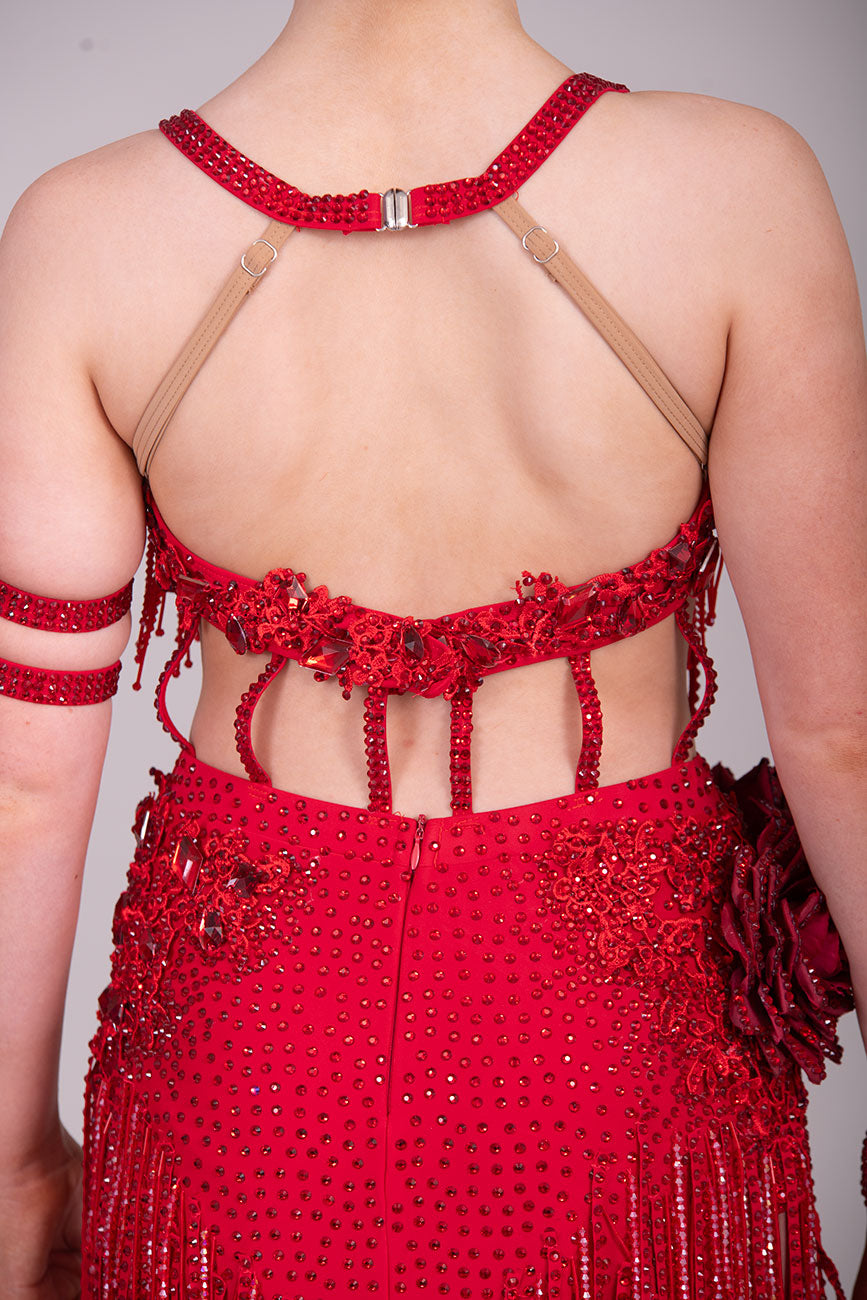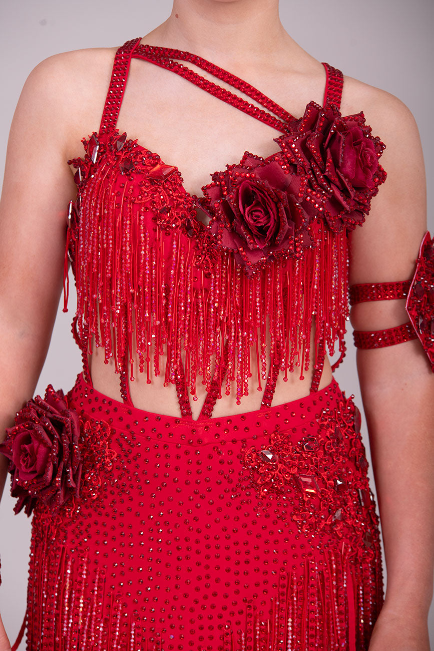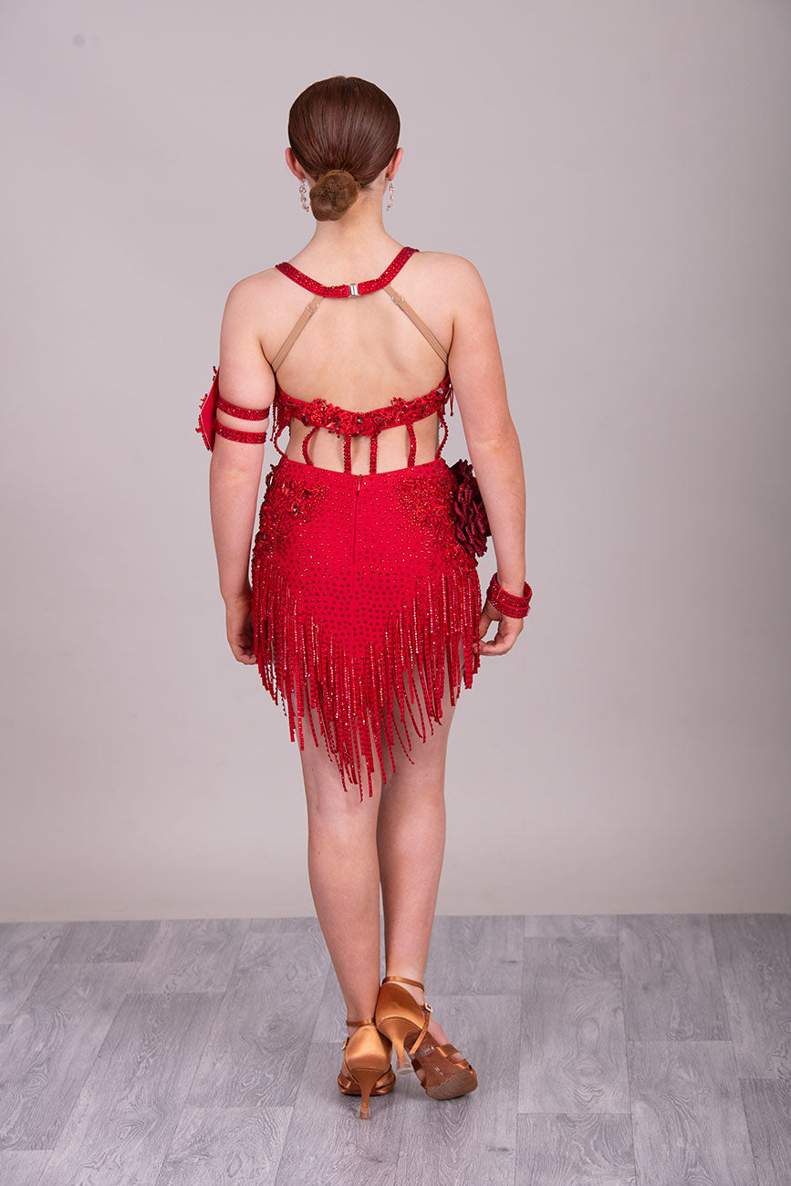 (BUDGET)13 Deep Red Competition Latin Dance Dress. Full of Red stoned fabric tassels & stoned motifs on the Bra style top. Heavily stoned flowers & strap detailing finish the top off. Skirt has flower to the Hip with stoned motifs and fabric strips over.