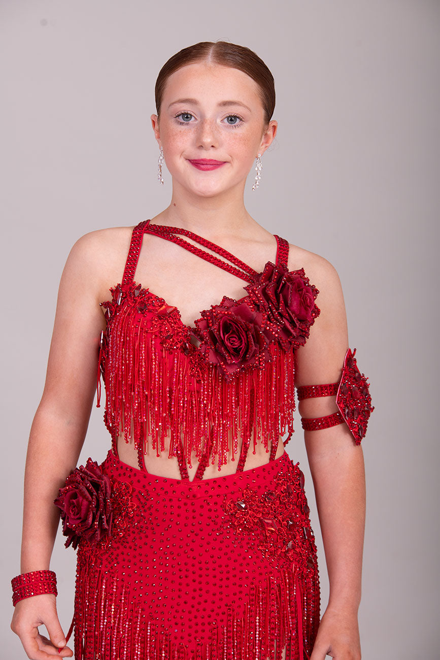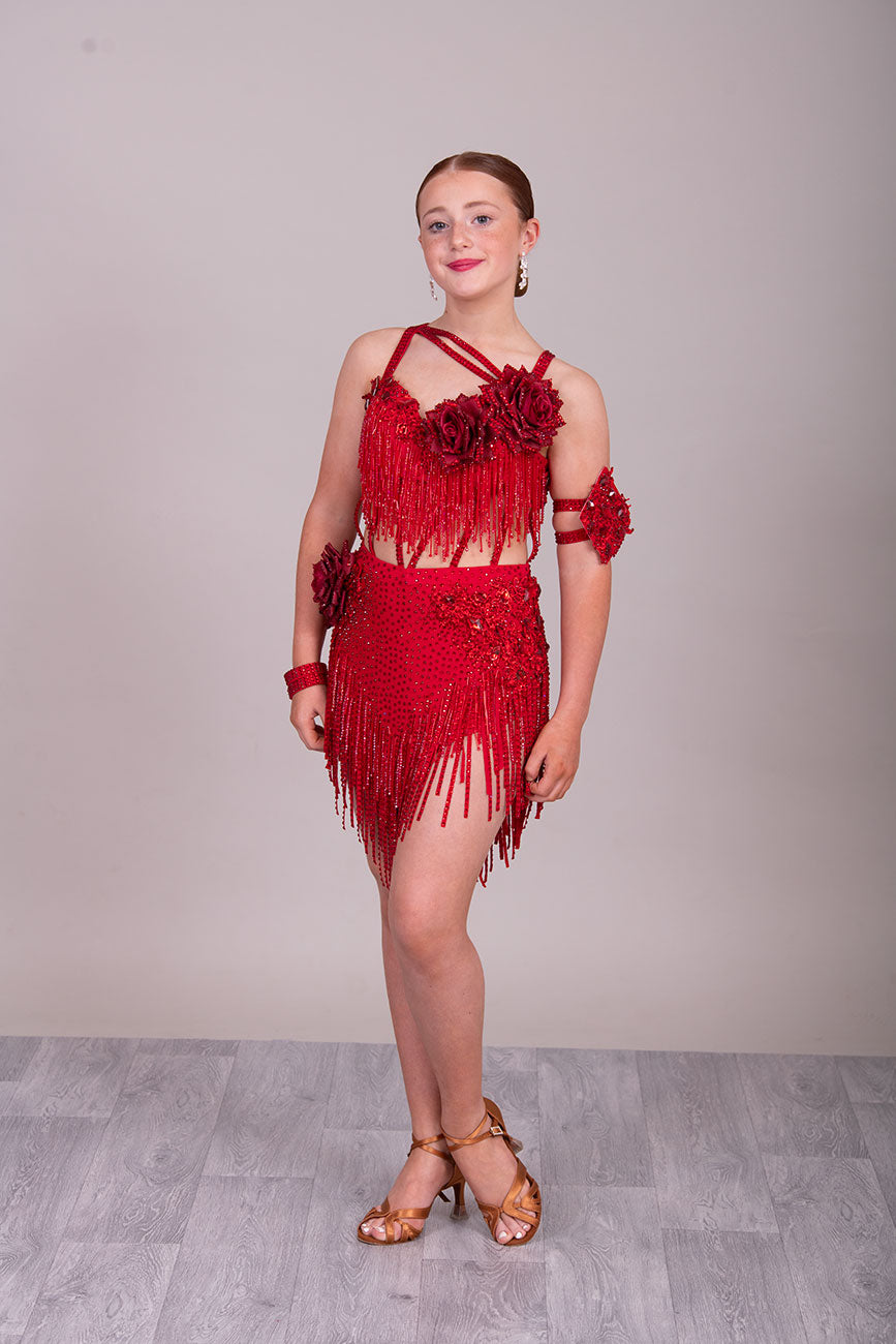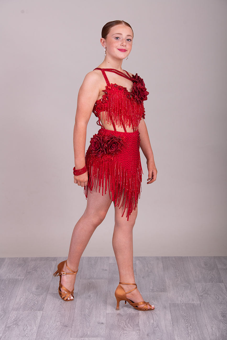 (BUDGET)13 Deep Red Competition Latin Dance Dress. Full of Red stoned fabric tassels & stoned motifs on the Bra style top. Heavily stoned flowers & strap detailing finish the top off. Skirt has flower to the Hip with stoned motifs and fabric strips over.