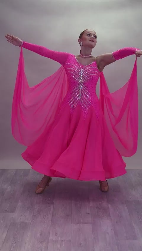 41B TWD PETITE Bright Pink Competition Ballroom/Sequence Dress Cold Shoulder to one side. Heavily Stoned in AB & Pink. ❤️Showroom Appointments Available❤️