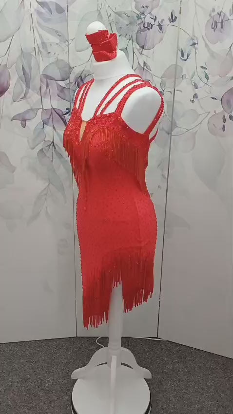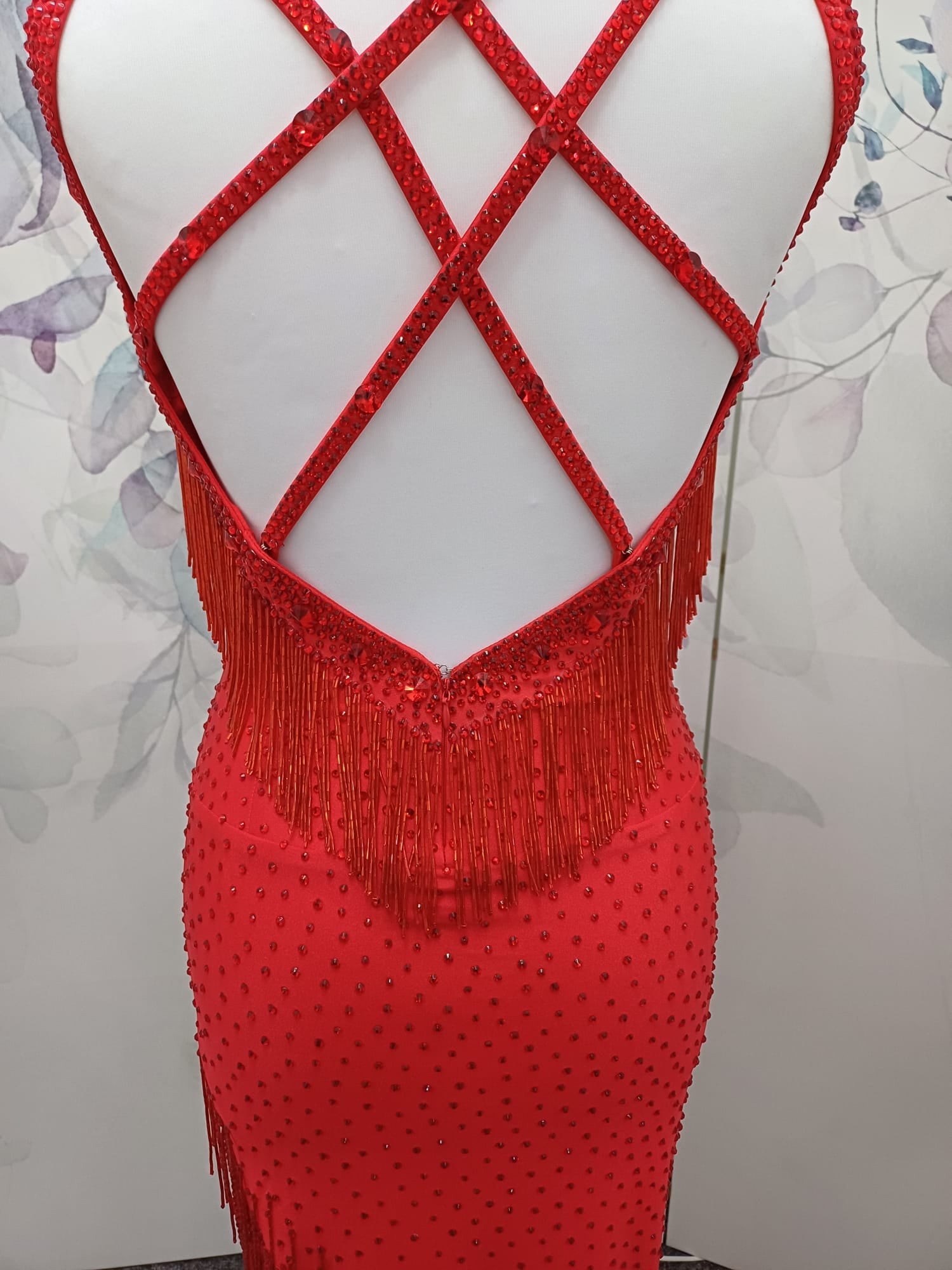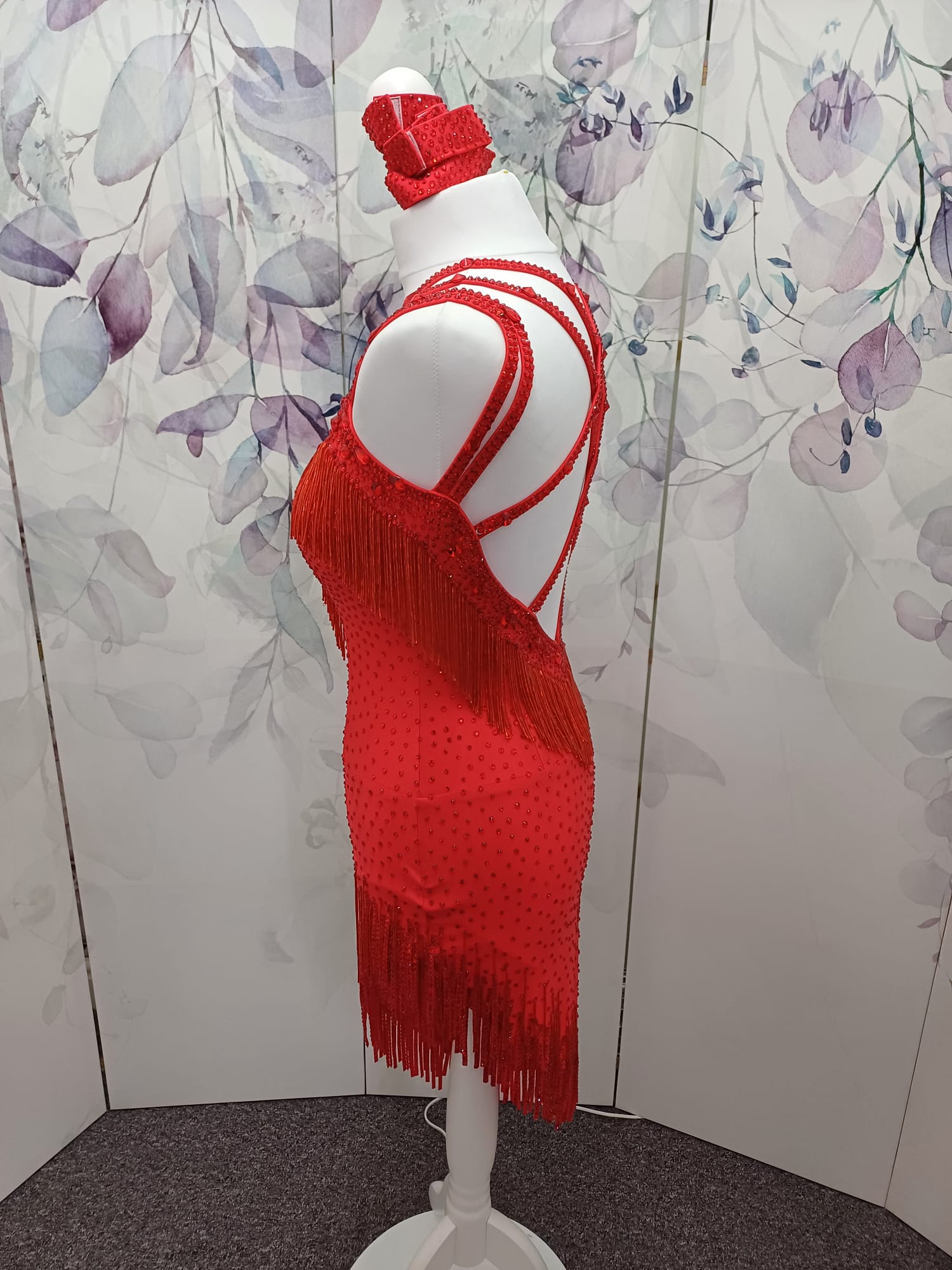 41L Red Latin Competition Dance Dress. Stoned in light Siam with strapping feature to the back & front. Bead droppers added to the hem for movement & upper chest.
