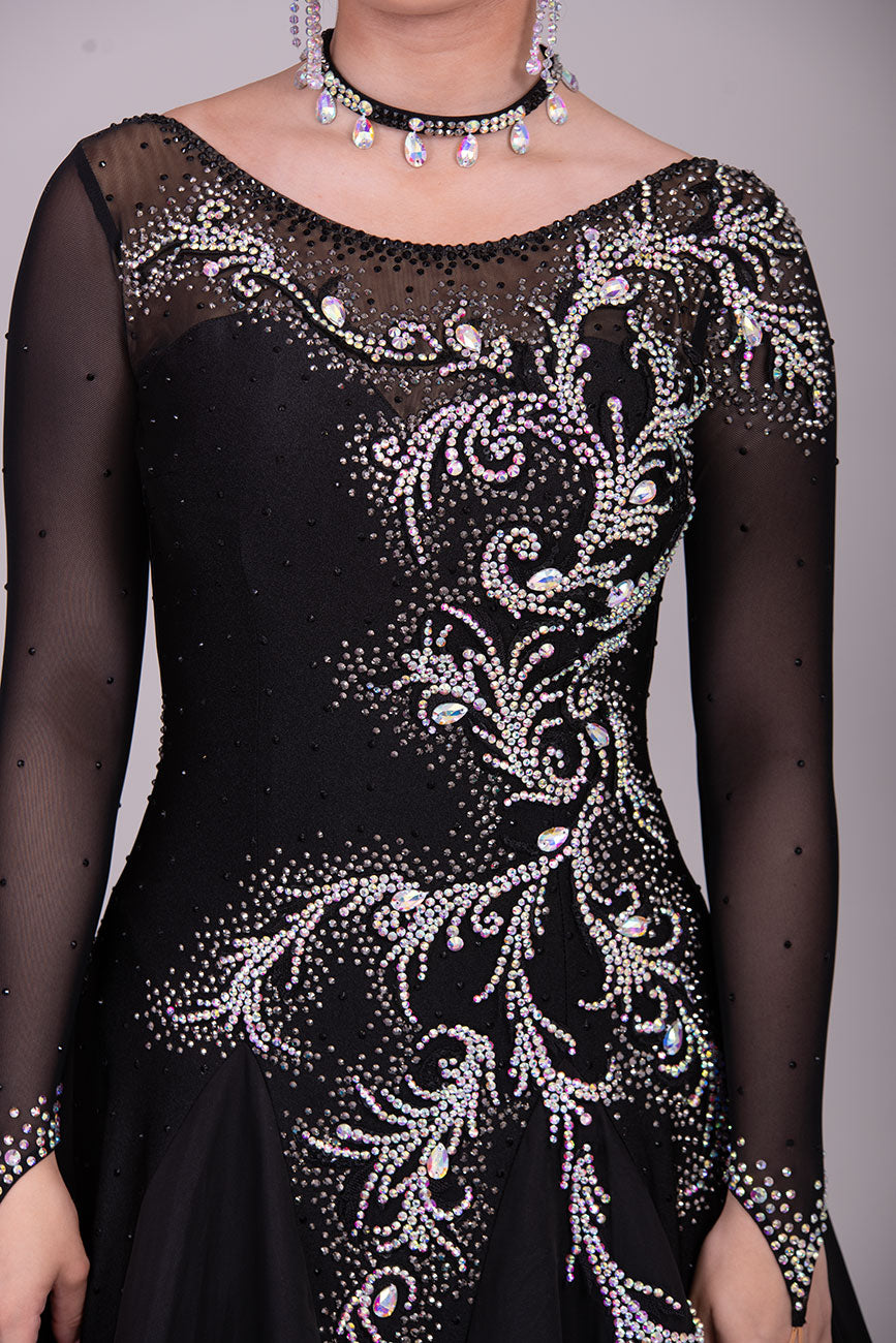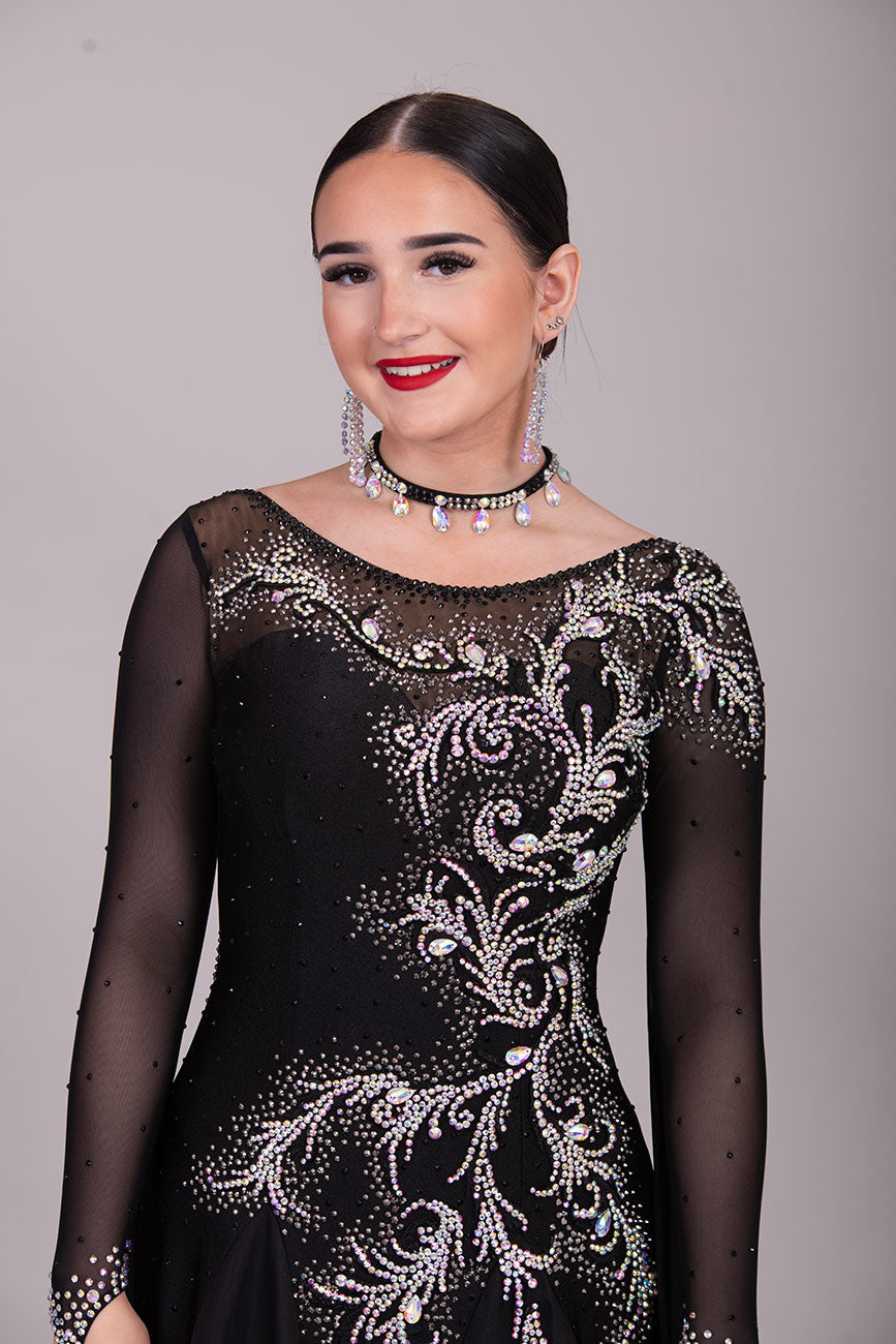 42B TWD PETITE Black Competition Ballroom/Sequence Dress. Striking Motif & Stone Design all over. Heavily Stoned in AB & jet❤️Showroom Appointments Available❤️
