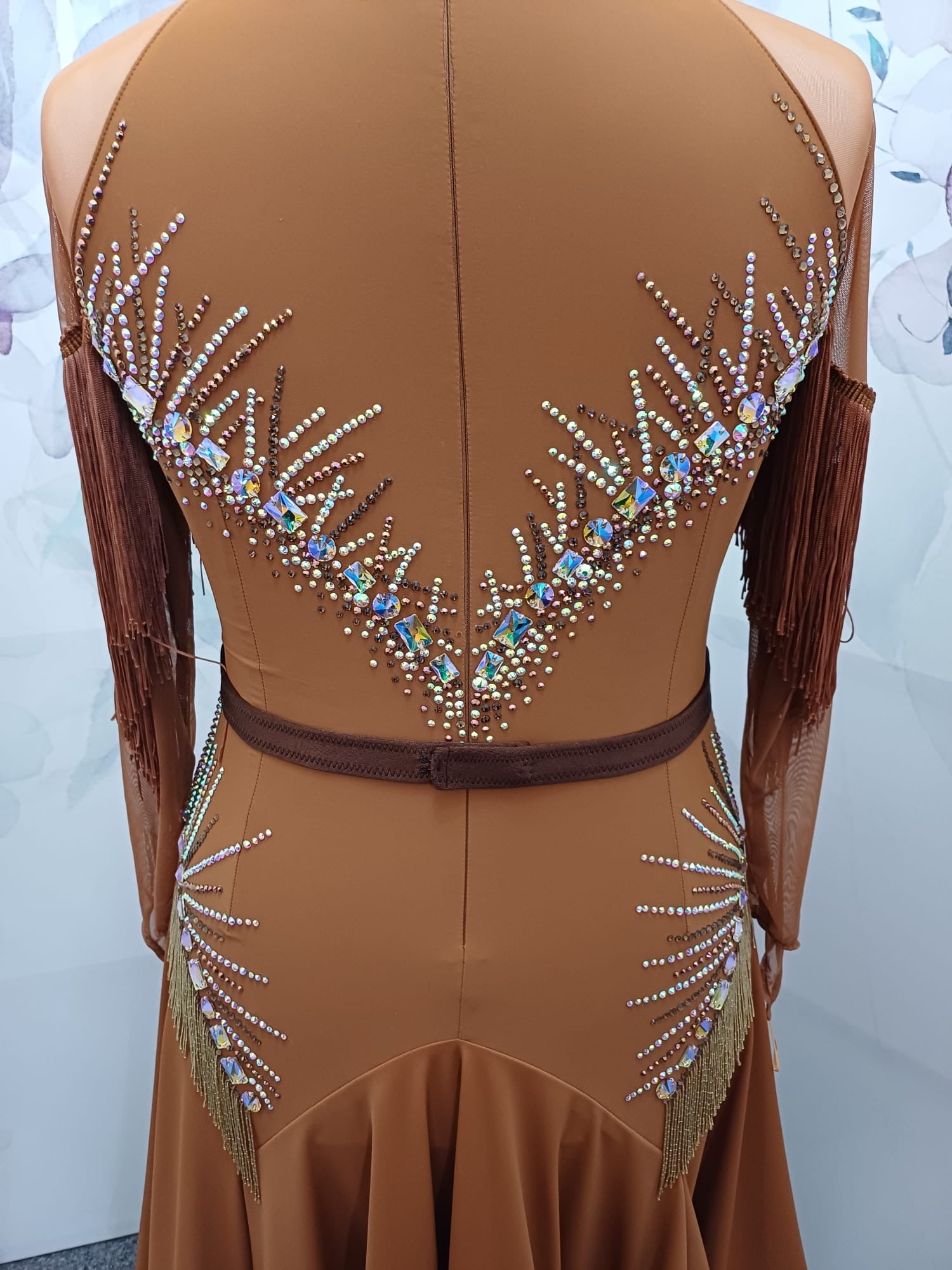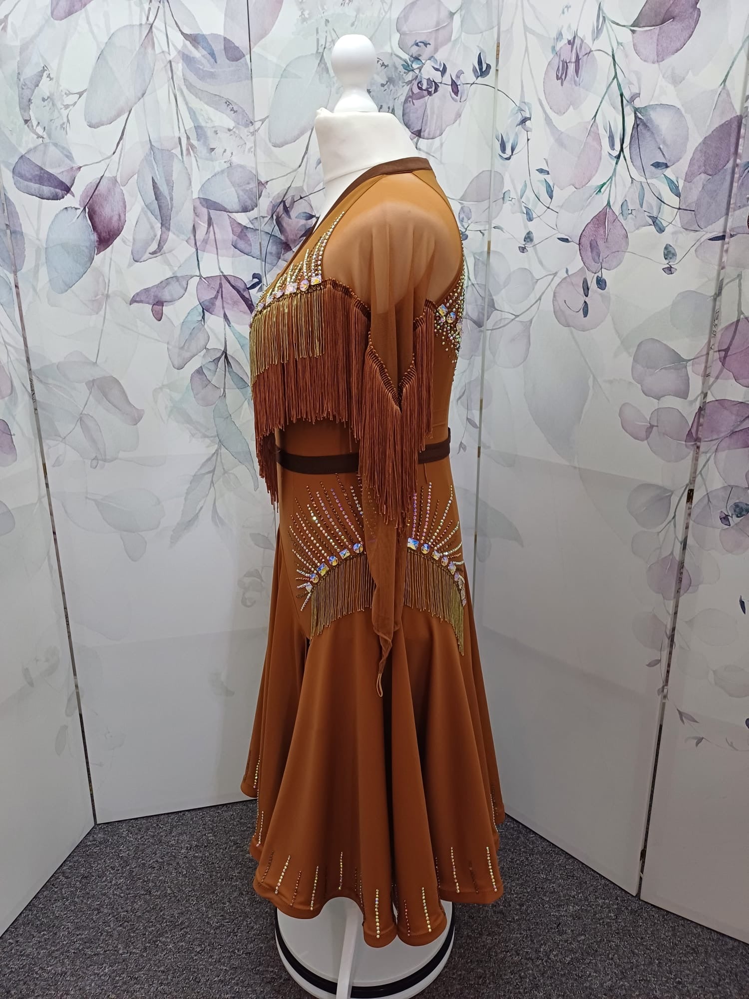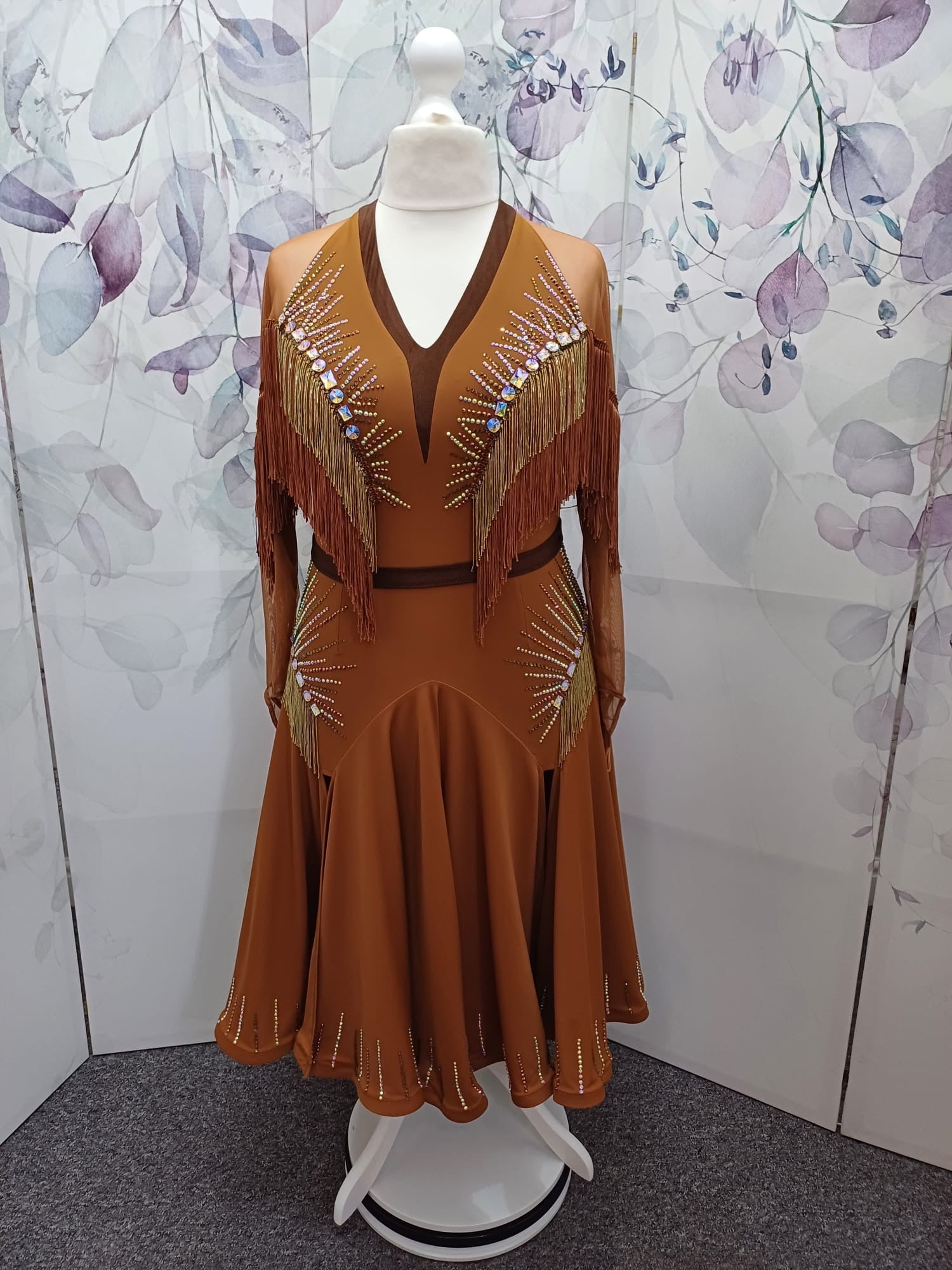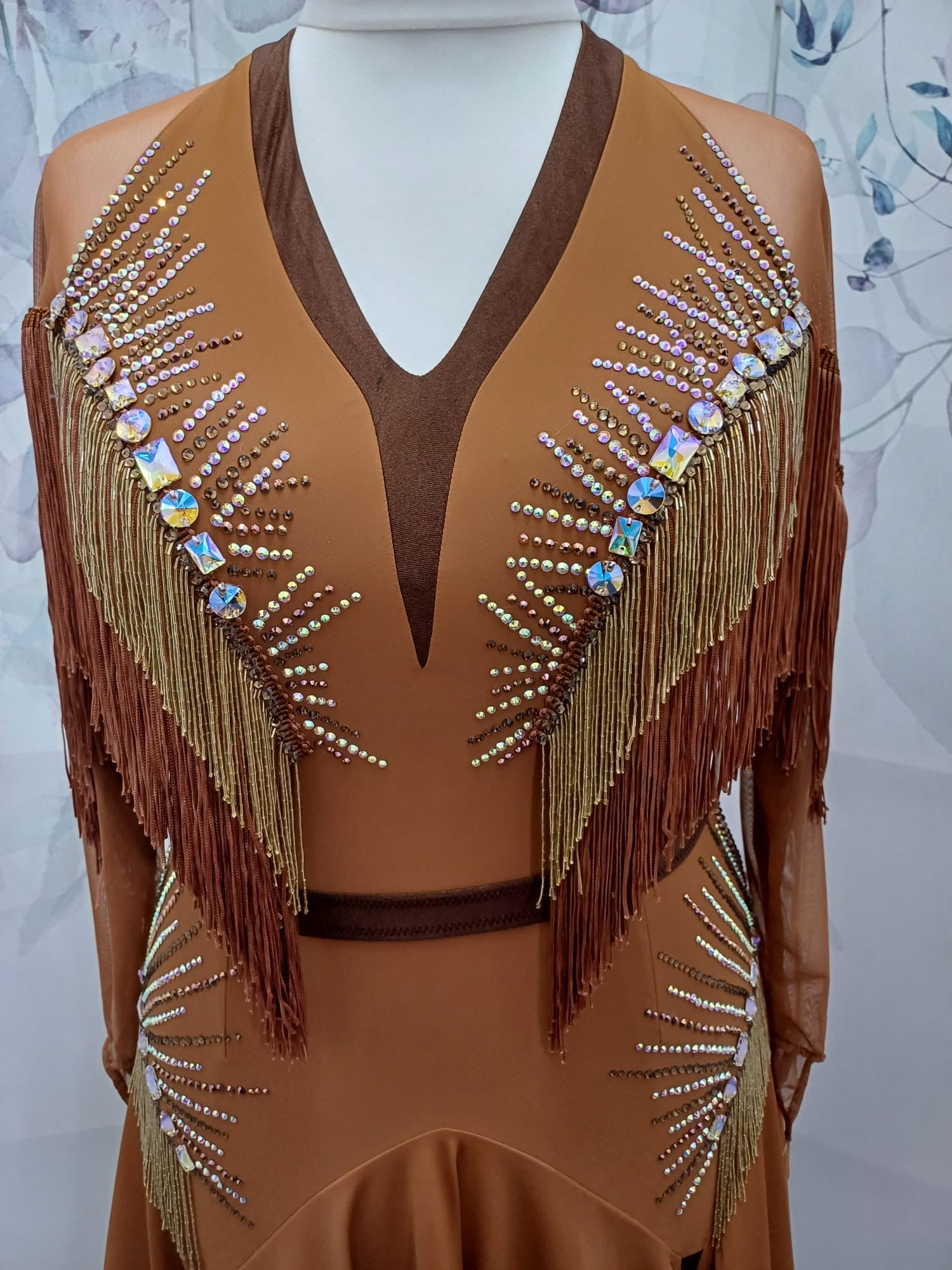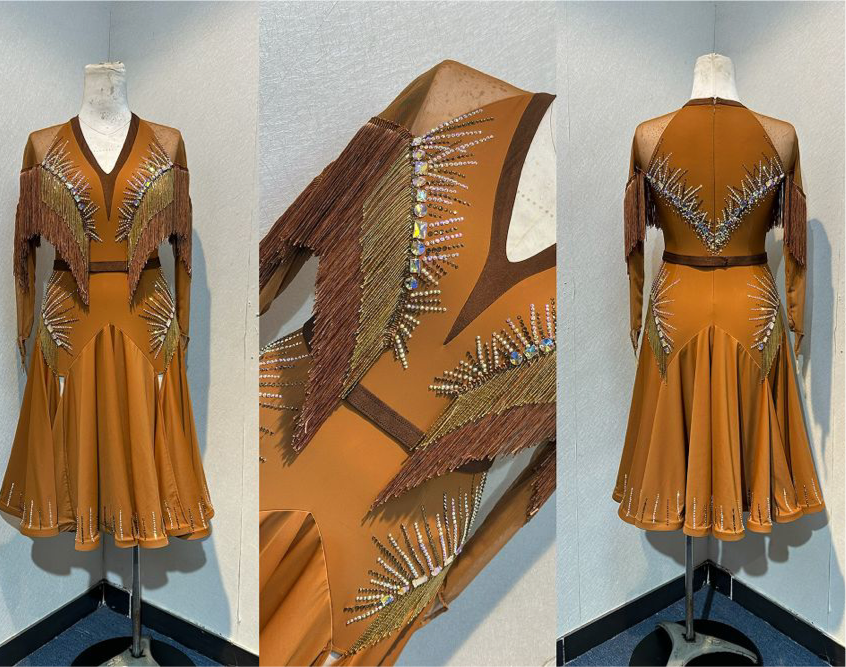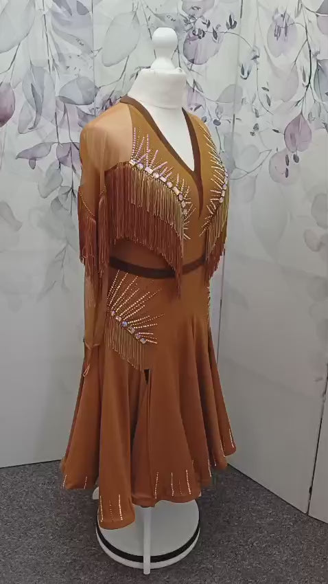 43L Classy Tan & Gold with Chocolate accents Competition Latin Dance dress .Stoned in Chocolate & AB. High back with mesh on Lycra detail giving option to wear own bra. ❤️Showroom Appointments Available❤️