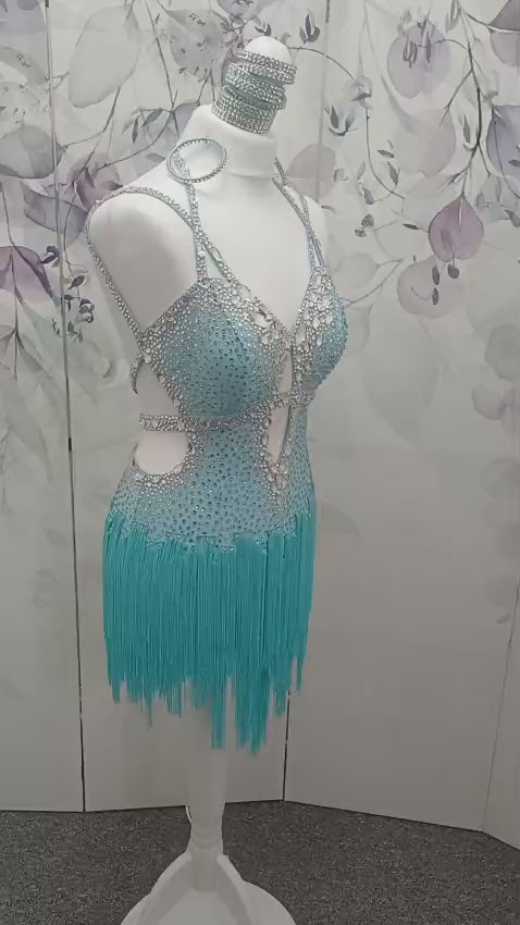 47L Paradise Blue Competition Latin Dance Dress. Beautiful detailing throughout with open design & strap details to the front. Comes with 8 bangles & matching Earrings. ❤️Showroom Appointments Available❤️