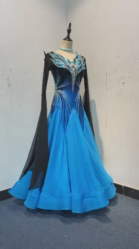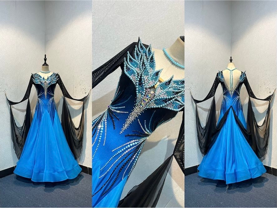 47B TWD ELITE Stunning Black & Blue Ombre Competition Ballroom/Sequence Dance Dress. Decorated with Pearls, AB, Jet & Aquamarine stones. Pearl necklace with hanging pearl strings. ❤️Showroom Appointments Available❤️