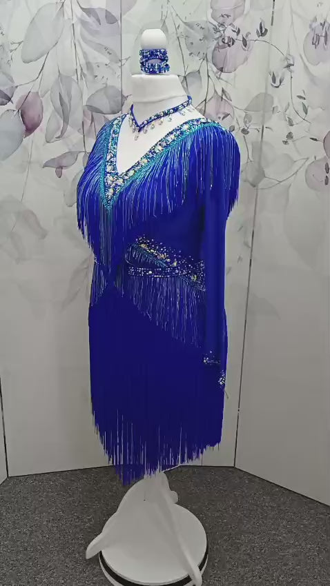 53L Cobalt Blue Competition Latin Dance Dress. Very full fringed skirts with bead droppers to the upper chest & Hip in a contrasting turquoise blue. Heavily stoned in Sapphire & Light Sapphire. ❤️Showroom Appointments Available❤️