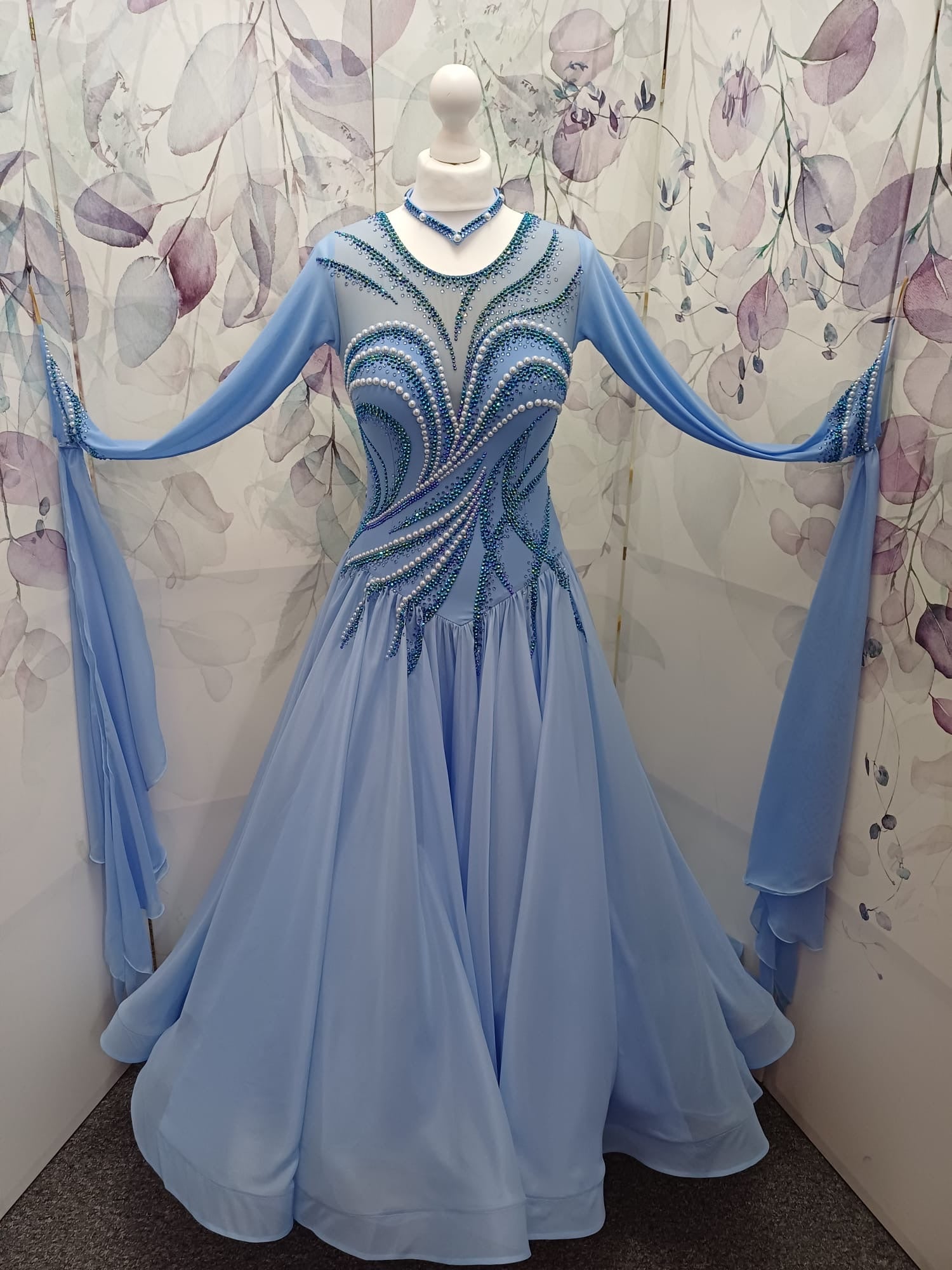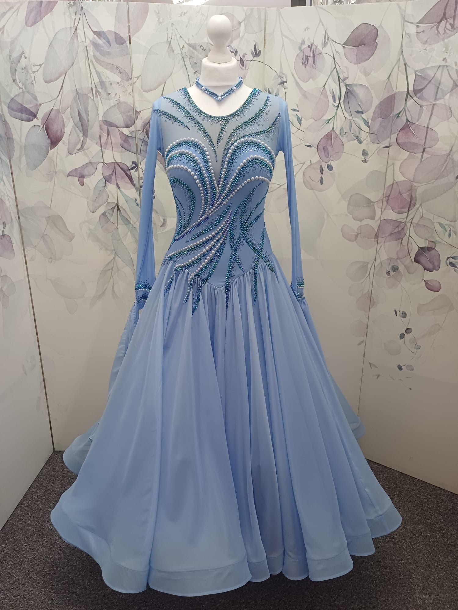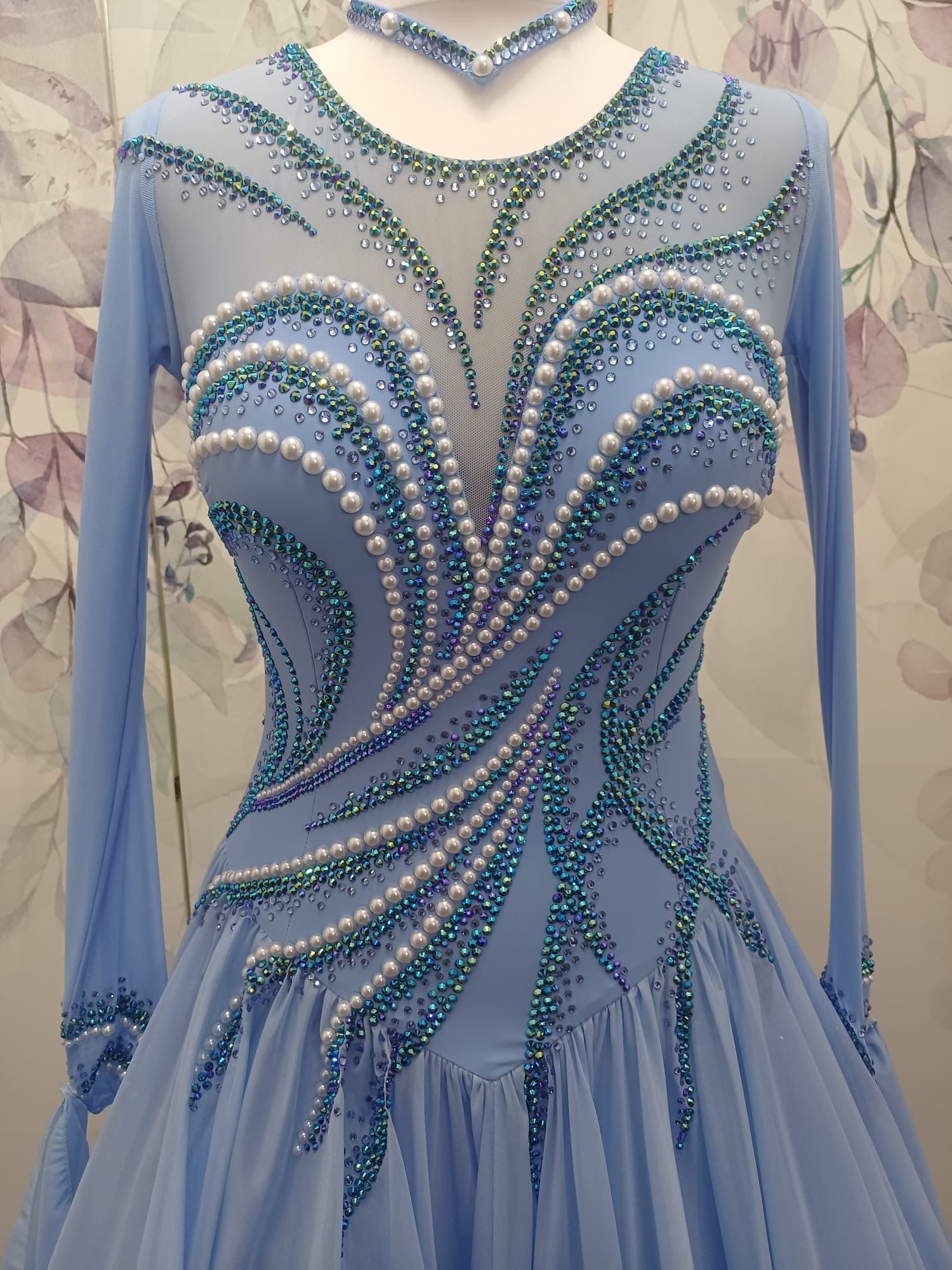 60B TWD ELITE Sky Blue Competition Ballroom/Sequence Dance Dress. New Fuller skirts & Underskirts. Beautiful patterning in Light Sapphire, AB & Light Sapphire AB with White Pearls. Narrow keyhole back. Detachable floats.❤️Showroom Appointments Available❤️
