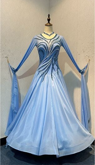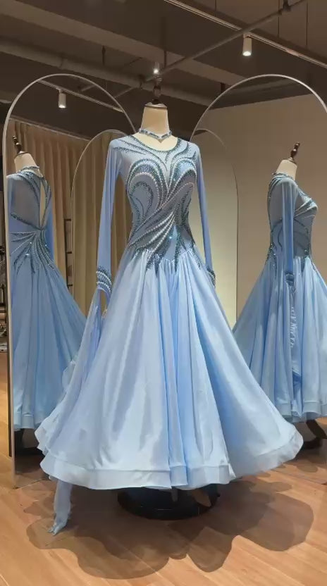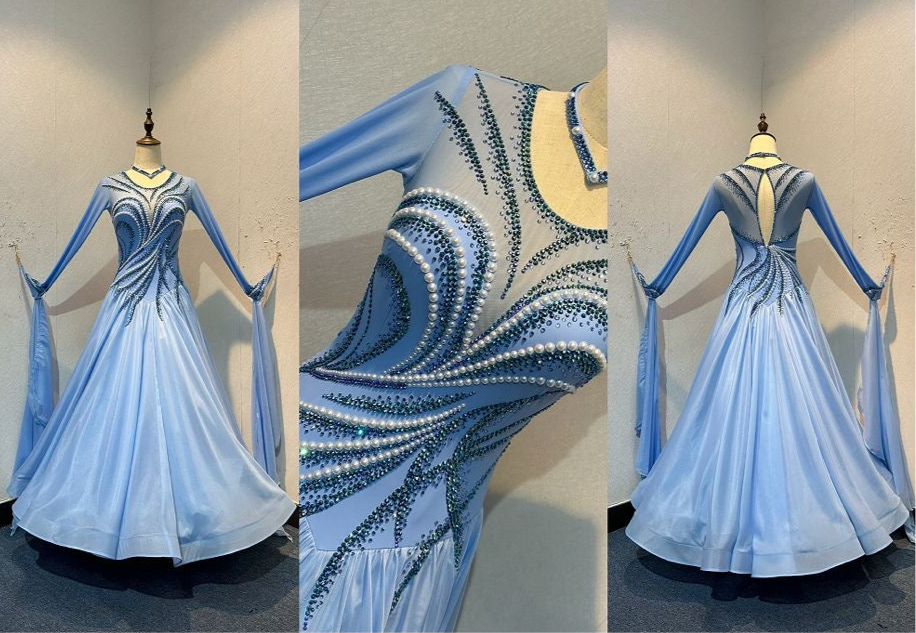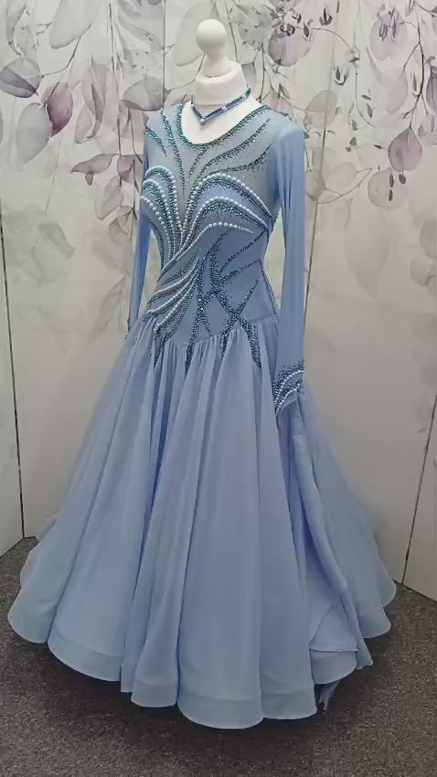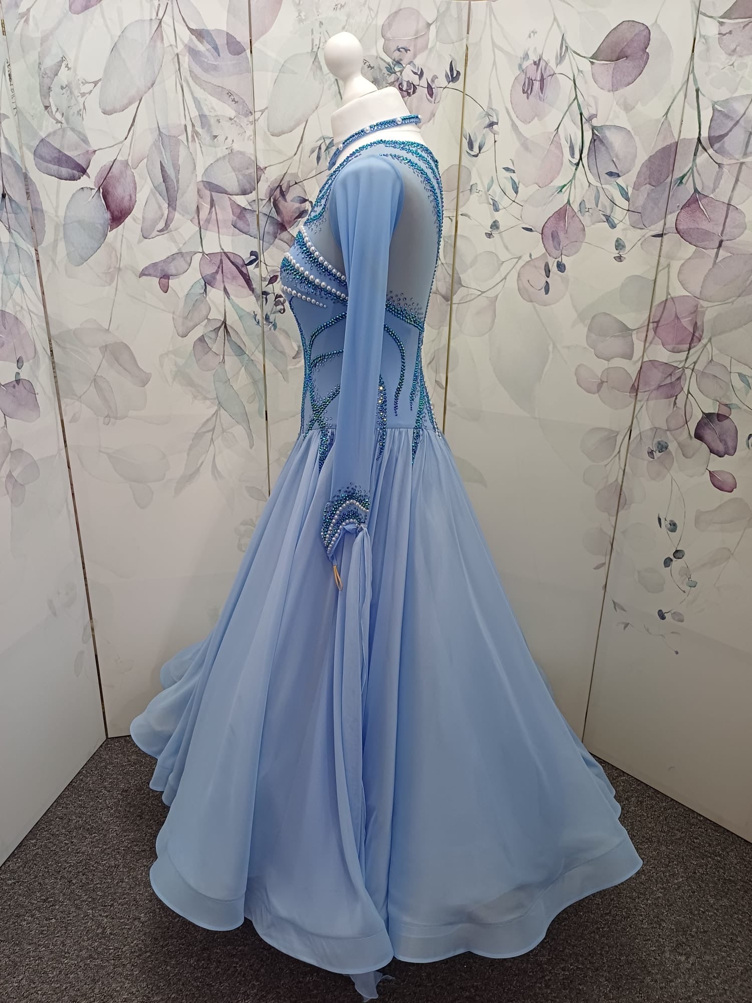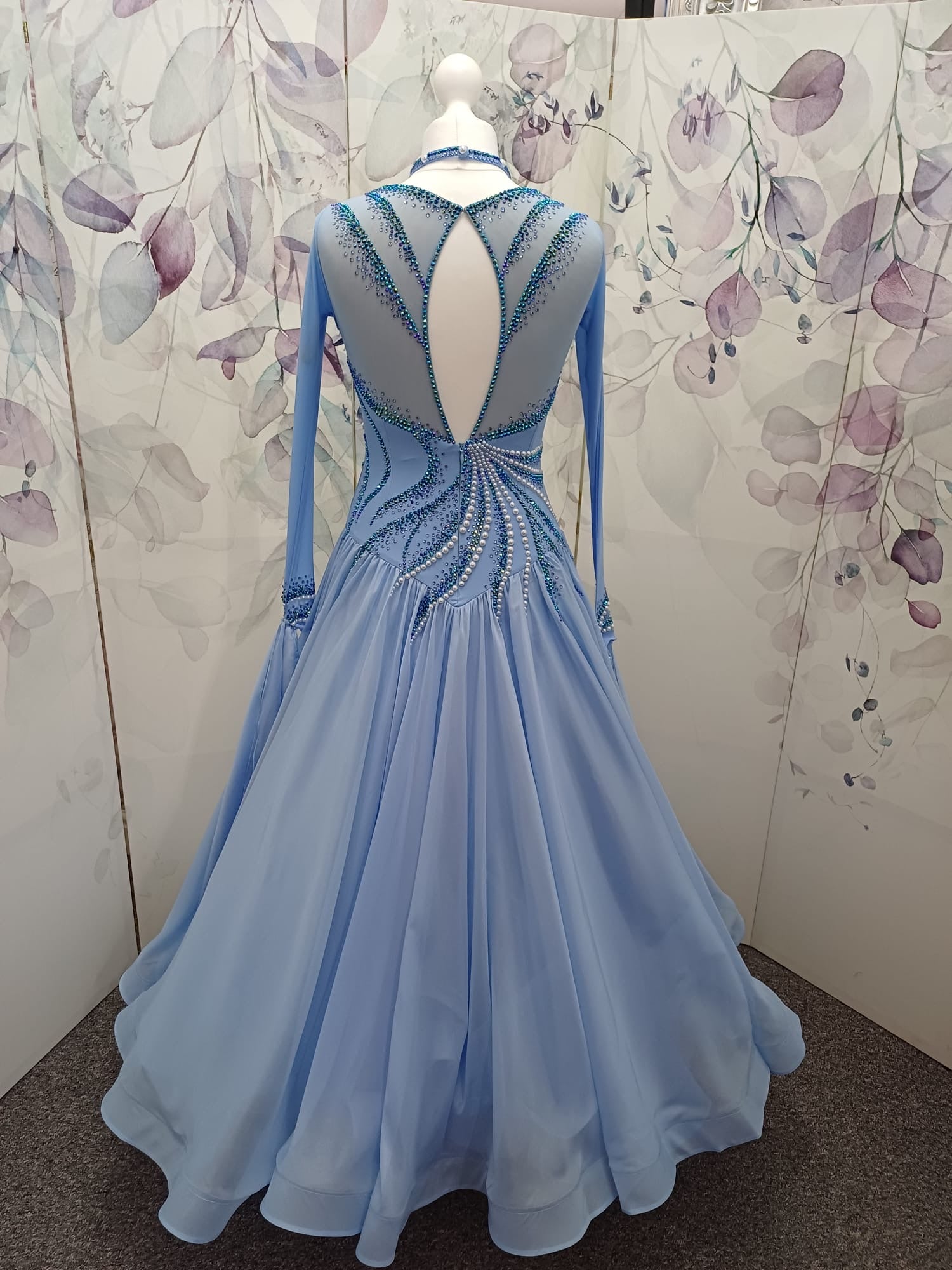 60B TWD ELITE Sky Blue Competition Ballroom/Sequence Dance Dress. New Fuller skirts & Underskirts. Beautiful patterning in Light Sapphire, AB & Light Sapphire AB with White Pearls. Narrow keyhole back. Detachable floats.❤️Showroom Appointments Available❤️