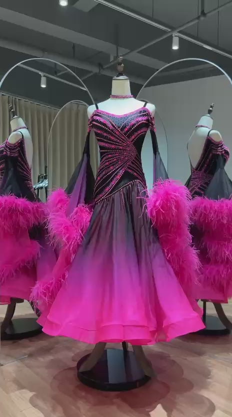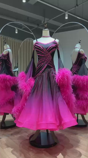 61B TWD ELITE Flo Pink & Black striking Competition Ballroom/Sequence dance dress. Ombré Pink & Black skirts with Flo pink ostrich feather trim bell sleeves. ❤️Showroom Appointments Available❤️